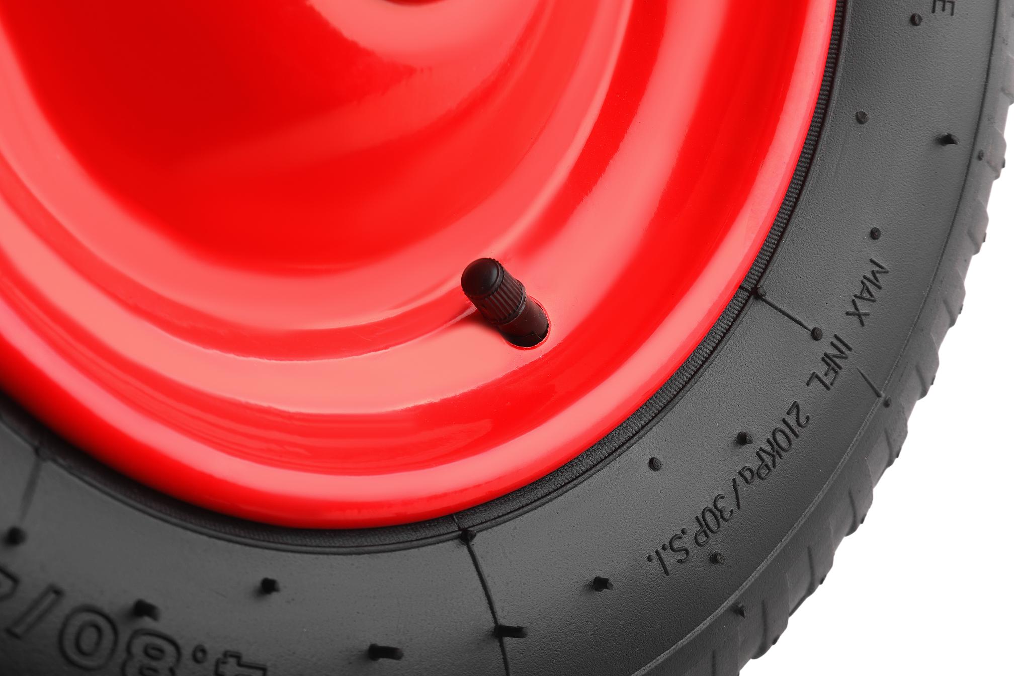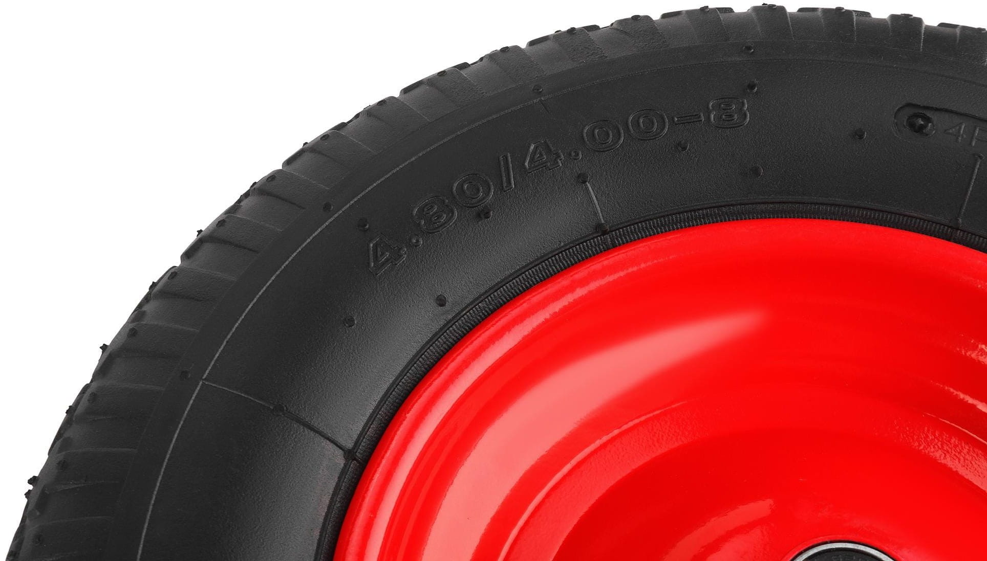 Oznaczenie 4.80/4.00-8 to standardowy rozmiar opon do taczek — pierwsza cyfra to szerokość opony w calach, druga to rozmiar obręczy (8"). Koło o średnicy 39 cm zapewnia odpowiedni prześwit nad podłożem i stabilność przy przetaczaniu ładunku.