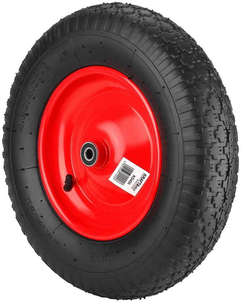 Koło zamienne do taczek w rozmiarze 4.80/4.00-8 (16 cali / 39 cm średnicy) z łożyskiem tocznym i ośką o średnicy 12 mm. Wymiary ośki są zgodne ze standardami stosowanymi w większości taczek budowlanych i ogrodowych dostępnych na rynku.