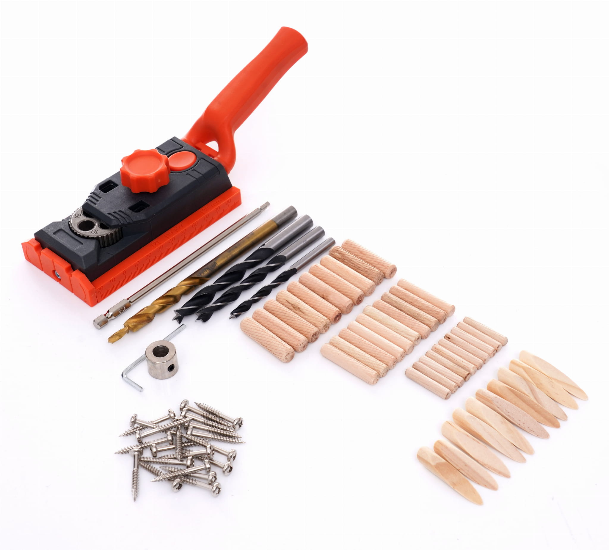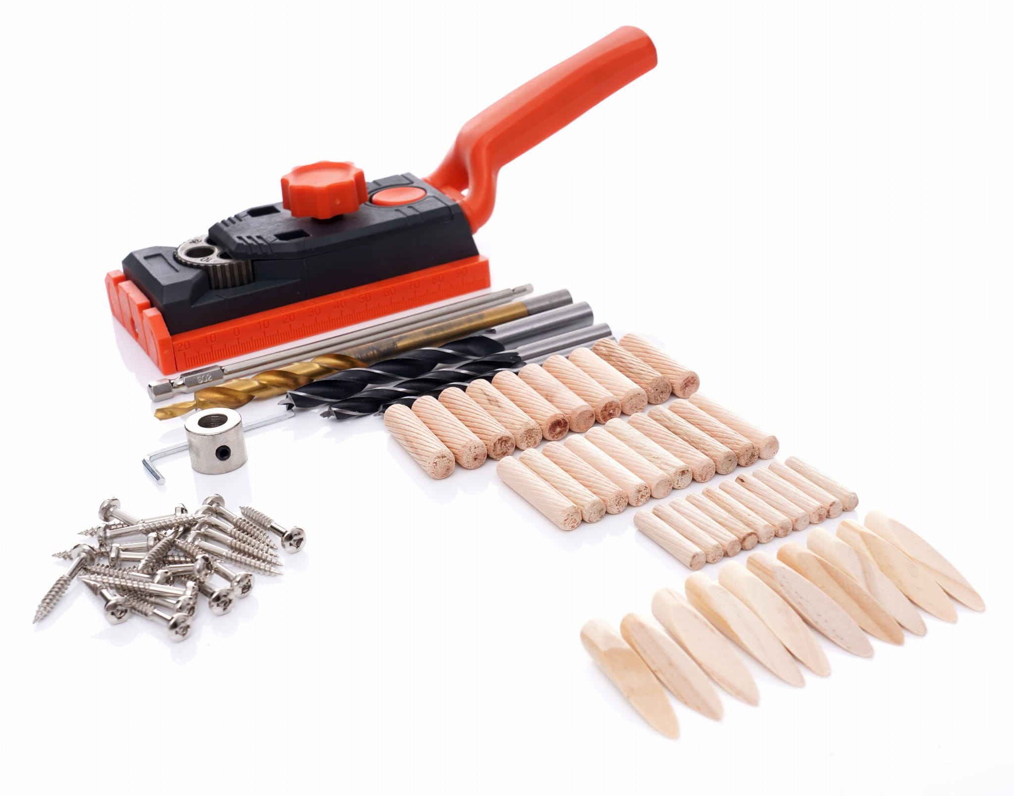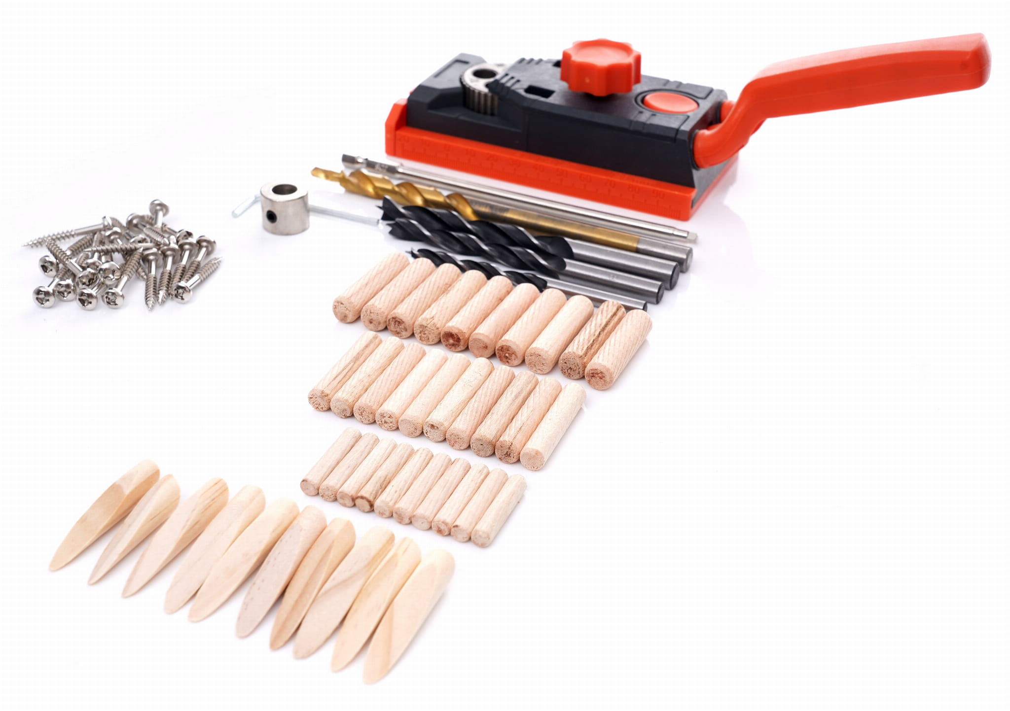 Przyrząd do wykonywania otworów pod kołki drewniane w połączeniach narożnikowych typu E i L. Umożliwia jednoczesne nawiercanie obu łączonych elementów, co eliminuje błędy wynikające z ręcznego przenoszenia punktów wiercenia. Przeznaczony do drewna litego i płyt wiórowych o grubości od 12 do 38 mm.