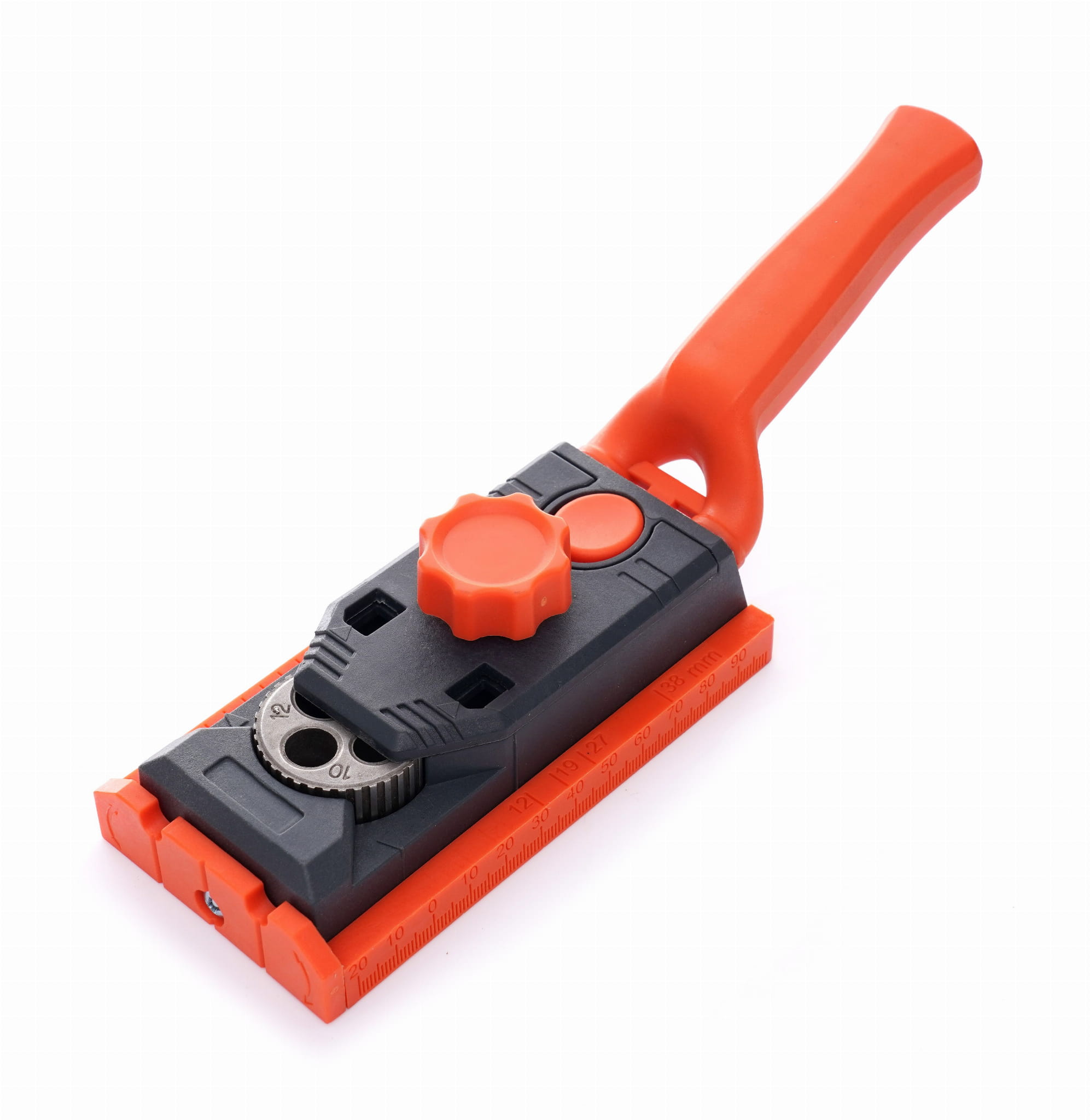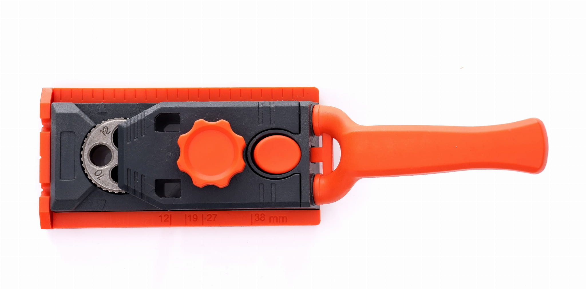 Przyrząd dostosowany jest do płyt wiórowych i elementów drewnianych o grubości od 12 do 38 mm — typowy zakres dla mebli skrzyniowych, szafek kuchennych oraz elementów stolarki budowlanej.