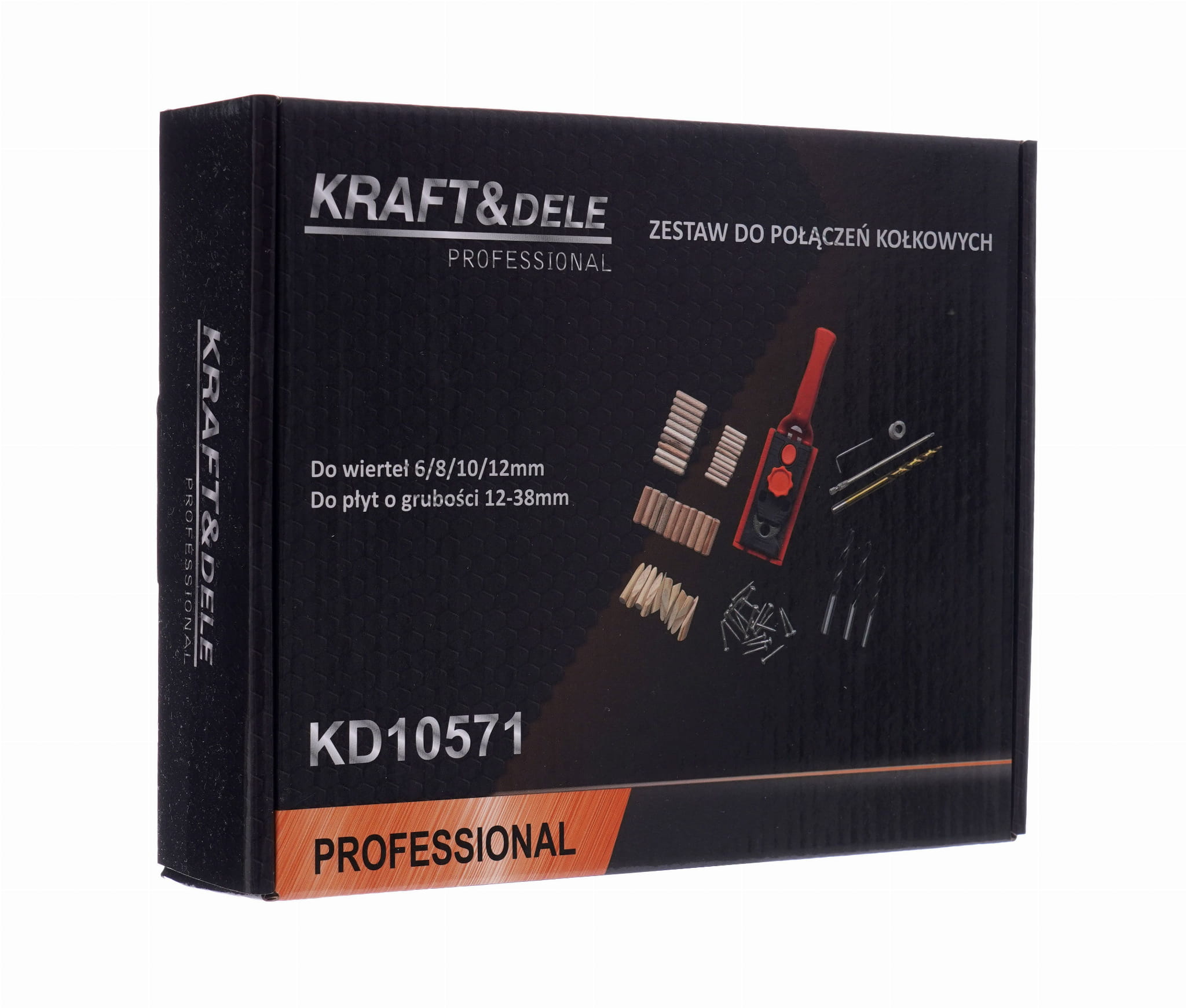 Zestaw obsługuje kołki o średnicach 6, 8, 10 i 12 mm. Dobór średnicy zależy od grubości łączonych elementów i wymaganej wytrzymałości złącza — cieńsze materiały wymagają mniejszych kołków, grubsze płyty dopuszczają użycie kołka 12 mm.