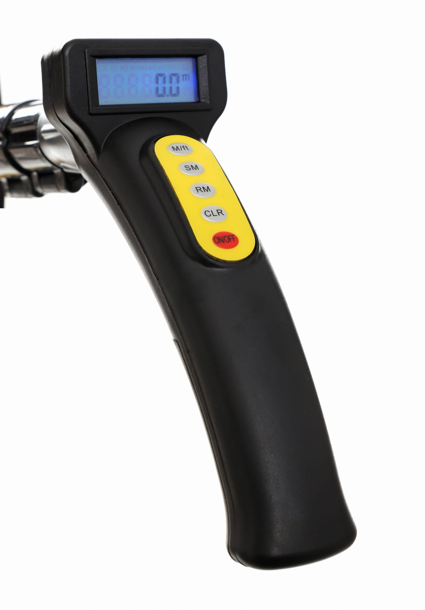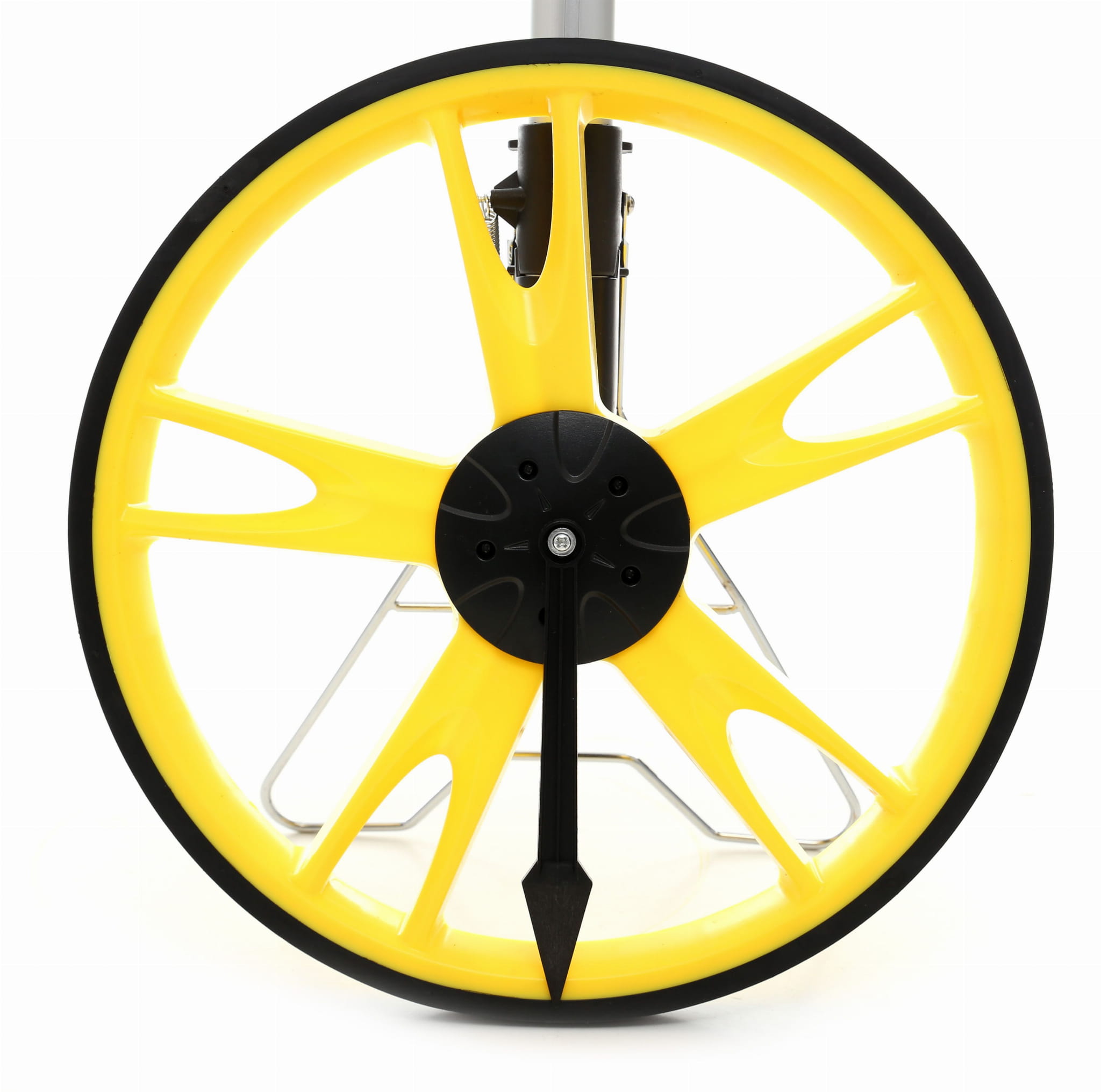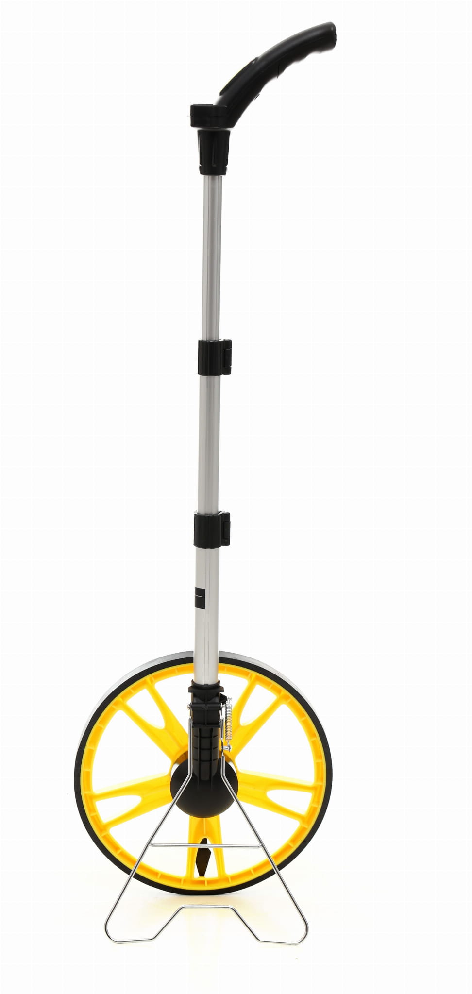 Mechaniczne koło miernicze z cyfrowym licznikiem przeznaczone do pomiaru długości na otwartym terenie. Pomiar realizowany jest przez toczenie koła po nawierzchni — każdy obrót odpowiada określonej odległości, którą urządzenie sumuje i wyświetla na liczniku. Obsługuje zarówno jednostki metryczne, jak i calowe.