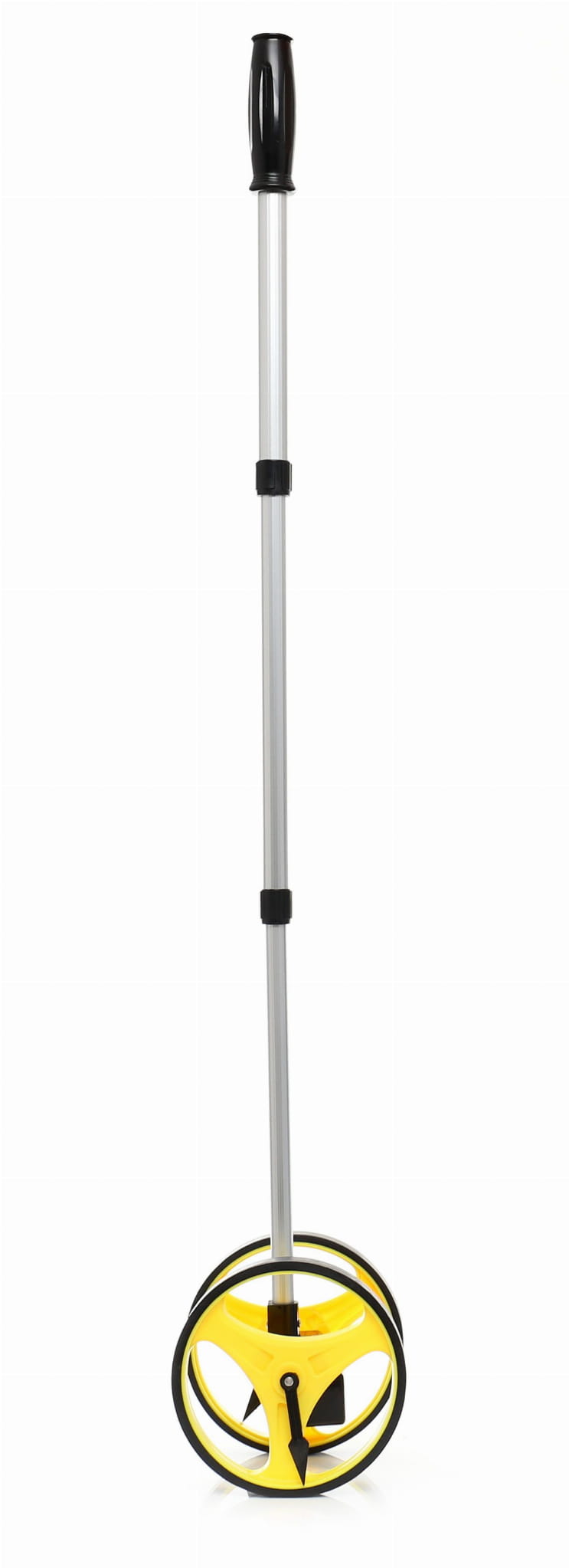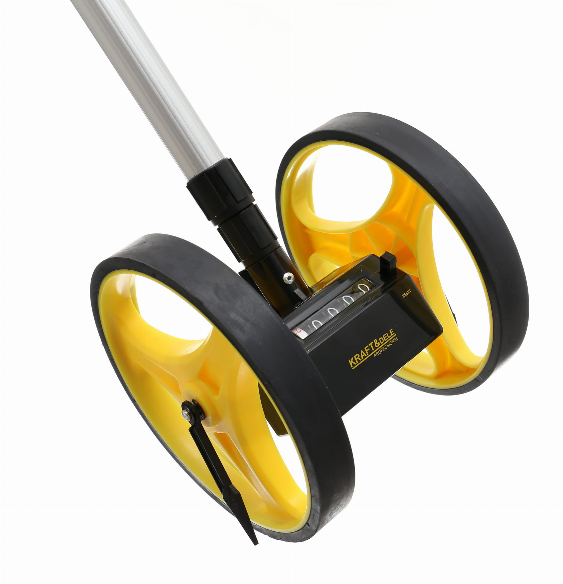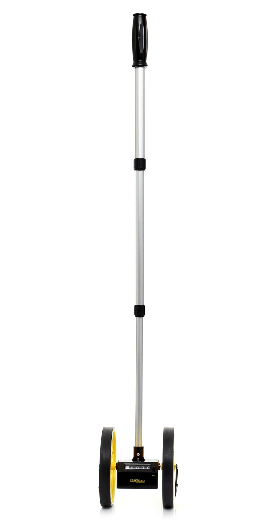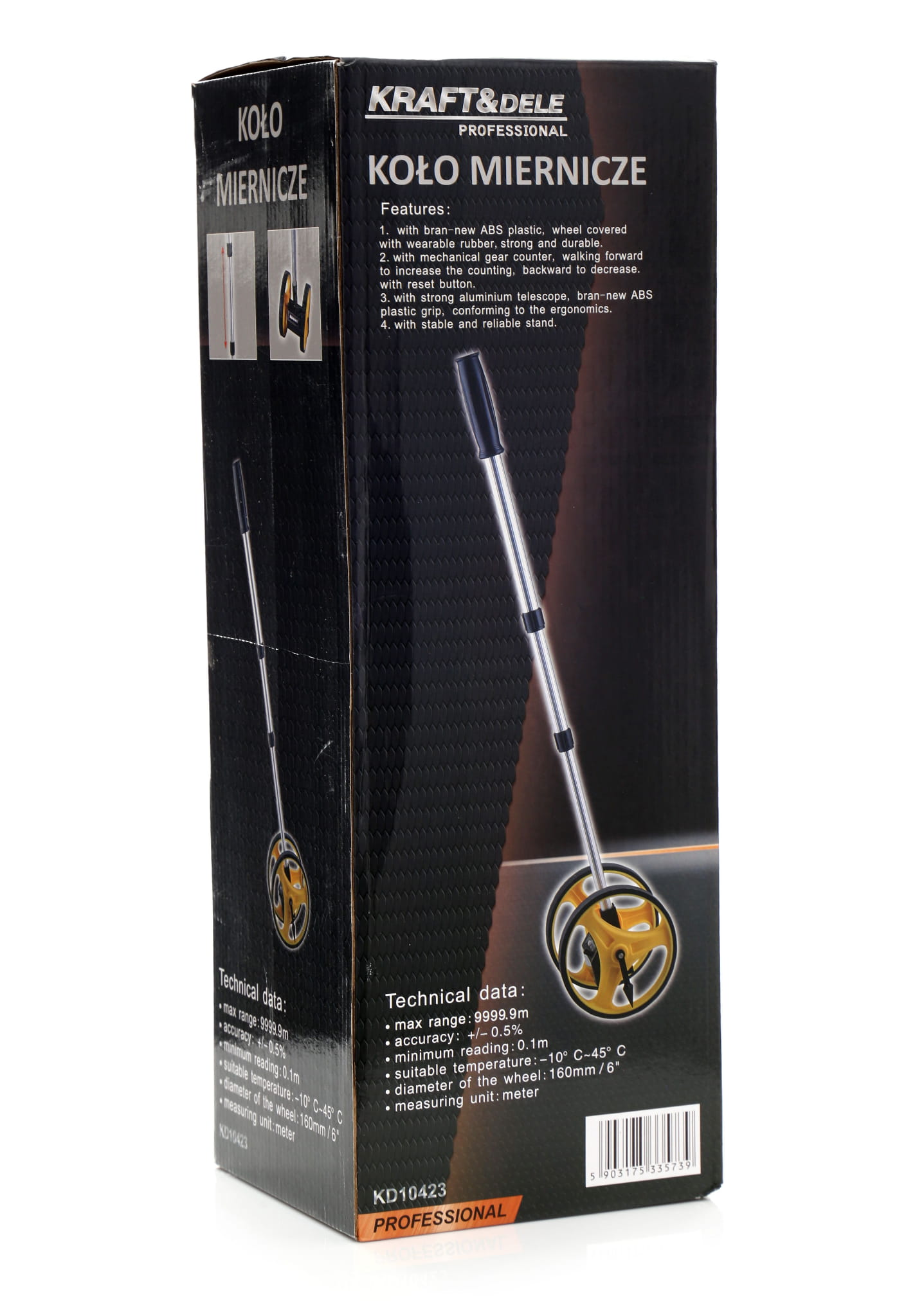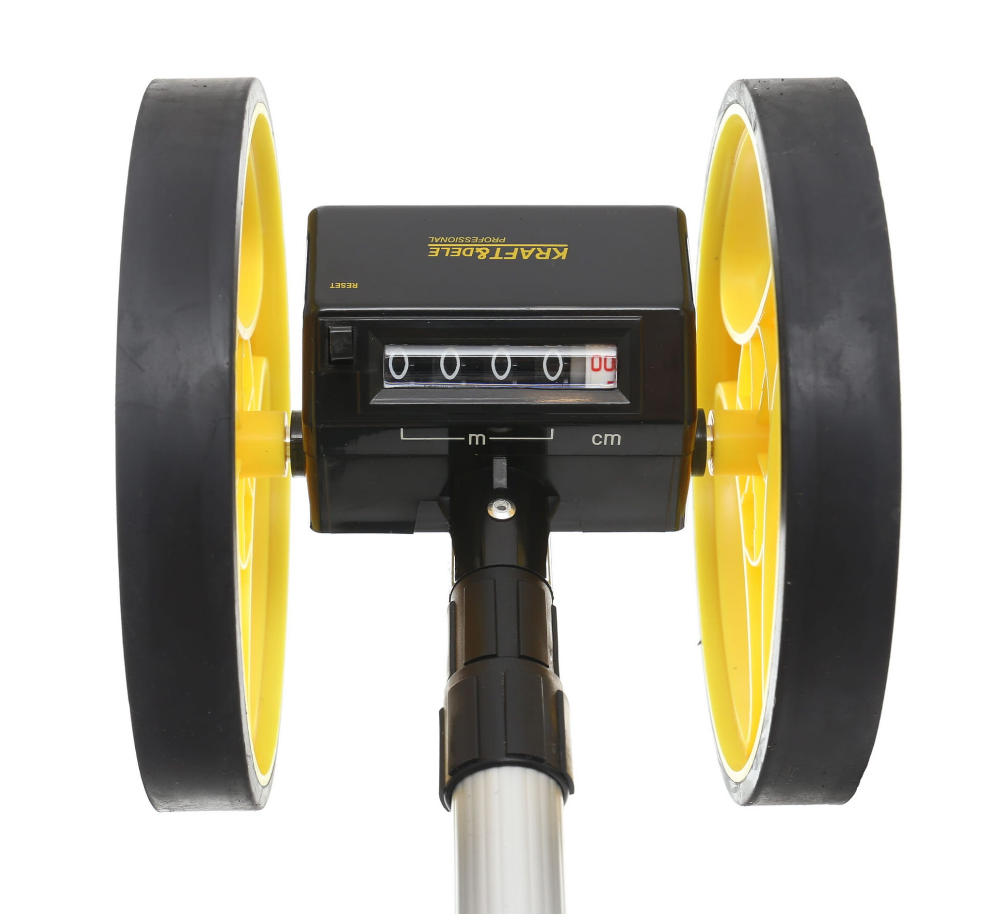 Mechaniczne koło miernicze przeznaczone do pomiaru odległości na otwartym terenie. Zasada działania opiera się na toczeniu koła po podłożu — każdy obrót przekłada się na określony przyrost odległości rejestrowany przez analogowy licznik pięciocyfrowy. Urządzenie nie wymaga zasilania ani kalibracji elektronicznej.