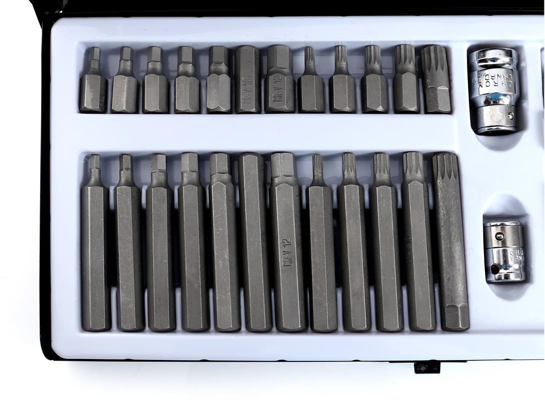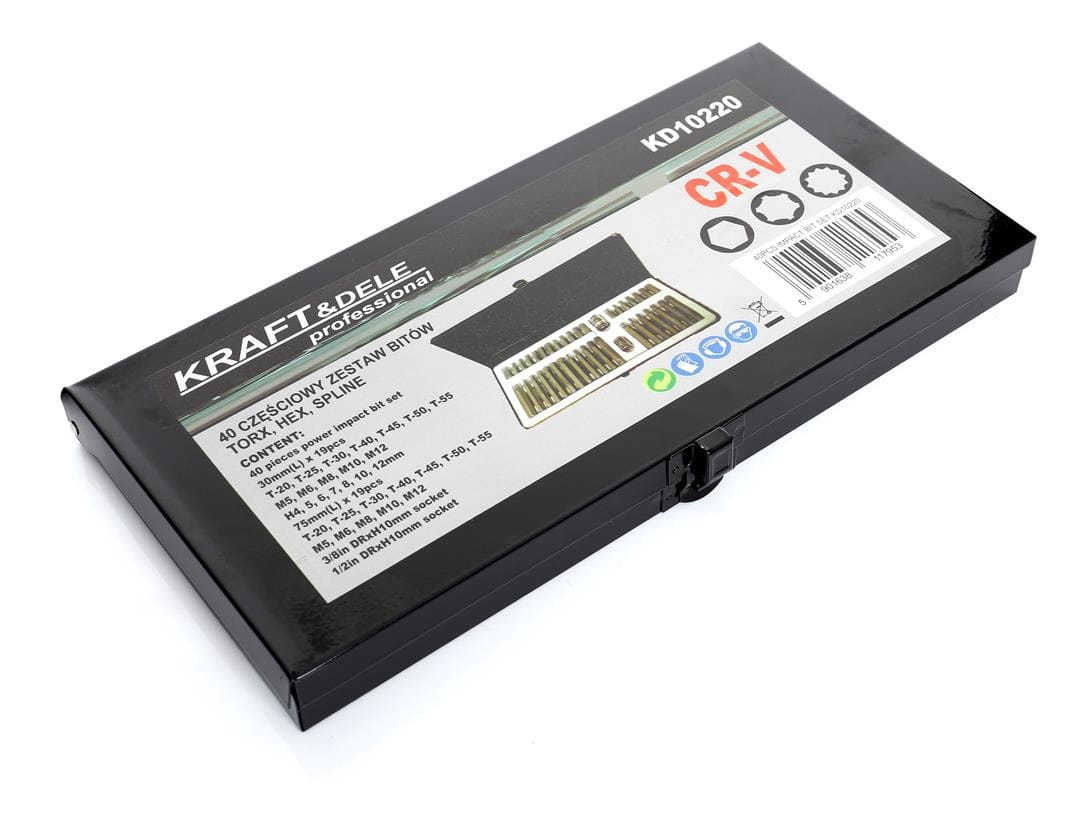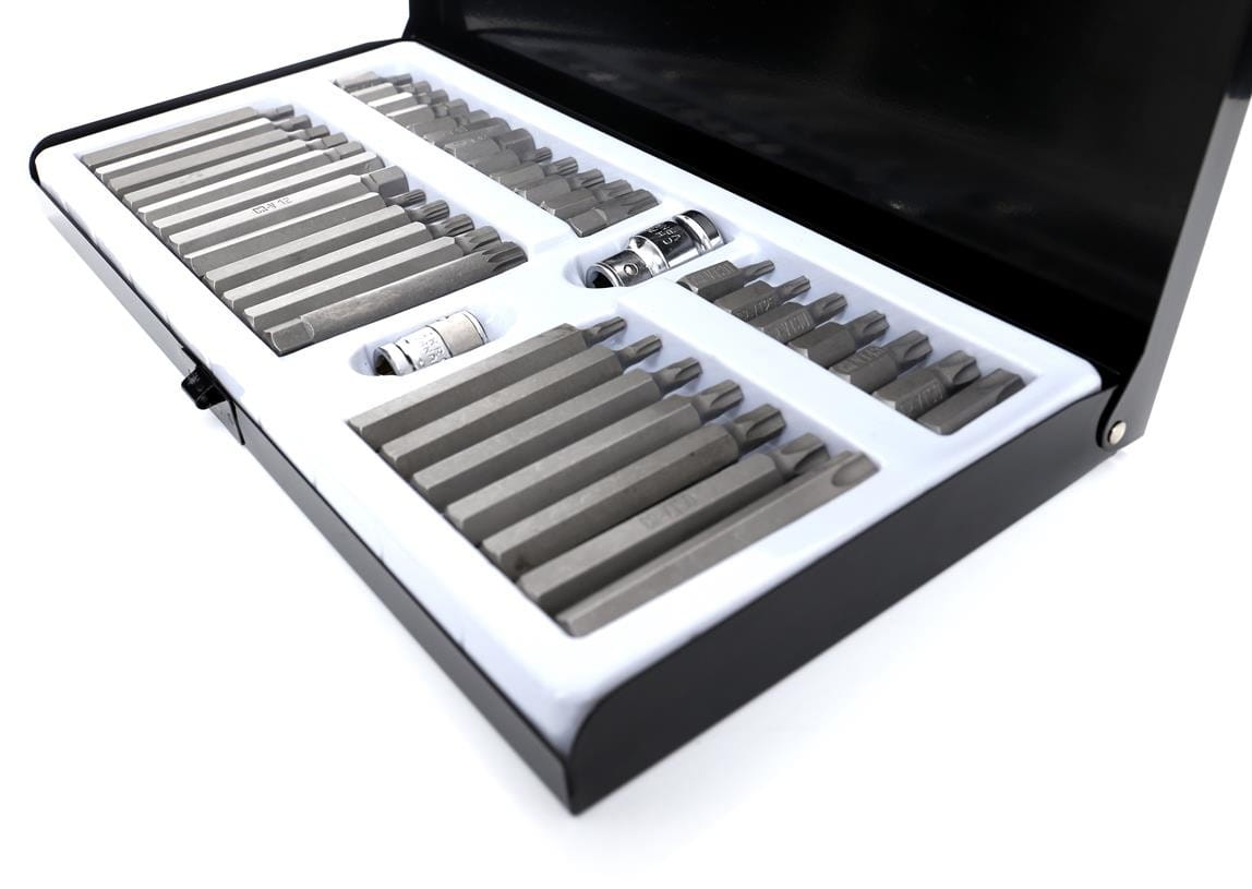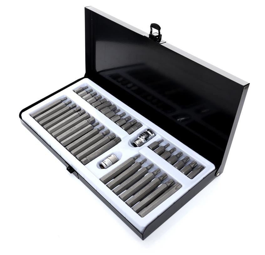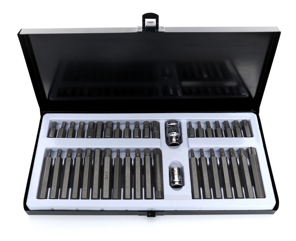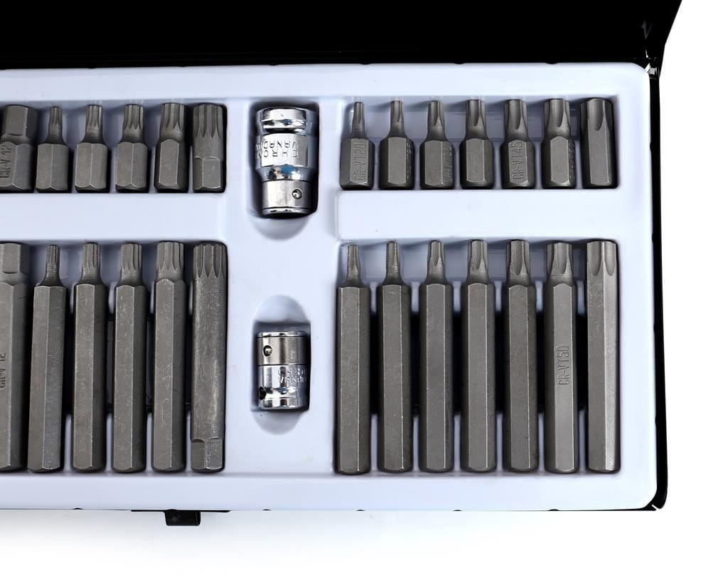 Zestaw 40 końcówek wkrętakowych obejmujący trzy typy profili: TORX, HEX (imbus) oraz SPLINE. Bity dostępne są w dwóch długościach — 30 mm i 75 mm — z sześciokątnym uchwytem 10 mm, kompatybilnym z grzechotkami 3/8" i 1/2". Zestaw przeznaczony do zastosowań warsztatowych i serwisowych, w tym mechaniki samochodowej i przemysłowej.