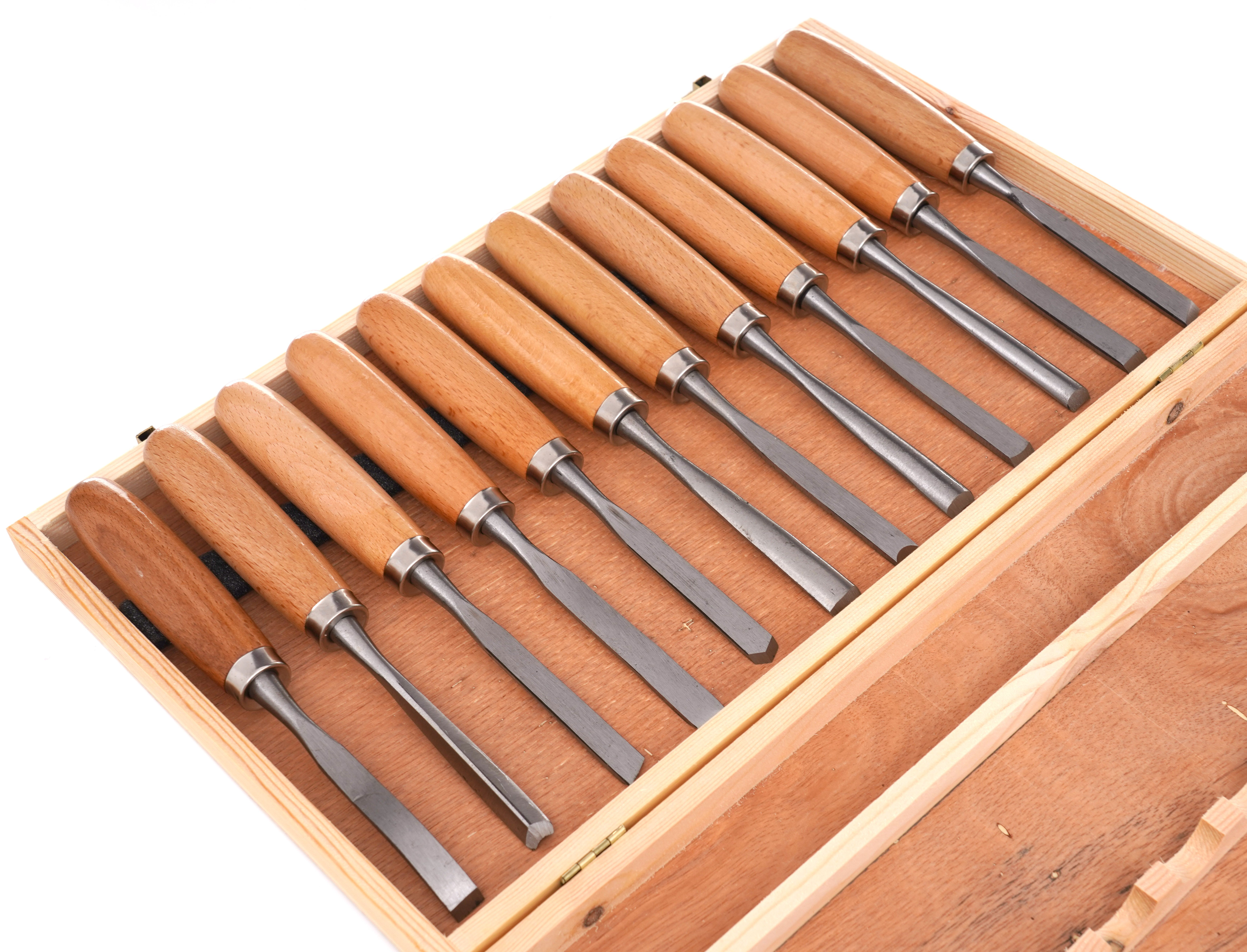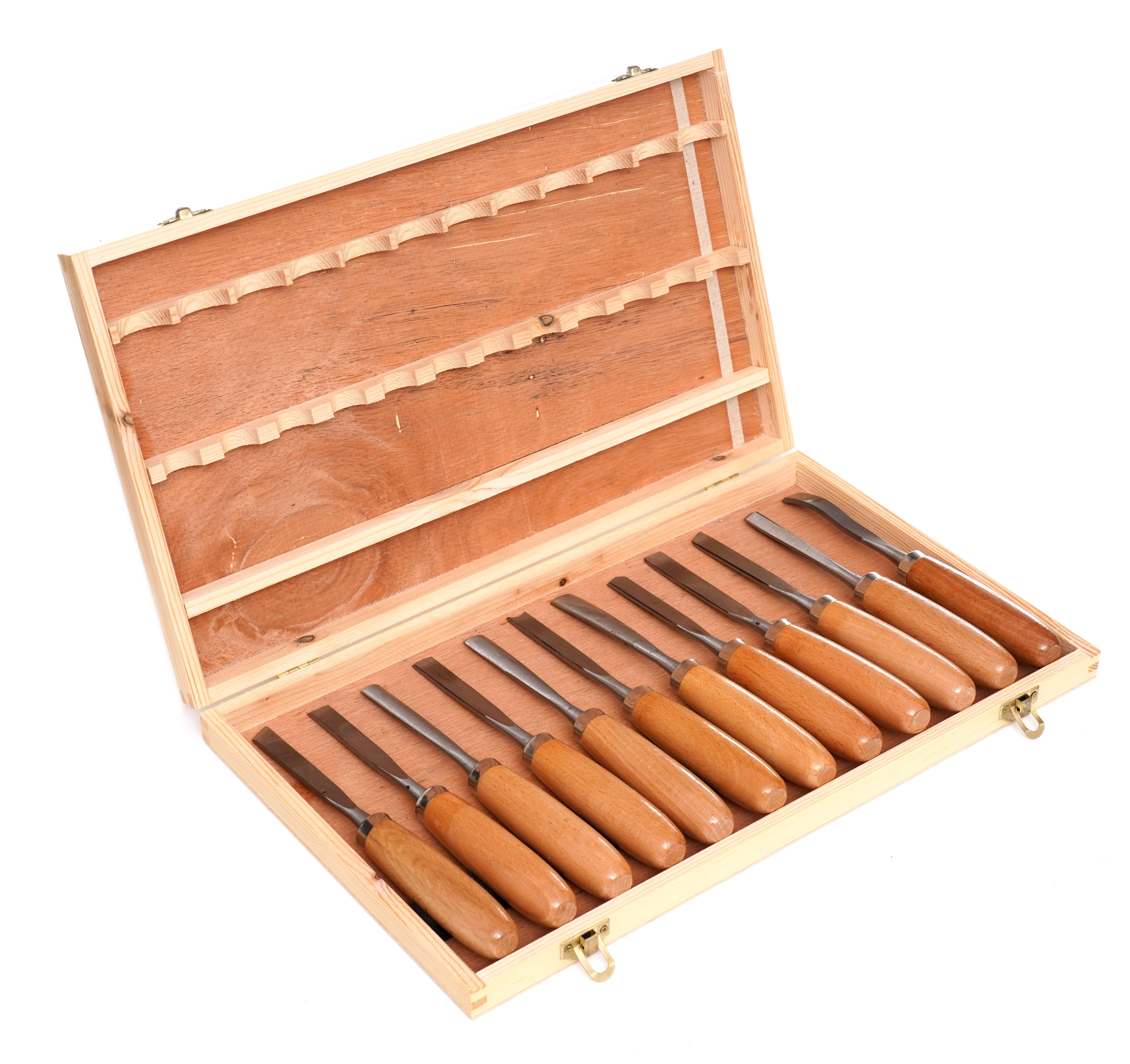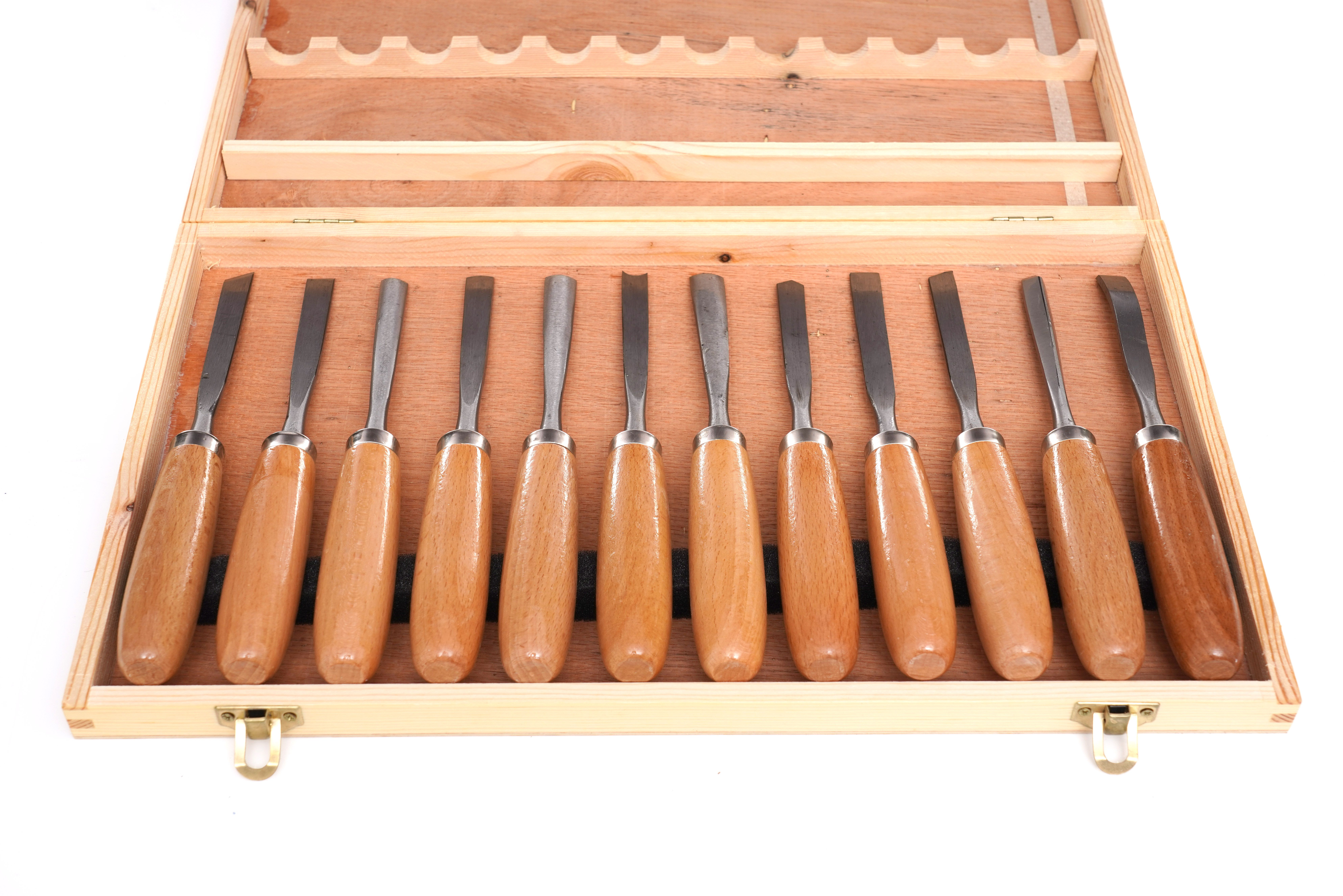 Drewniana kaseta pozwala bezpiecznie przechowywać dłuta rzeźbiarskie, ułatwia organizację i szybkie odnalezienie właściwego narzędzia.