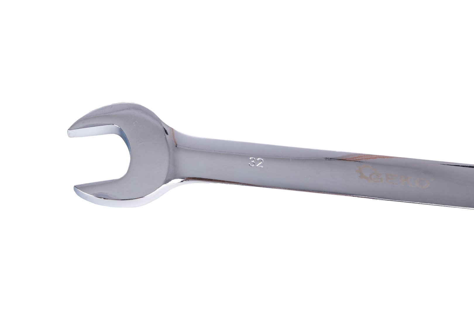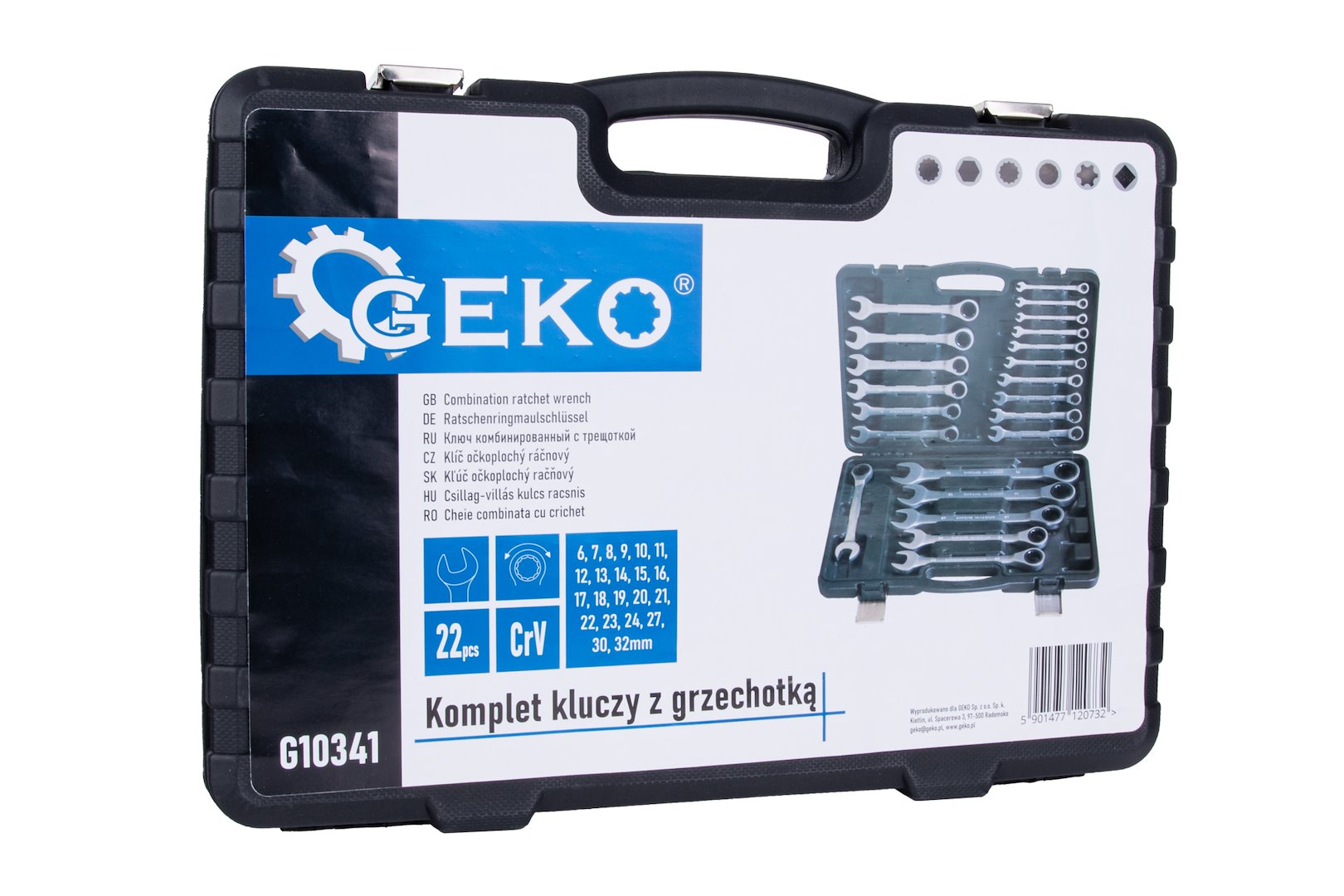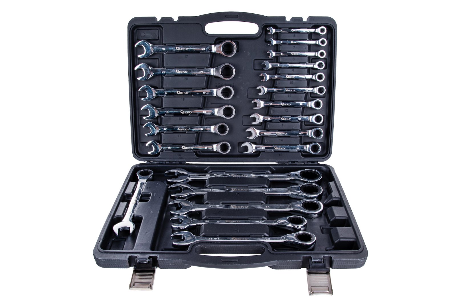 Kompletny zestaw 22 kluczy płasko-oczkowych z mechanizmem grzechotkowym, wykonanych ze stali chromowo-wanadowej. Zakres rozmiarów 6-32 mm obejmuje najpopularniejsze wymiary śrub i nakrętek stosowanych w motoryzacji i mechanice.