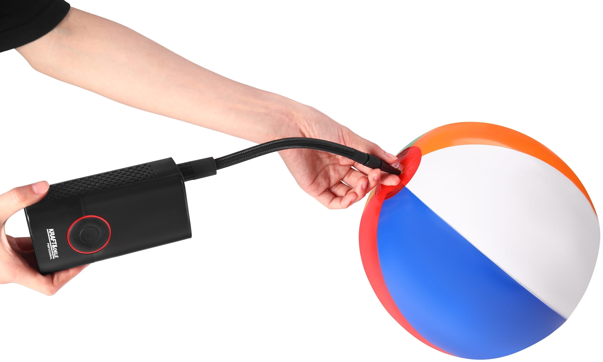 KD5499 to przenośny kompresor zasilany akumulatorem litowo-jonowym o łącznej pojemności 4000mAh, przeznaczony do pompowania opon samochodowych i rowerowych, piłek sportowych, materacy oraz innych nadmuchiwanych akcesoriów. Urządzenie wyposażono w wyświetlacz LCD, wbudowaną latarkę LED oraz złącze USB-C do ładowania.
