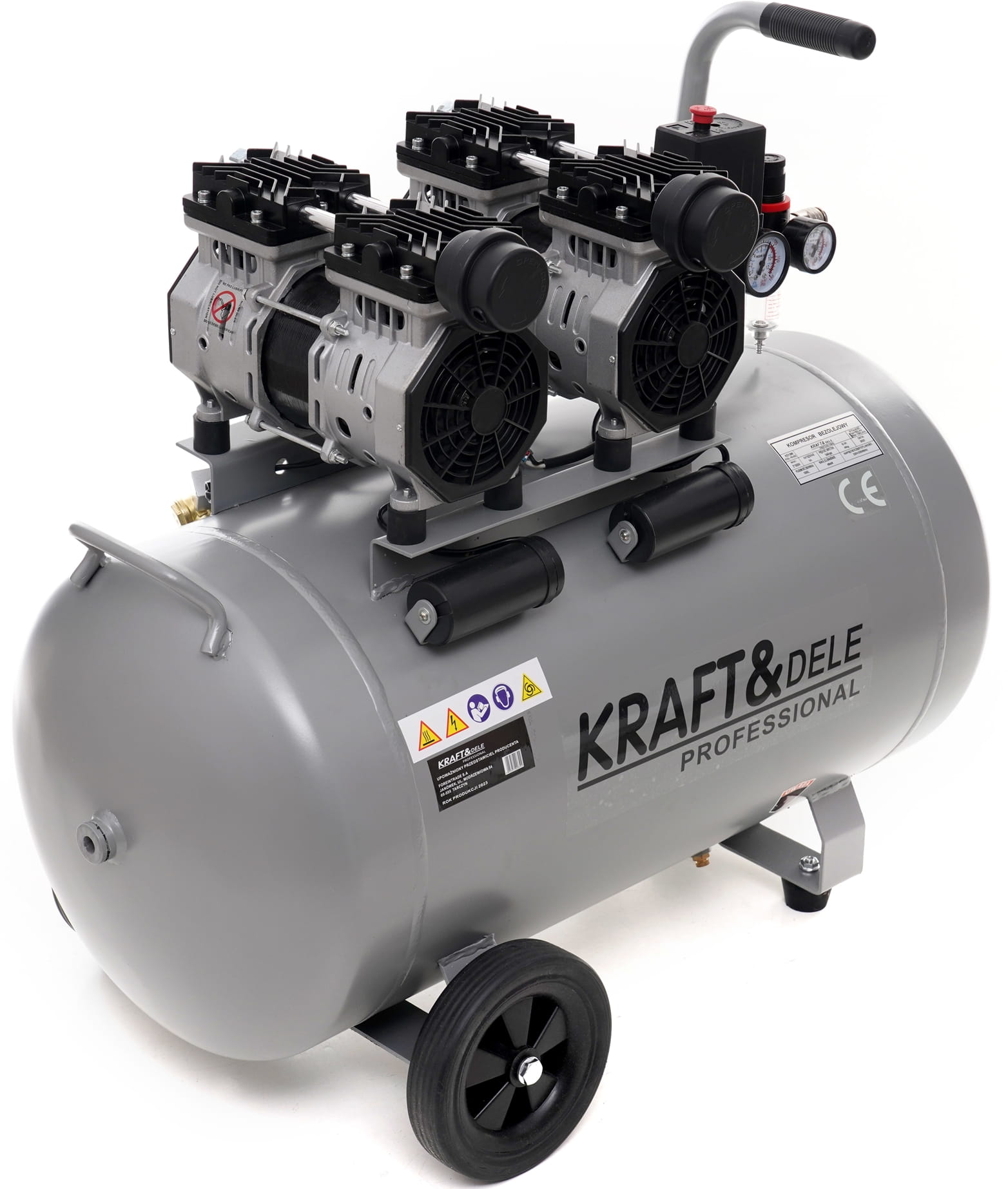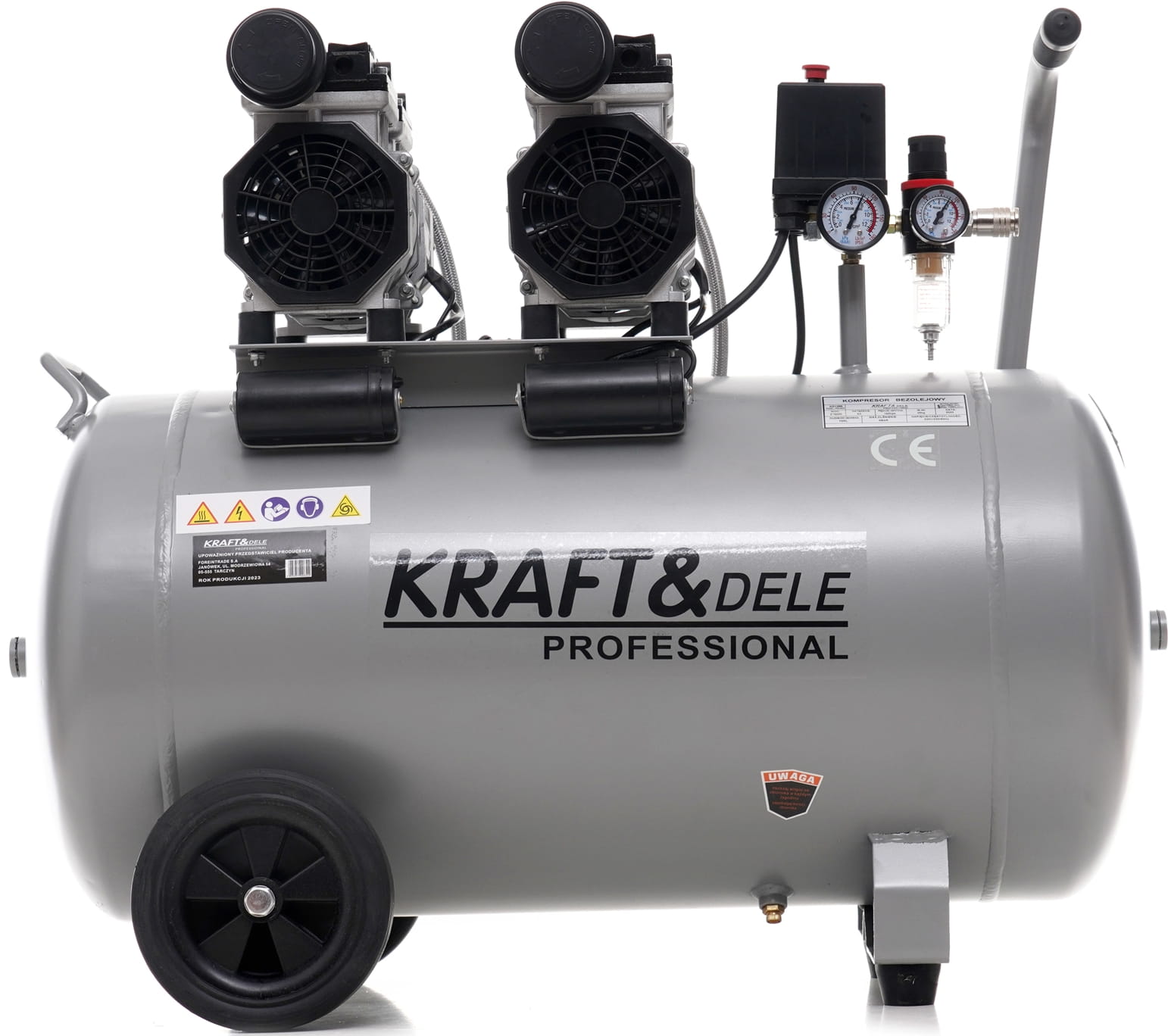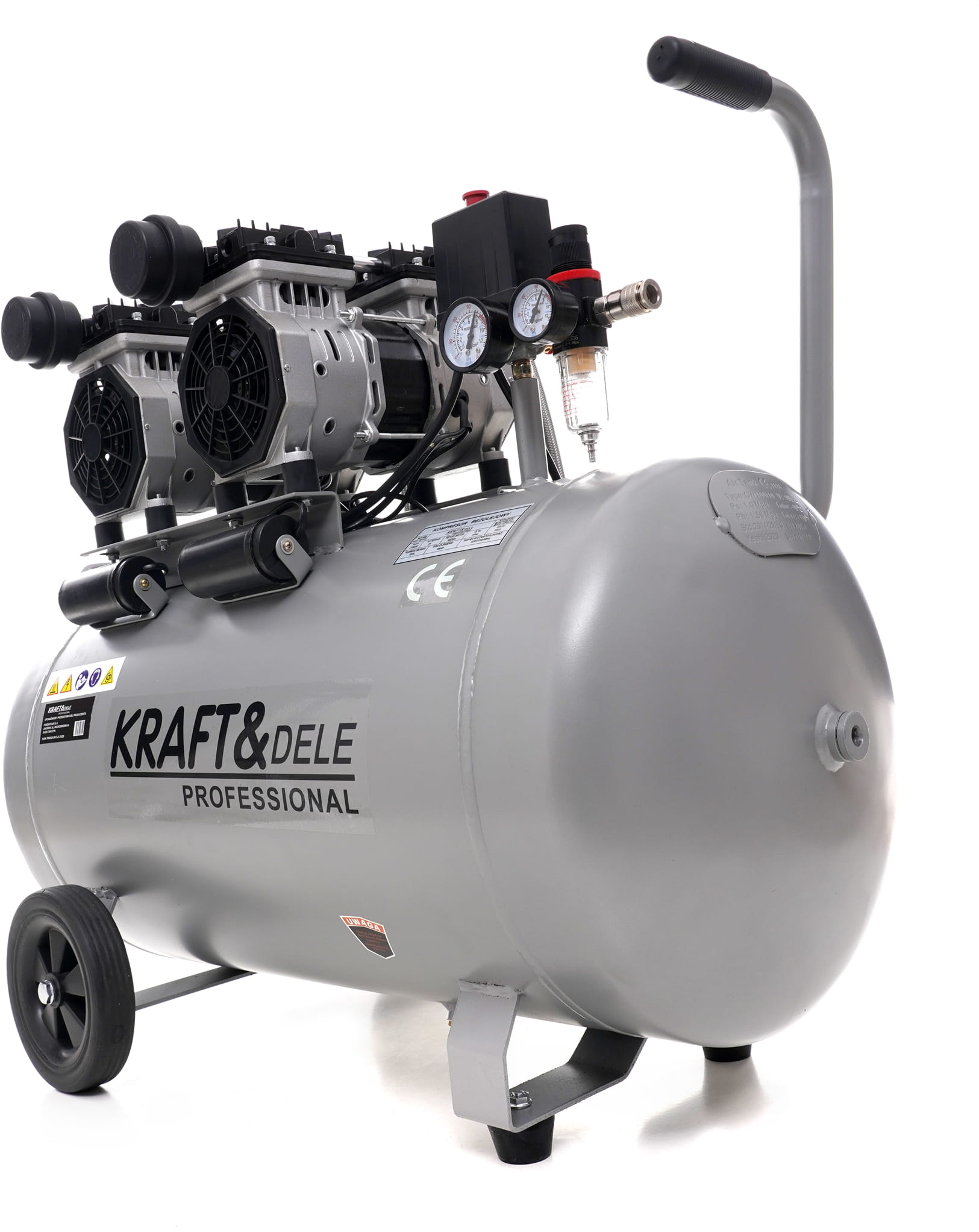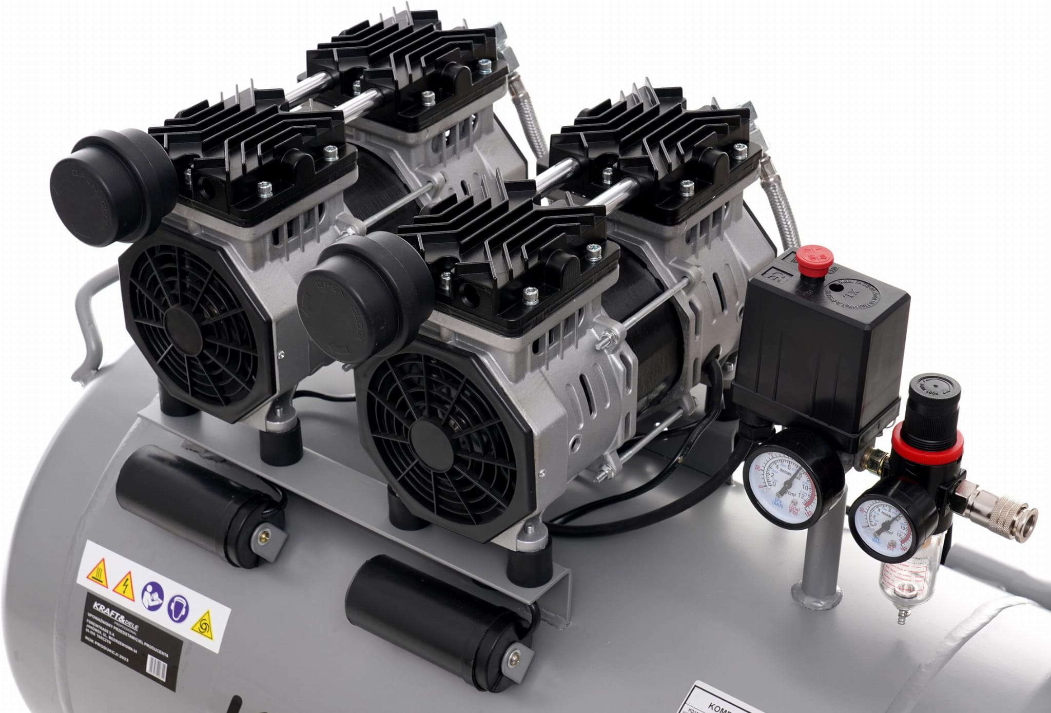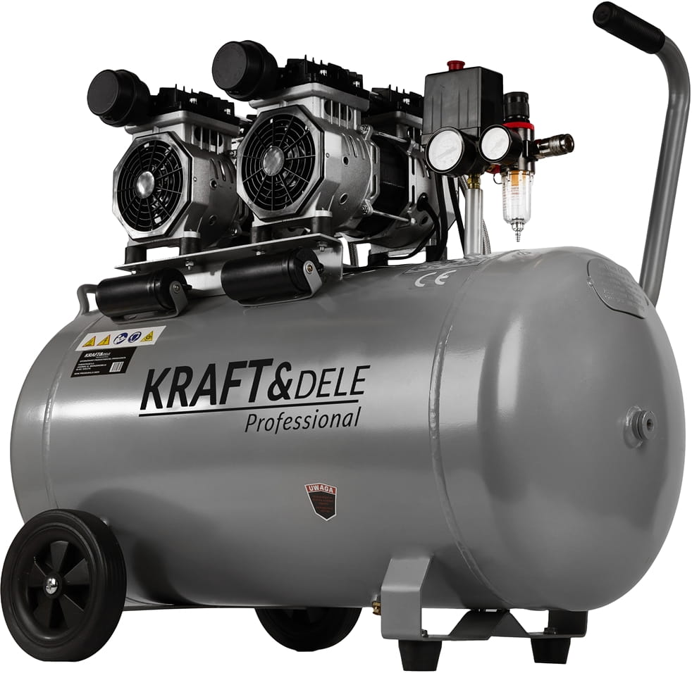 KD1398 to warsztatowy kompresor bezolejowy z podwójnym silnikiem o łącznej mocy 3000 W i zbiornikiem 100 litrów. Konstrukcja bezolejowa eliminuje konieczność serwisowania układu smarowania i zapewnia czyste powietrze — istotne przy pracach lakierniczych, pneumatycznych i serwisowych. Urządzenie pracuje pod napięciem 230 V, co umożliwia podłączenie do standardowej instalacji elektrycznej.