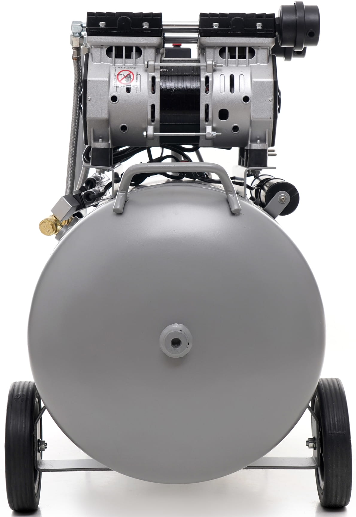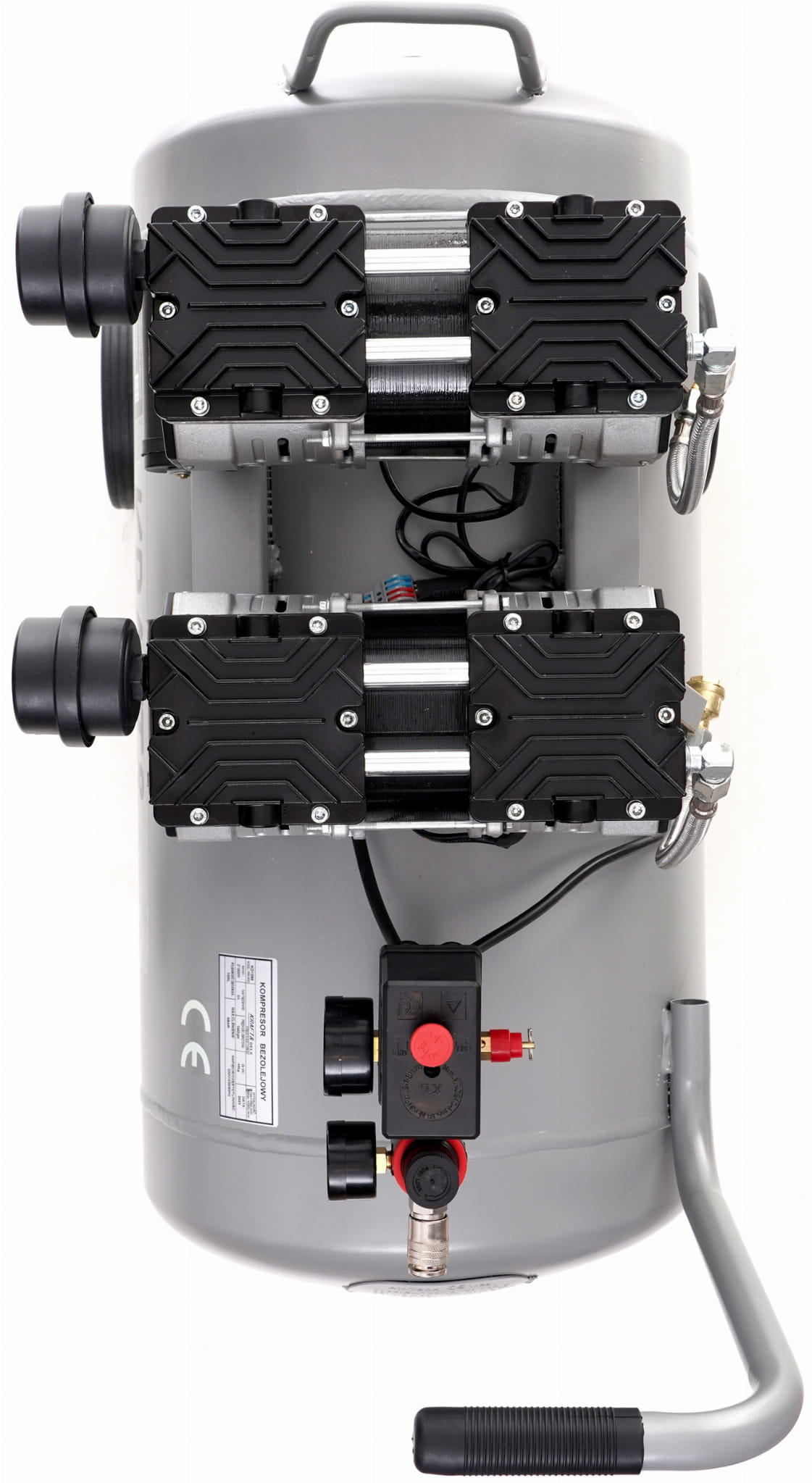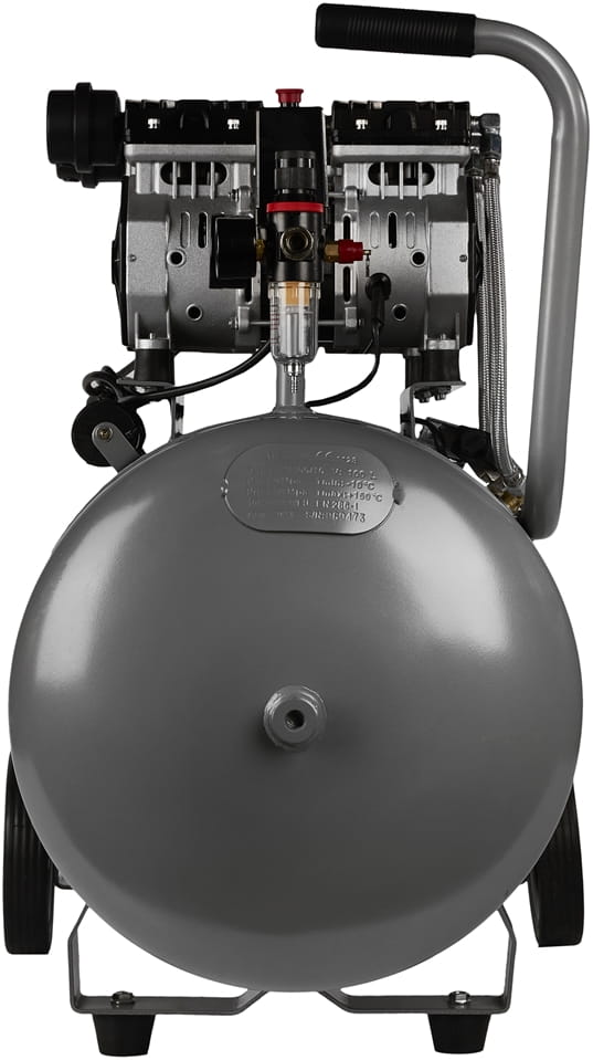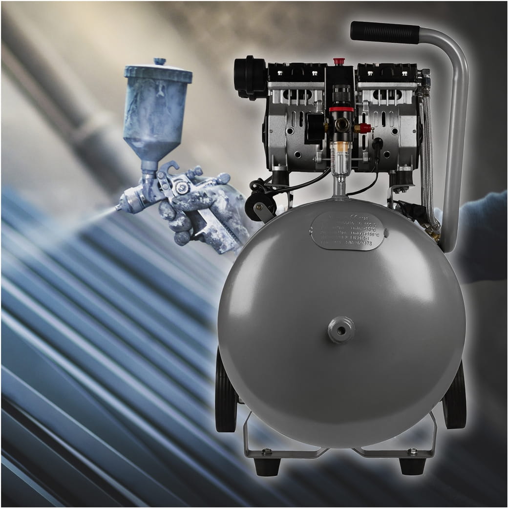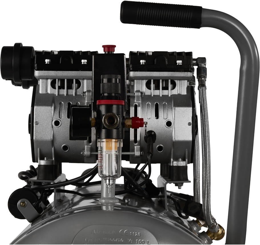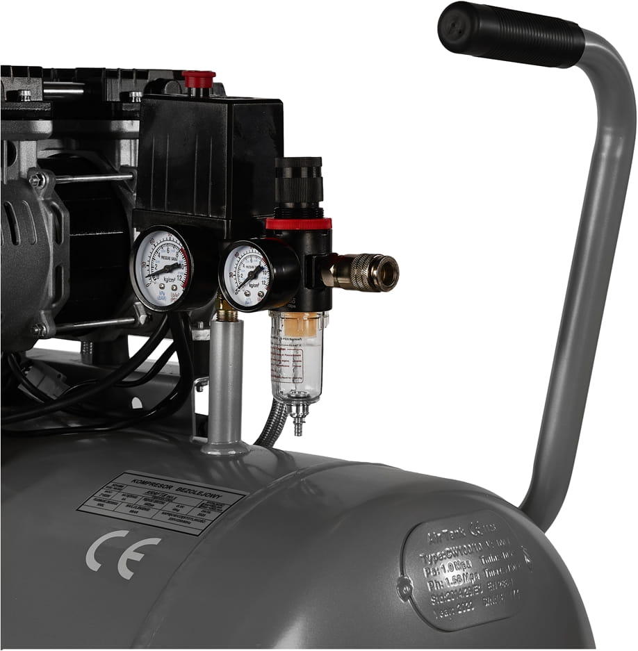 Brak oleju smarowego w układzie sprężającym oznacza, że powietrze tłoczone do zbiornika nie zawiera oparów olejowych. Ma to znaczenie przy zastosowaniach wymagających czystego medium — lakierowanie, dmuchawa, narzędzia pneumatyczne wrażliwe na zanieczyszczenia. Eliminuje też konieczność kontroli i wymiany oleju.