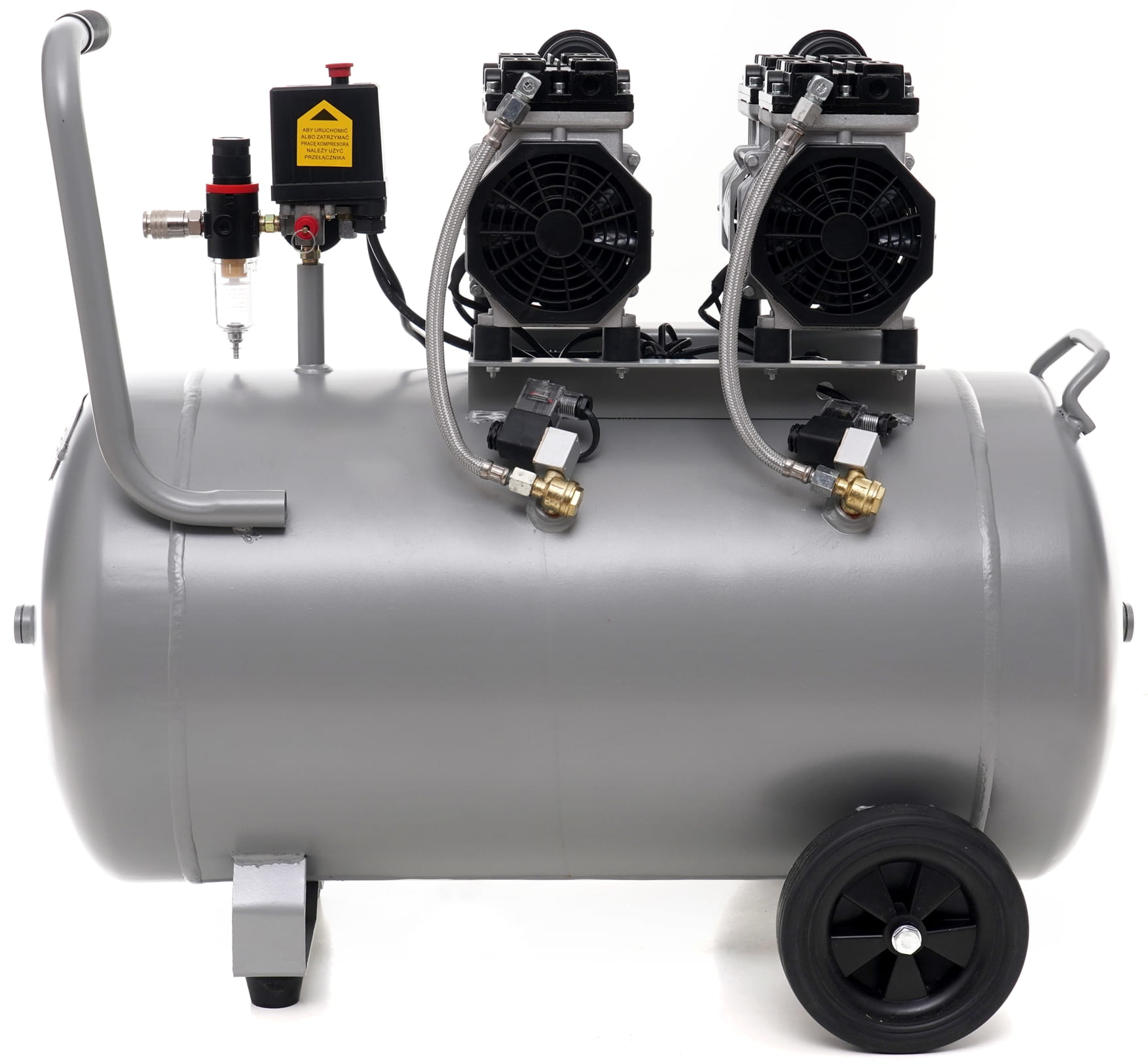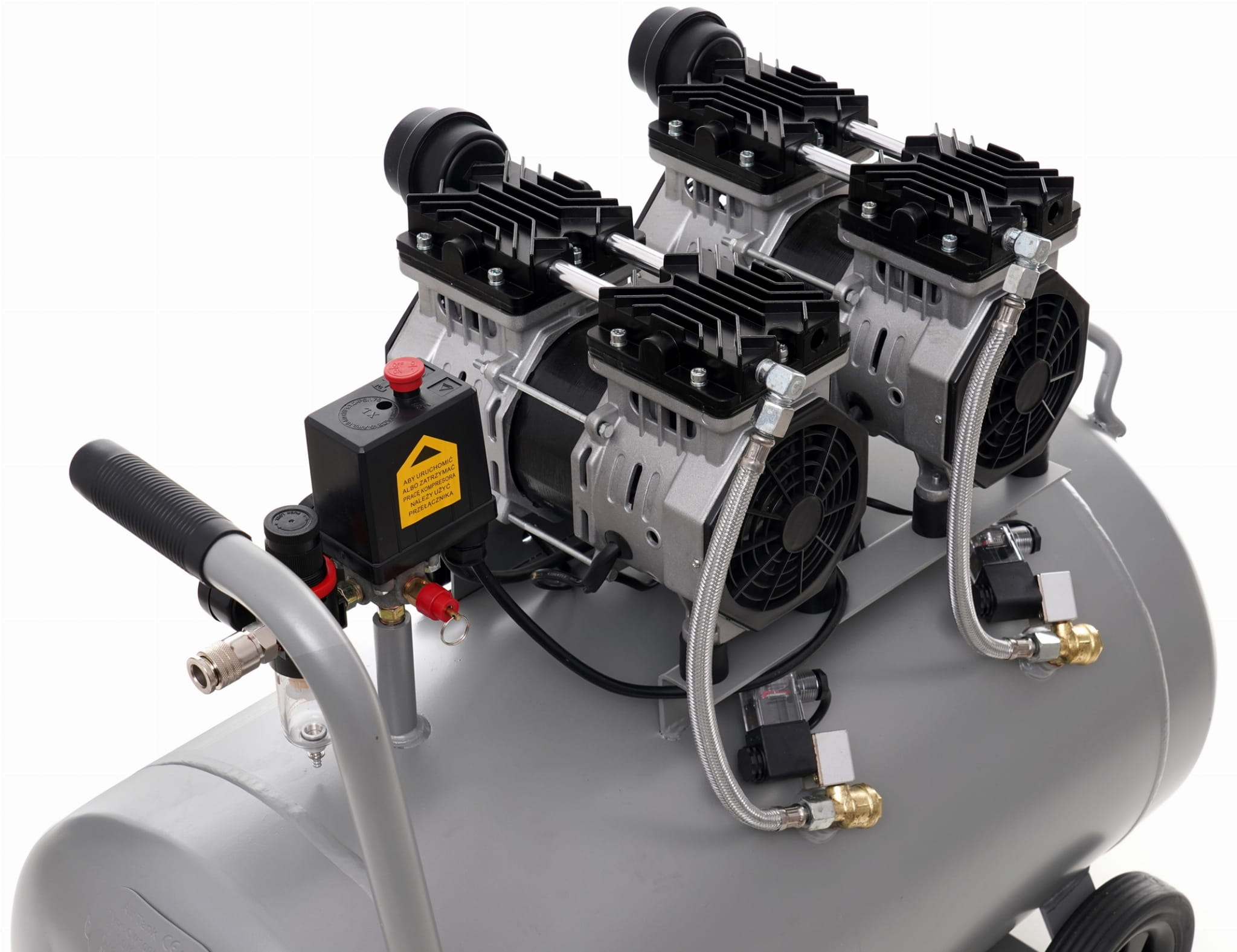 Zawór elektromagnetyczny umożliwia precyzyjne sterowanie przepływem powietrza i odcięcie zasilania bez gwałtownych skoków ciśnienia. Wygodny uchwyt transportowy oraz duże koła pozwalają na przemieszczanie urządzenia o wadze 46 kg bez konieczności użycia dodatkowego sprzętu.