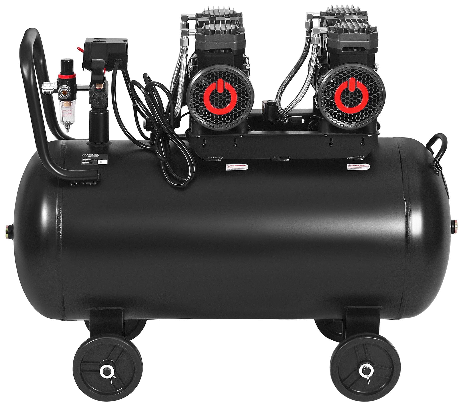 KD4083 to bezolejowy kompresor tłokowy ze zbiornikiem 100 litrów, wyposażony w dwa niezależne silniki o łącznej mocy 4400W. Układ dwusilnikowy zapewnia wydajność na poziomie 585 l/min przy ciśnieniu roboczym 8 bar, co pozwala na zasilanie kilku narzędzi pneumatycznych jednocześnie lub pracę ciągłą z urządzeniami o dużym zapotrzebowaniu na powietrze.