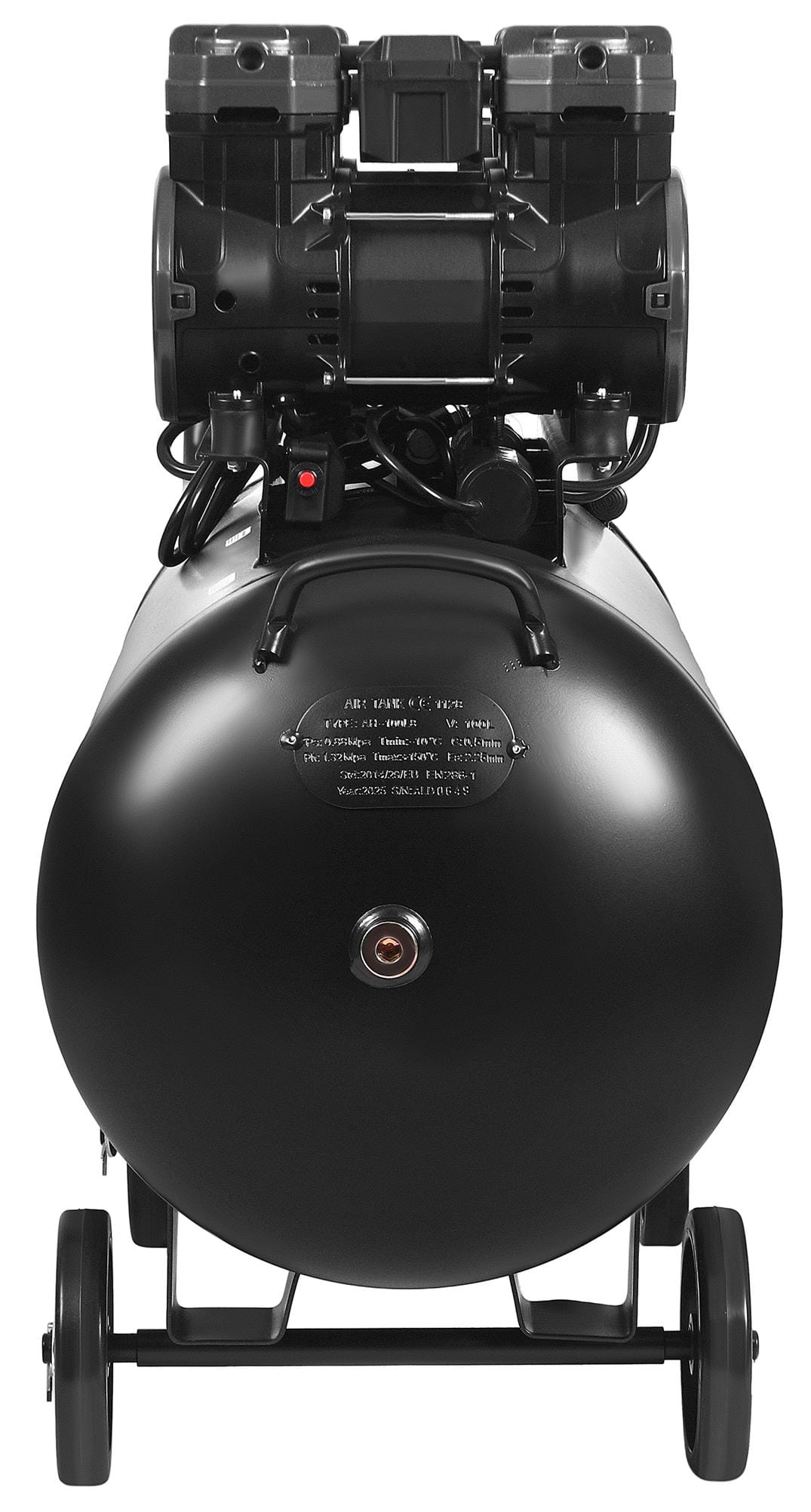 Masa 59 kg przy pojemności 100 litrów wymaga zastosowania kółek transportowych — urządzenie jest wyposażone w cztery duże koła oraz metalowy uchwyt, co umożliwia przemieszczanie kompresora po warsztacie lub budowie bez konieczności użycia dodatkowego sprzętu. Poziom hałasu 70 dB(A) plasuje urządzenie w kategorii kompresorów o obniżonej emisji dźwięku. Zabezpieczenie termiczne silników chroni przed skutkami przeciążenia.