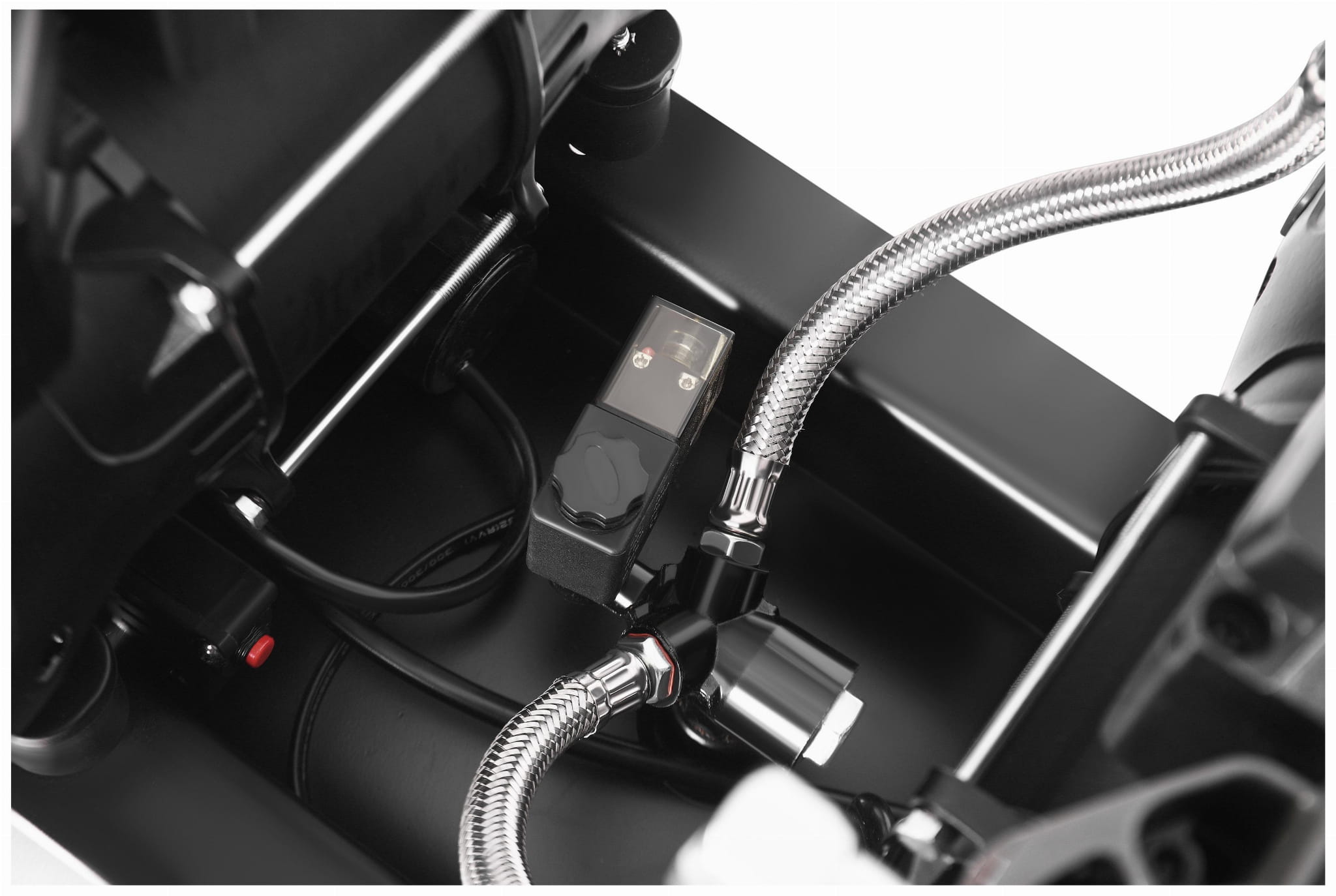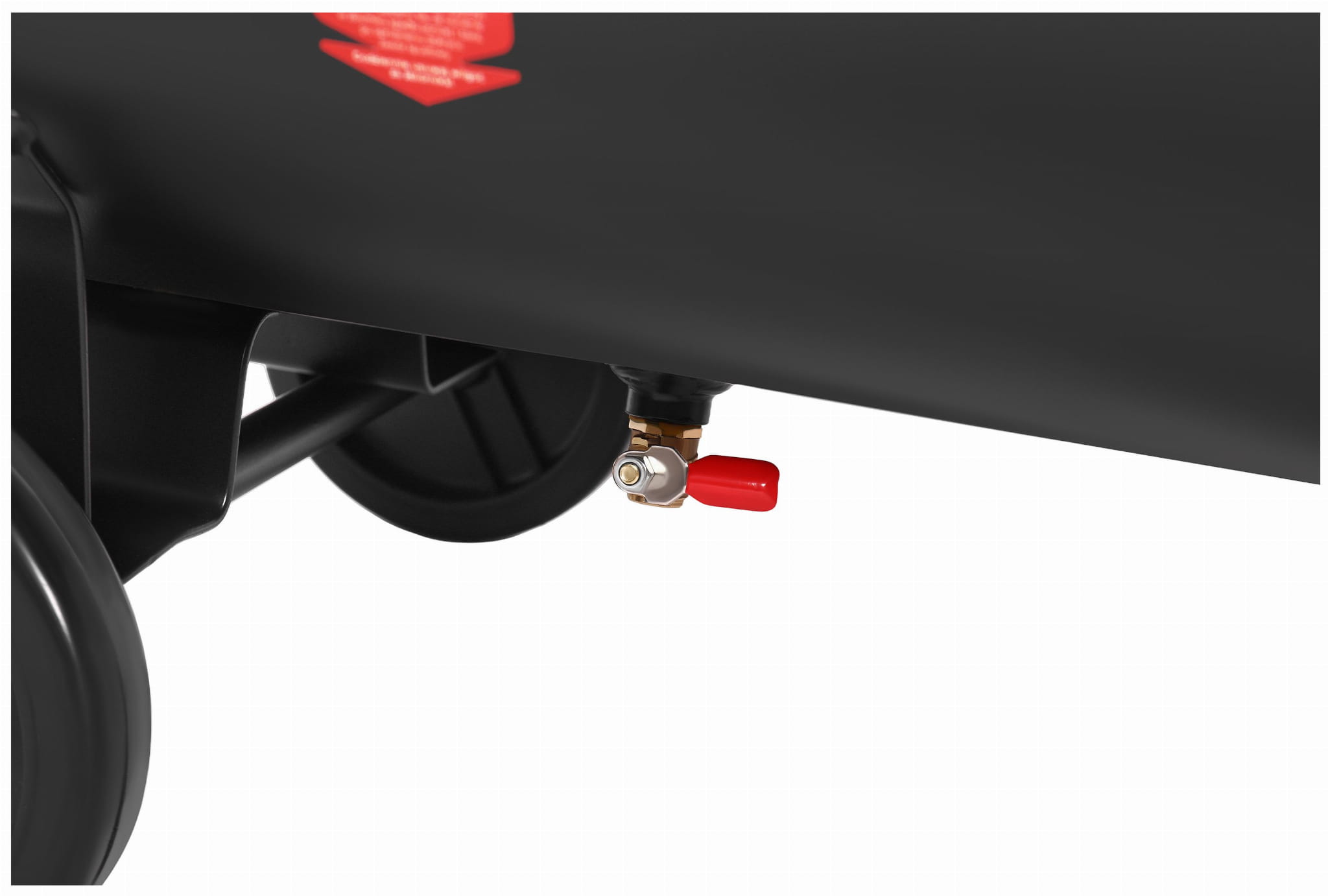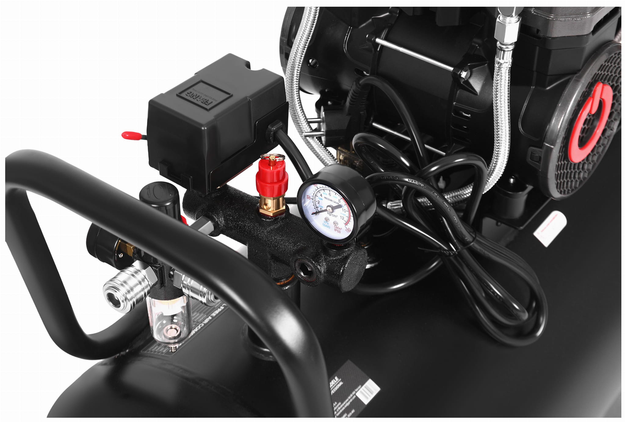 Kompresor wyposażony jest w dwa manometry — jeden wskazuje ciśnienie w zbiorniku, drugi ciśnienie na wyjściu po reduktorze. Reduktor ciśnienia umożliwia precyzyjne ustawienie wartości roboczej dostosowanej do konkretnego narzędzia. Odwadniacz usuwa skroploną wodę ze zbiornika, co zapobiega korozji i chroni podłączone urządzenia przed wilgocią.