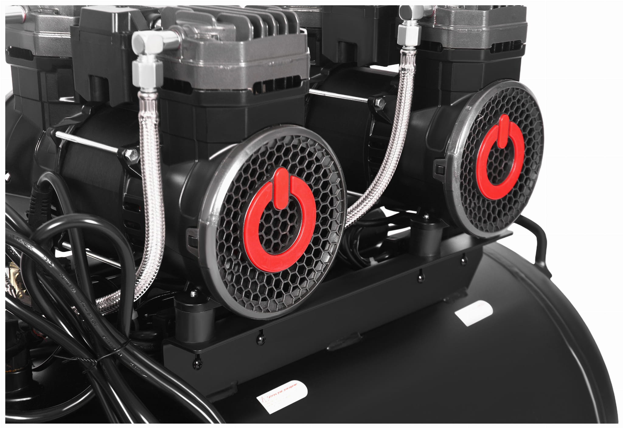 Dwa silniki pracujące równolegle pozwalają uzyskać wydajność objętościową 585 l/min przy zasilaniu standardowym jednofazowym 230V/50Hz. Prędkość obrotowa 2800 rpm zapewnia szybkie napełnianie zbiornika po jego opróżnieniu. Dzięki temu przerwy w pracy spowodowane oczekiwaniem na sprężone powietrze są minimalne nawet przy intensywnym użytkowaniu.
