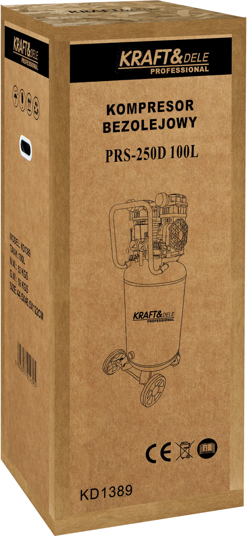 KD1389 to jednostopniowy kompresor bezolejowy z pionowym zbiornikiem 100 litrów, przeznaczony do ciągłej pracy w warsztacie lub zastosowań domowych o podwyższonych wymaganiach wydajnościowych. Brak układu olejowego eliminuje konieczność regularnej wymiany oleju i ryzyko zanieczyszczenia sprężonego powietrza, co jest istotne przy pracy z narzędziami pneumatycznymi i urządzeniami lakierniczymi.
