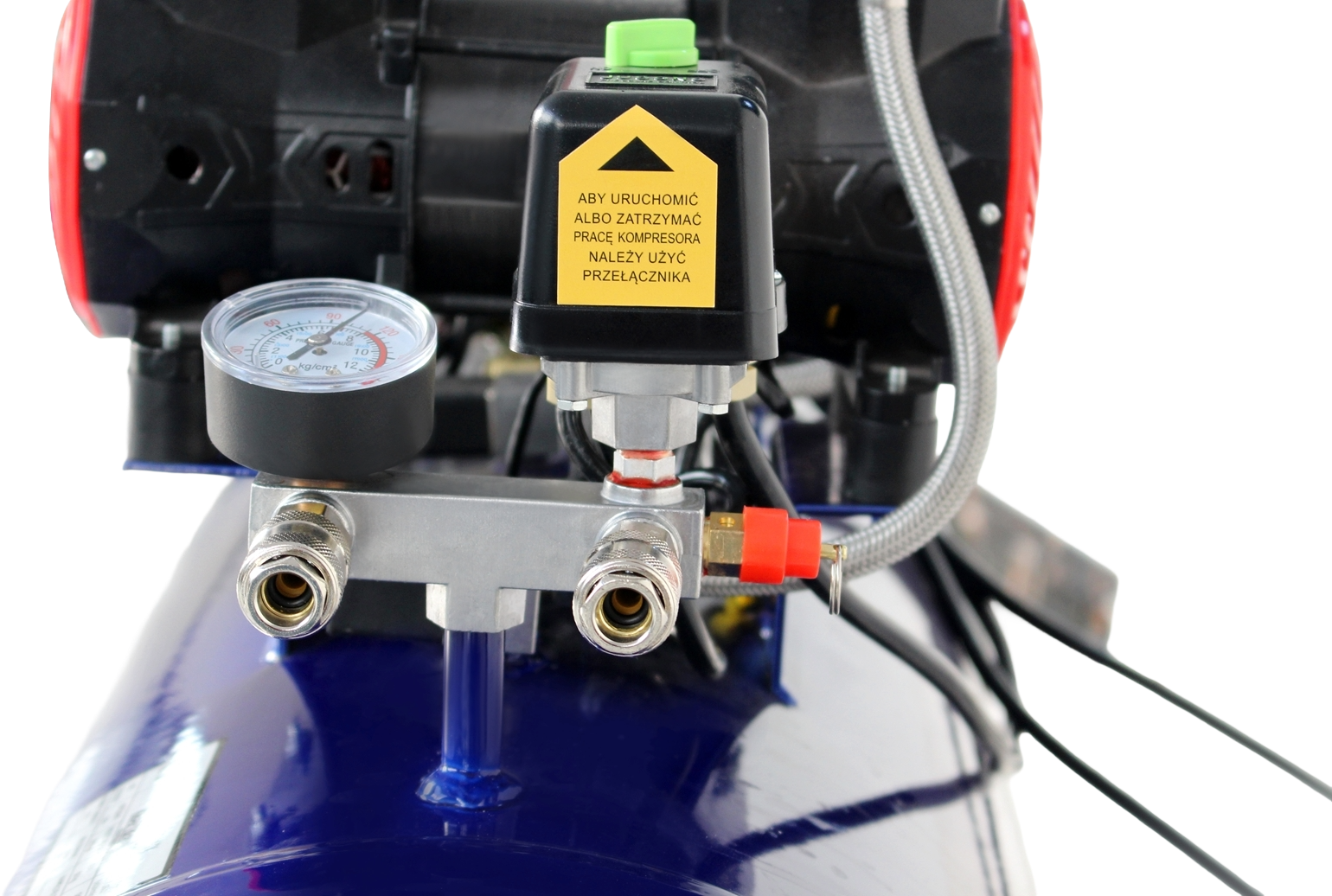 Kompresor zasilany jest z sieci 230 V / 50 Hz przy natężeniu 3,8 A. Przed podłączeniem warto sprawdzić, czy gniazdo i przewód zasilający są przystosowane do ciągłej pracy urządzenia o tej mocy. Zalecane jest podłączenie do obwodu z zabezpieczeniem co najmniej 10 A i przewodem o przekroju minimum 1,5 mm². W przypadku stosowania przedłużacza należy używać kabla o możliwie krótkim odcinku i odpowiednim przekroju, aby uniknąć spadków napięcia wpływających na pracę silnika.