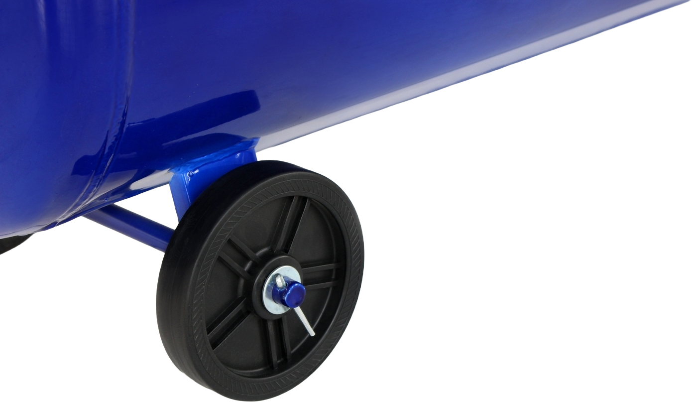 Pomimo masy 55 kg urządzenie wyposażono w układ jezdny, który umożliwia swobodne przemieszczanie kompresora po warsztacie lub garażu bez konieczności jego podnoszenia. Stalowe elementy obrotowe ograniczają drgania i poprawiają stabilność podczas pracy.