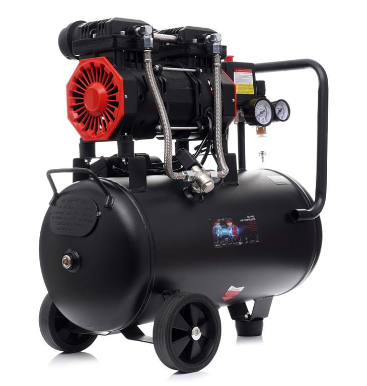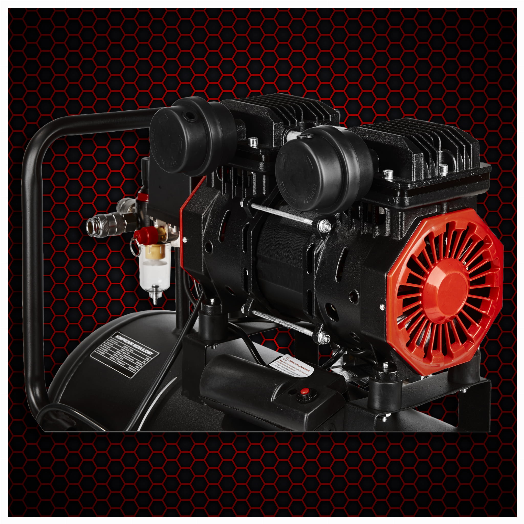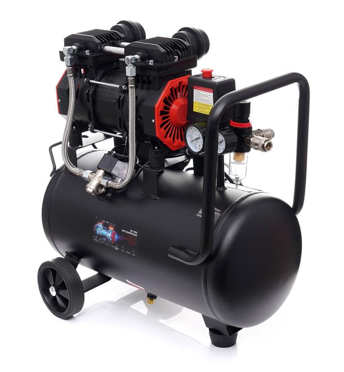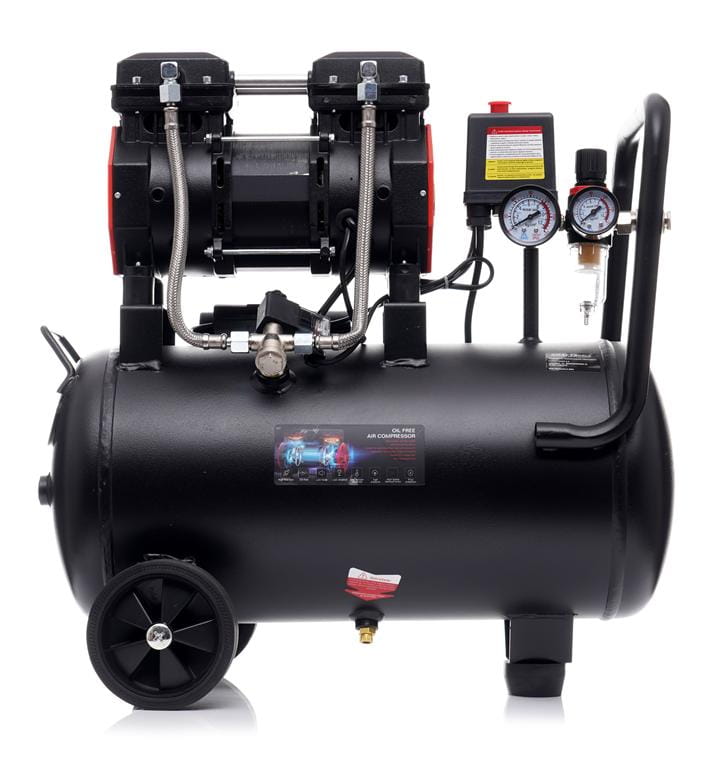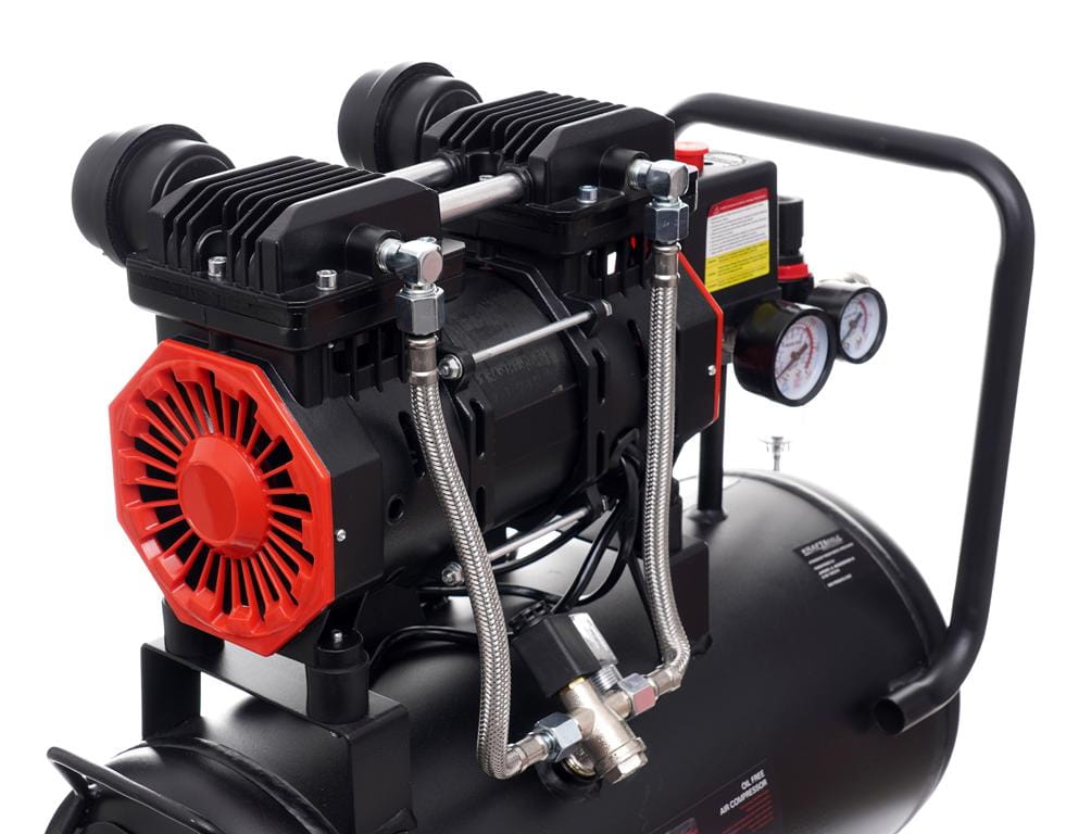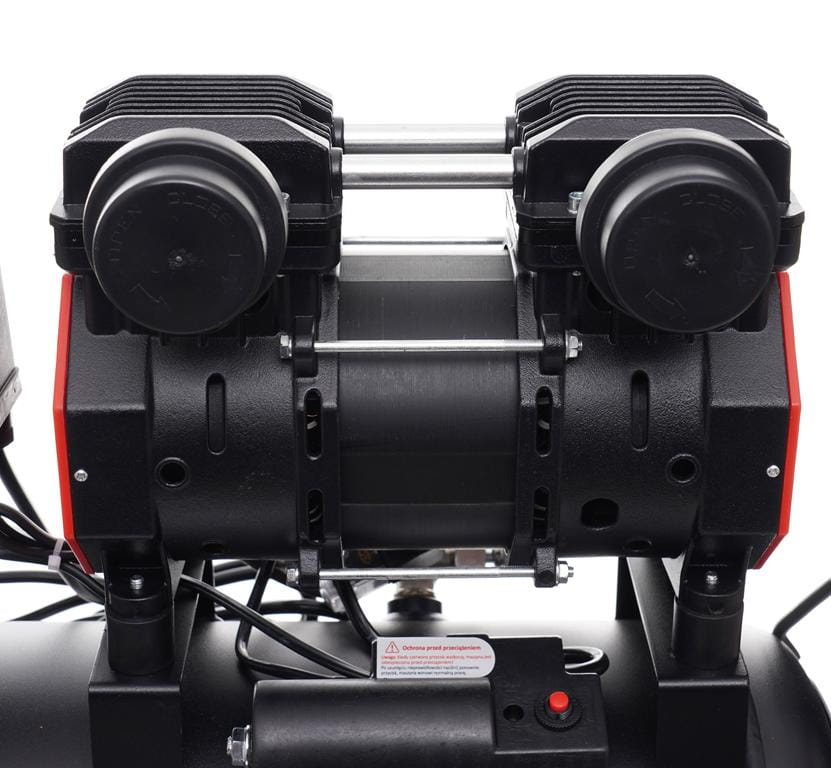 Głowica kompresora nie wymaga oleju smarowego — eliminuje to konieczność regularnej wymiany oleju i zmniejsza ryzyko zanieczyszczenia sprężonego powietrza. Rozwiązanie istotne wszędzie tam, gdzie czystość powietrza ma znaczenie, np. przy lakierowaniu lub pompowaniu opon.