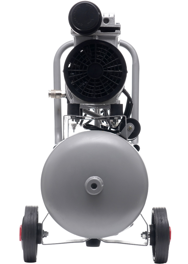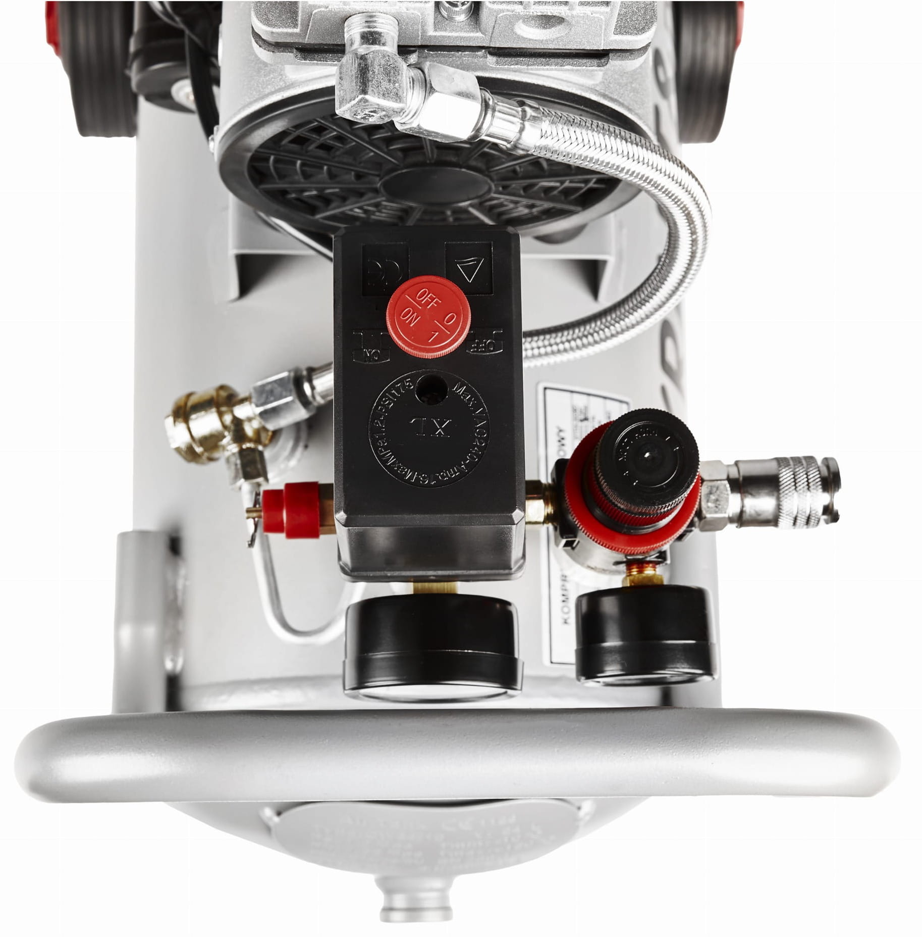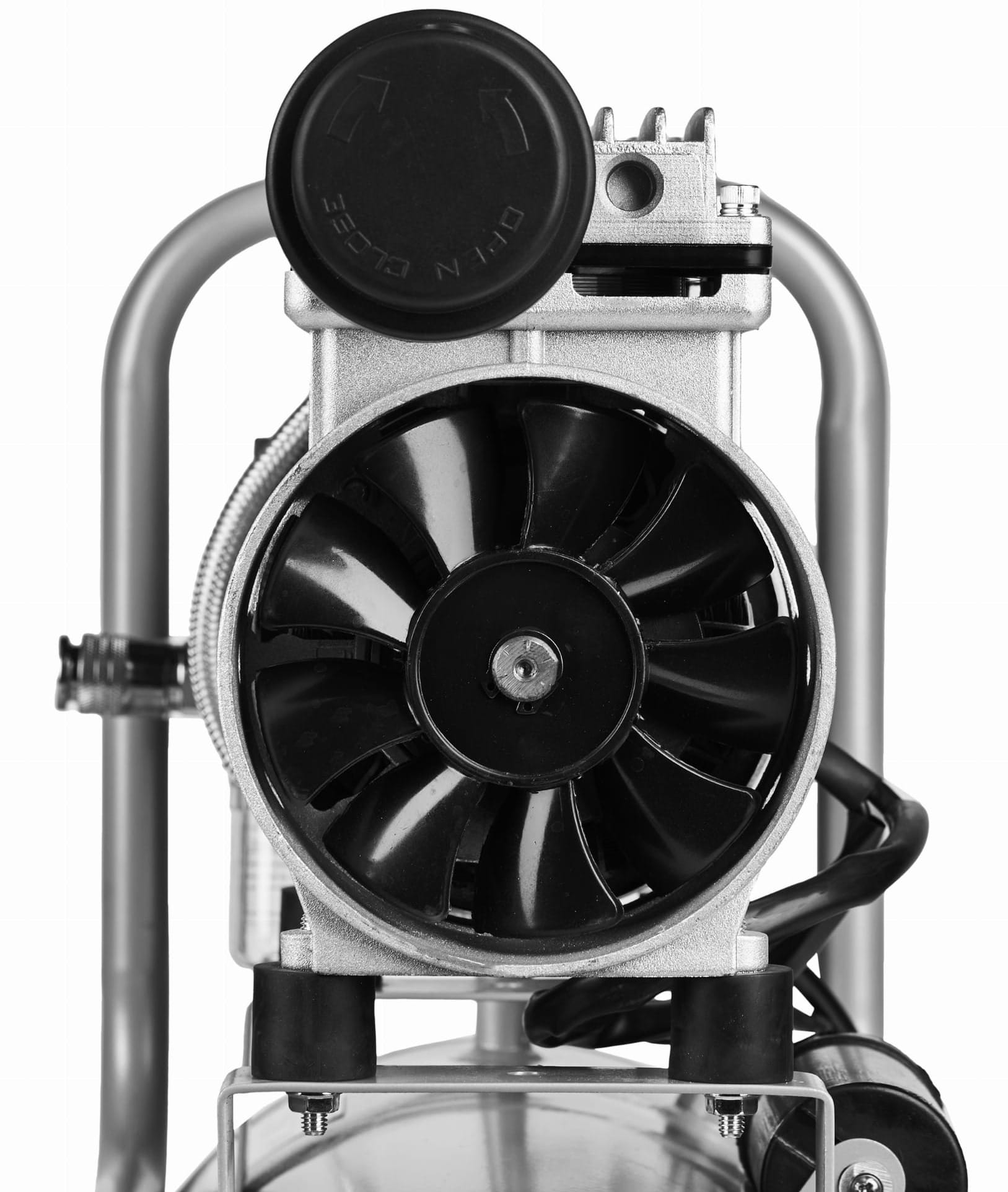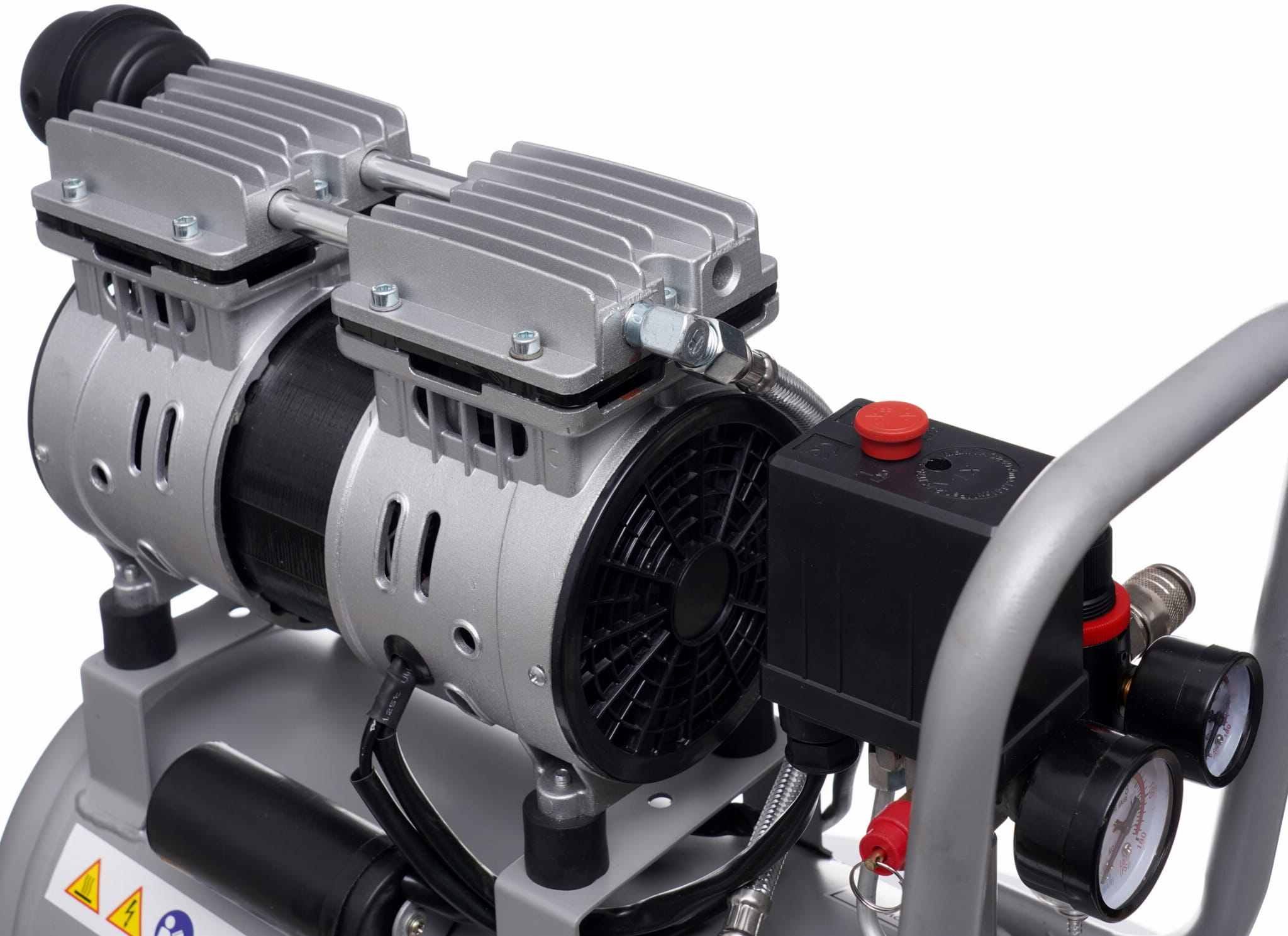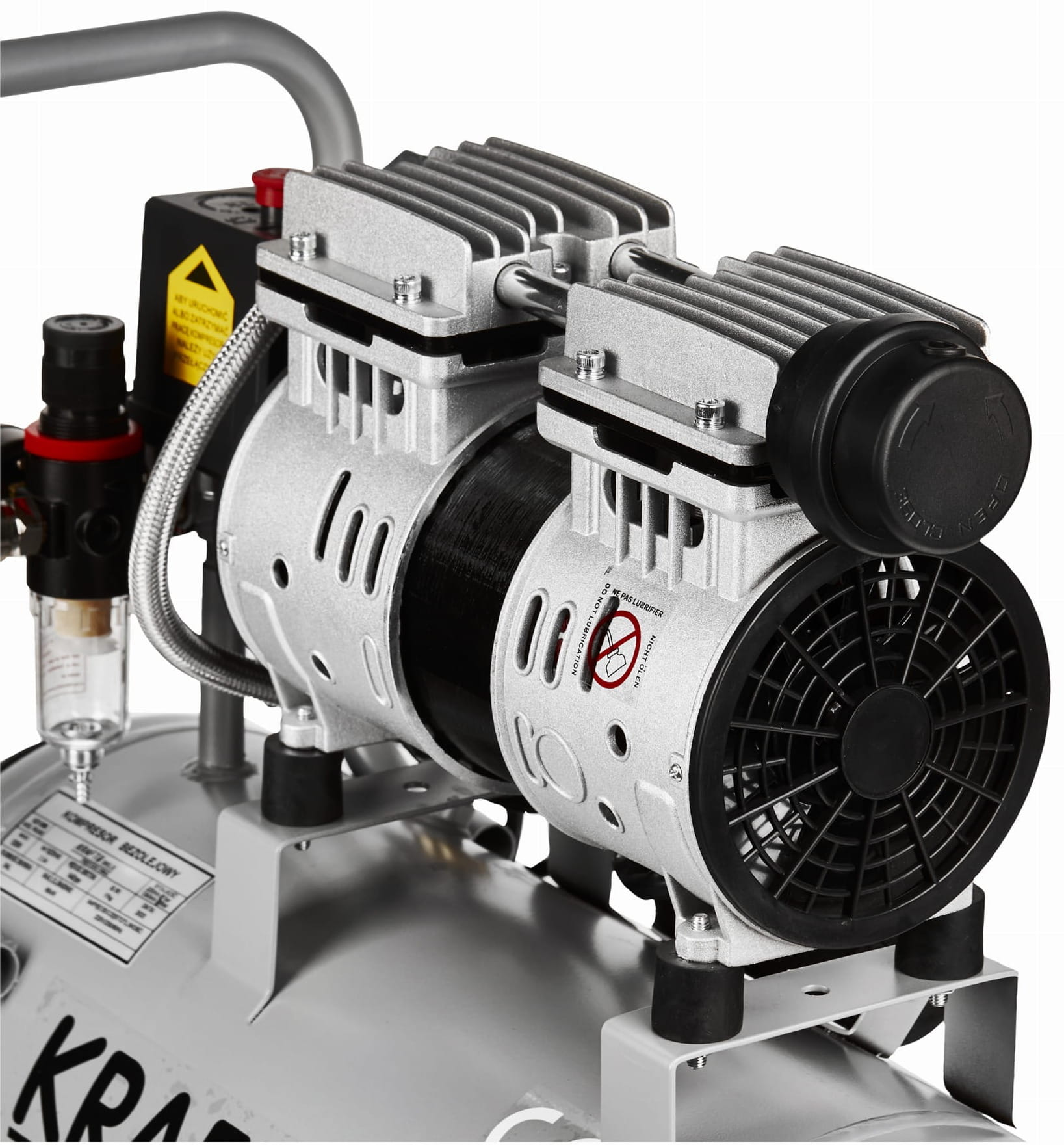 Głowica sprężarki pracuje bez oleju smarującego, co eliminuje konieczność kontroli poziomu oleju i jego wymiany. Sprężone powietrze nie zawiera oparów olejowych, co ma znaczenie przy pracach lakierniczych lub pneumatycznych narzędziach wrażliwych na zanieczyszczenia.