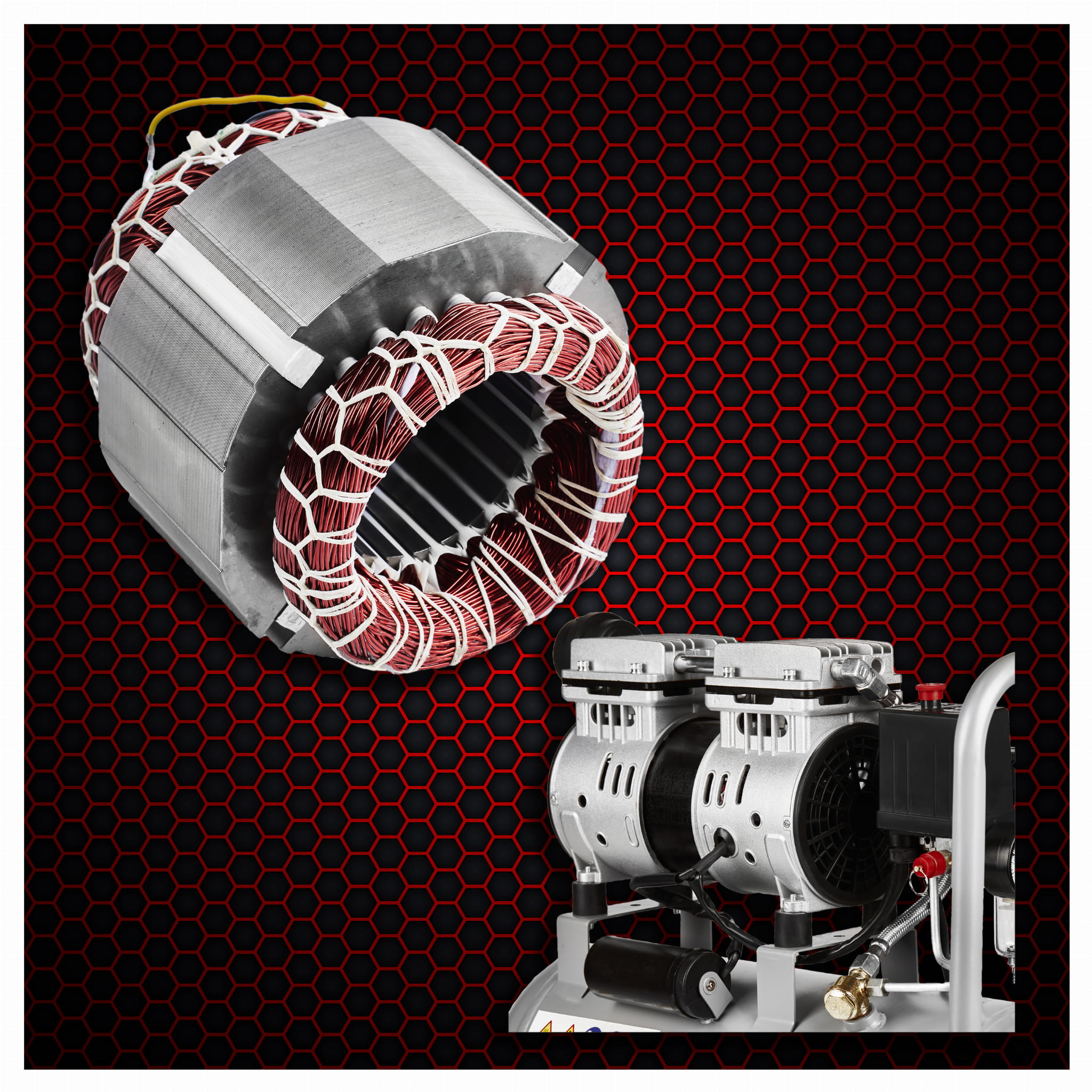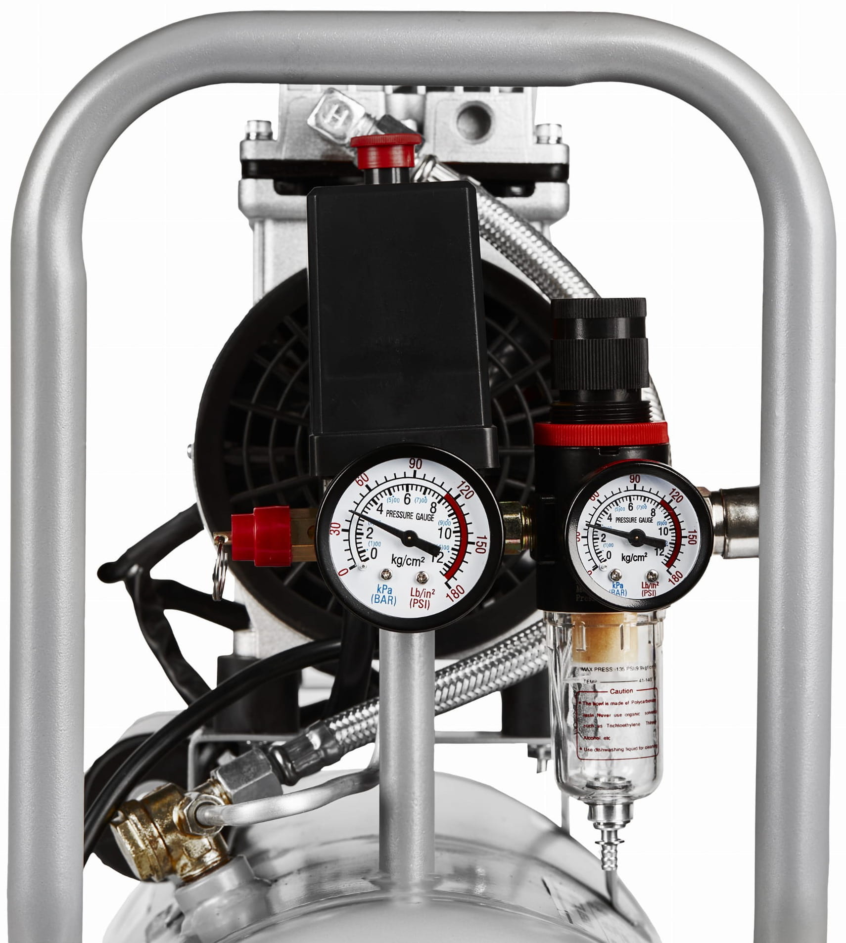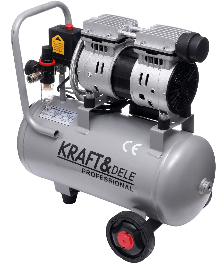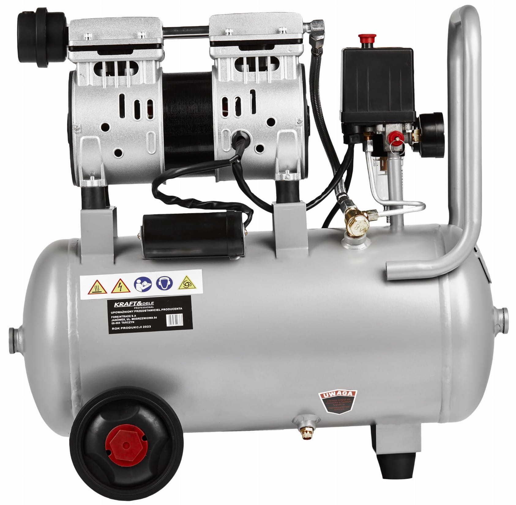 Głowica sprężarki pracuje bez oleju smarującego, co eliminuje konieczność kontroli poziomu oleju i jego wymiany. Sprężone powietrze nie zawiera oparów olejowych, co ma znaczenie przy pracach lakierniczych lub pneumatycznych narzędziach wrażliwych na zanieczyszczenia.