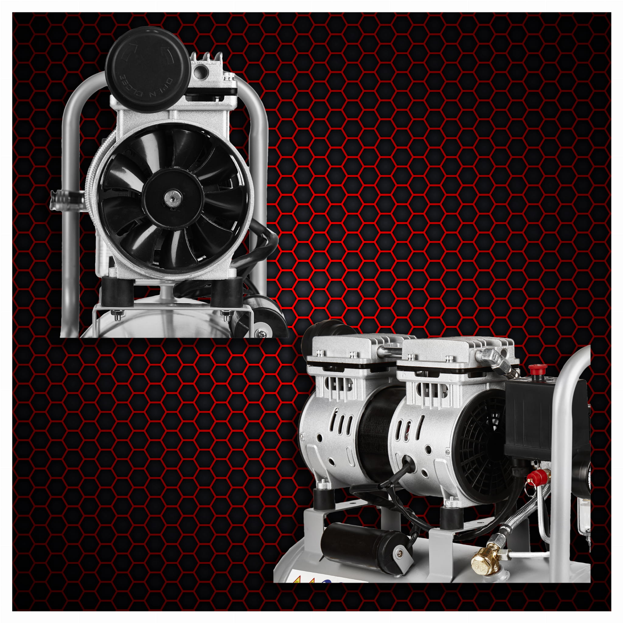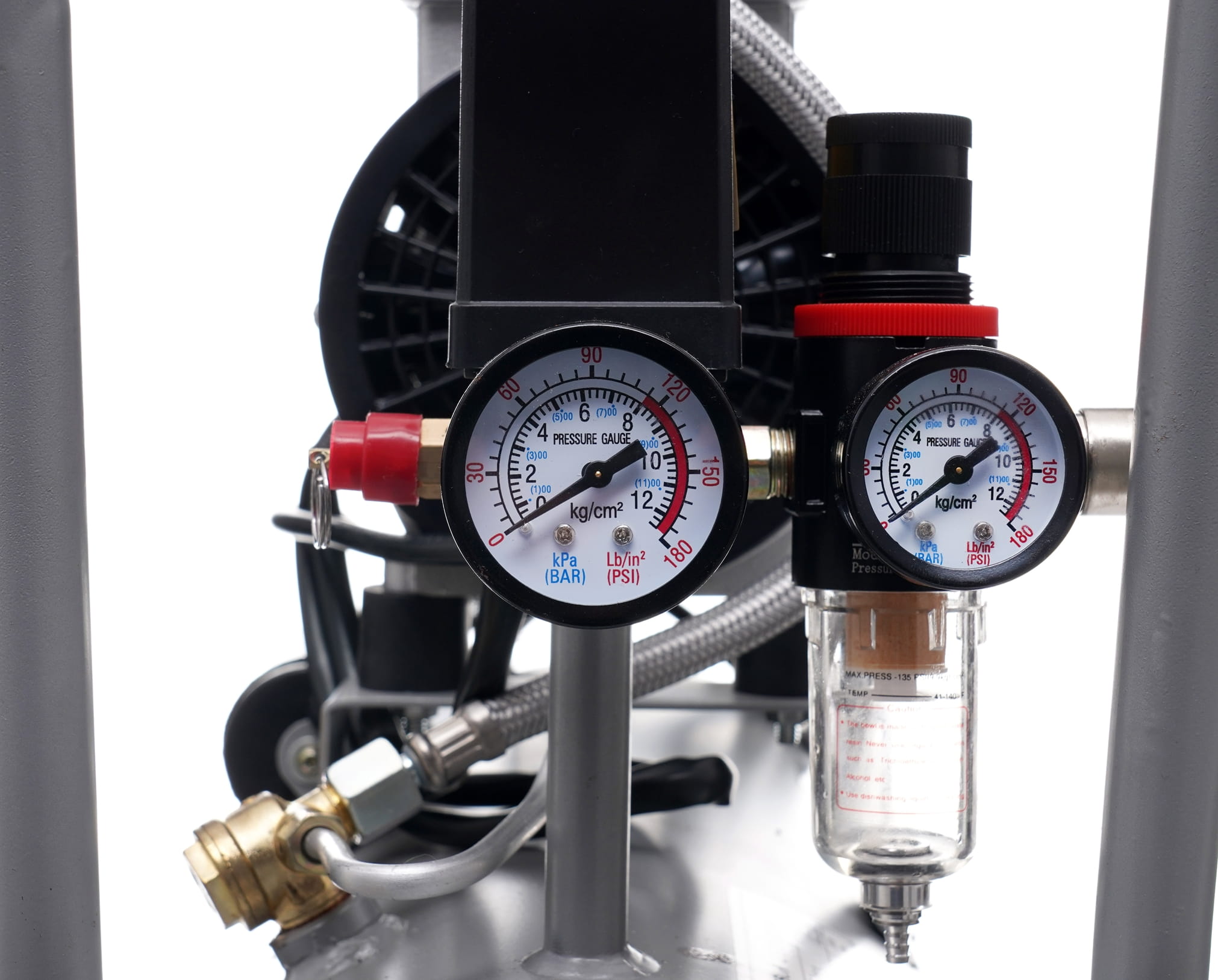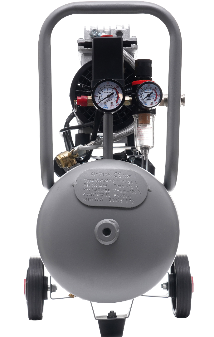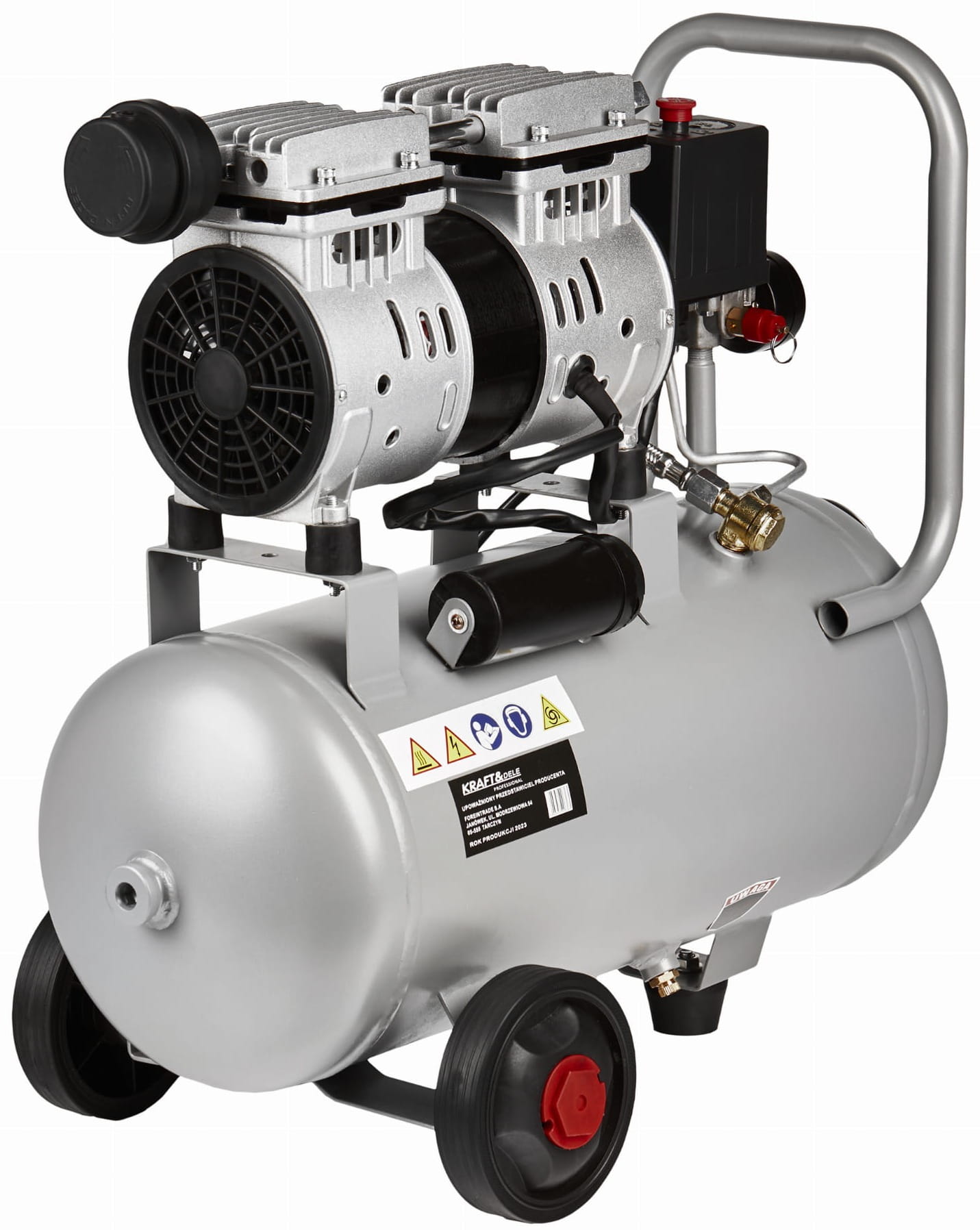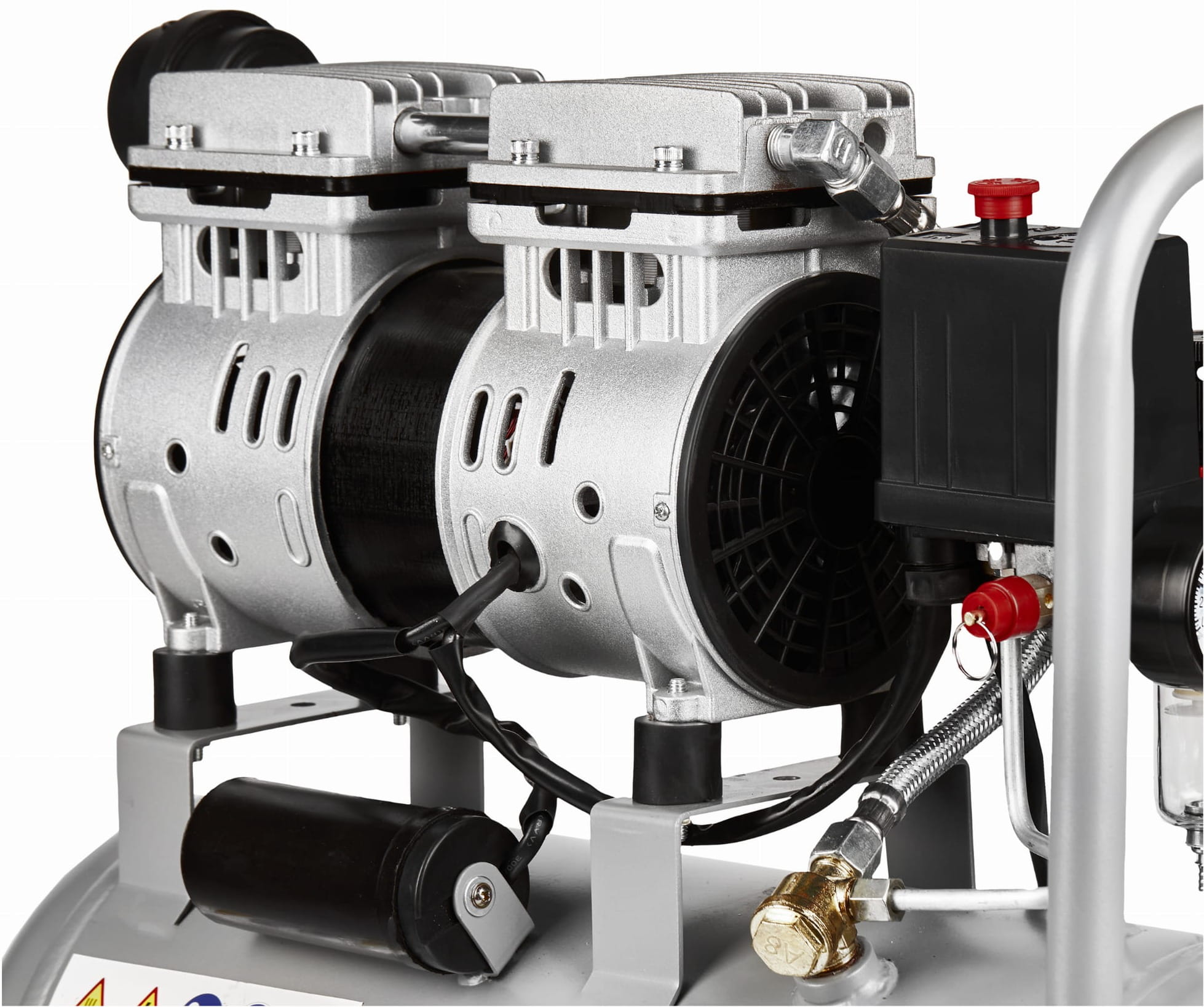 Głowica sprężarki pracuje bez oleju smarującego, co eliminuje konieczność kontroli poziomu oleju i jego wymiany. Sprężone powietrze nie zawiera oparów olejowych, co ma znaczenie przy pracach lakierniczych lub pneumatycznych narzędziach wrażliwych na zanieczyszczenia.