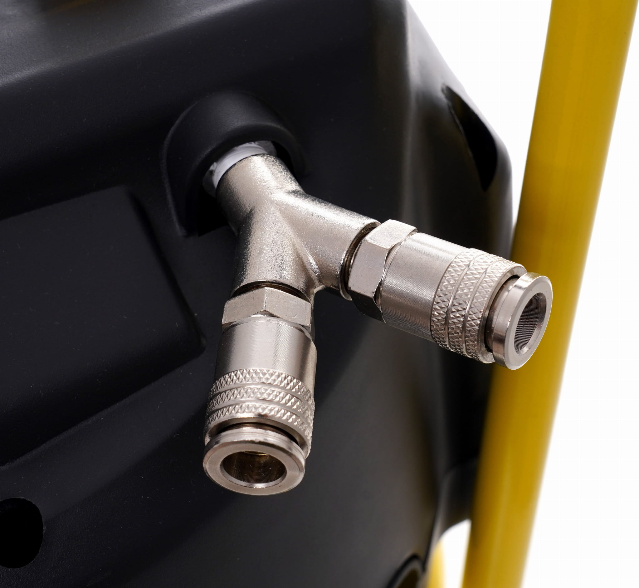 Głowica bezolejowa nie wymaga uzupełniania ani wymiany oleju. Przekłada się to na niższe koszty eksploatacji i mniejsze ryzyko zanieczyszczenia sprężonego powietrza oparami oleju — istotne przy pracach malarskich czy pompowaniu opon.