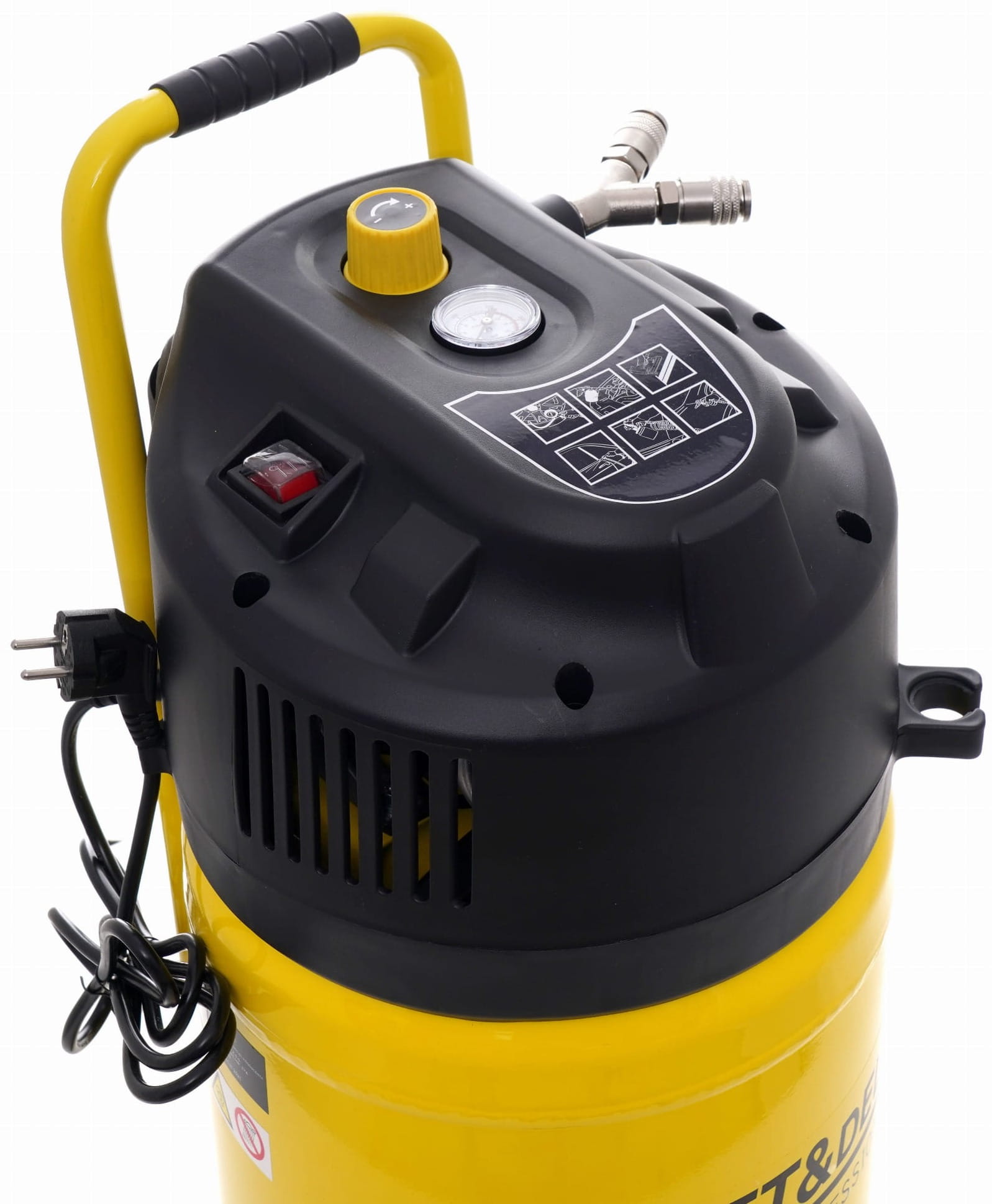 KD1417 to sprężarka bezolejowa z pionowym zbiornikiem 30 litrów, przeznaczona do prac warsztatowych, serwisowych i przydomowych. Bezolejowy układ sprężający eliminuje konieczność obsługi technicznej związanej z wymianą oleju, a pionowa obudowa zmniejsza powierzchnię zajmowaną przez urządzenie w porównaniu z konstrukcjami poziomymi o tej samej pojemności.