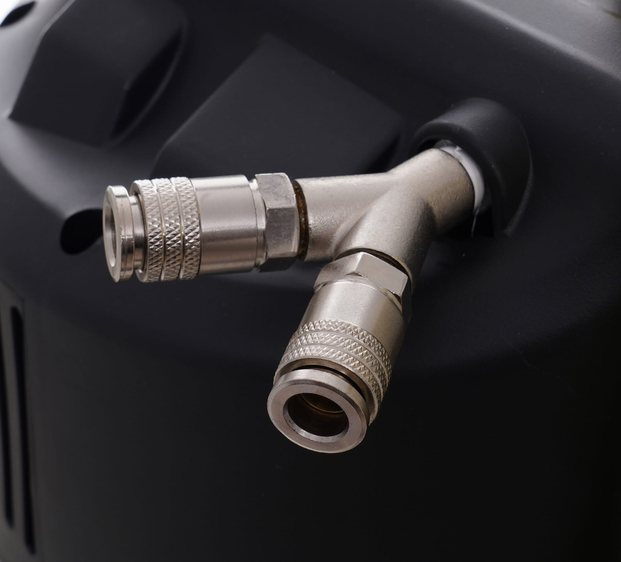 Głowica sprężarki pracuje bez oleju smarującego, co eliminuje konieczność regularnej wymiany lub uzupełniania oleju. Sprężone powietrze nie jest zanieczyszczone oparami oleju — ma to znaczenie przy pracach wymagających czystego medium, np. przy malowaniu natryskowym czy obsłudze narzędzi pneumatycznych wrażliwych na zanieczyszczenia.