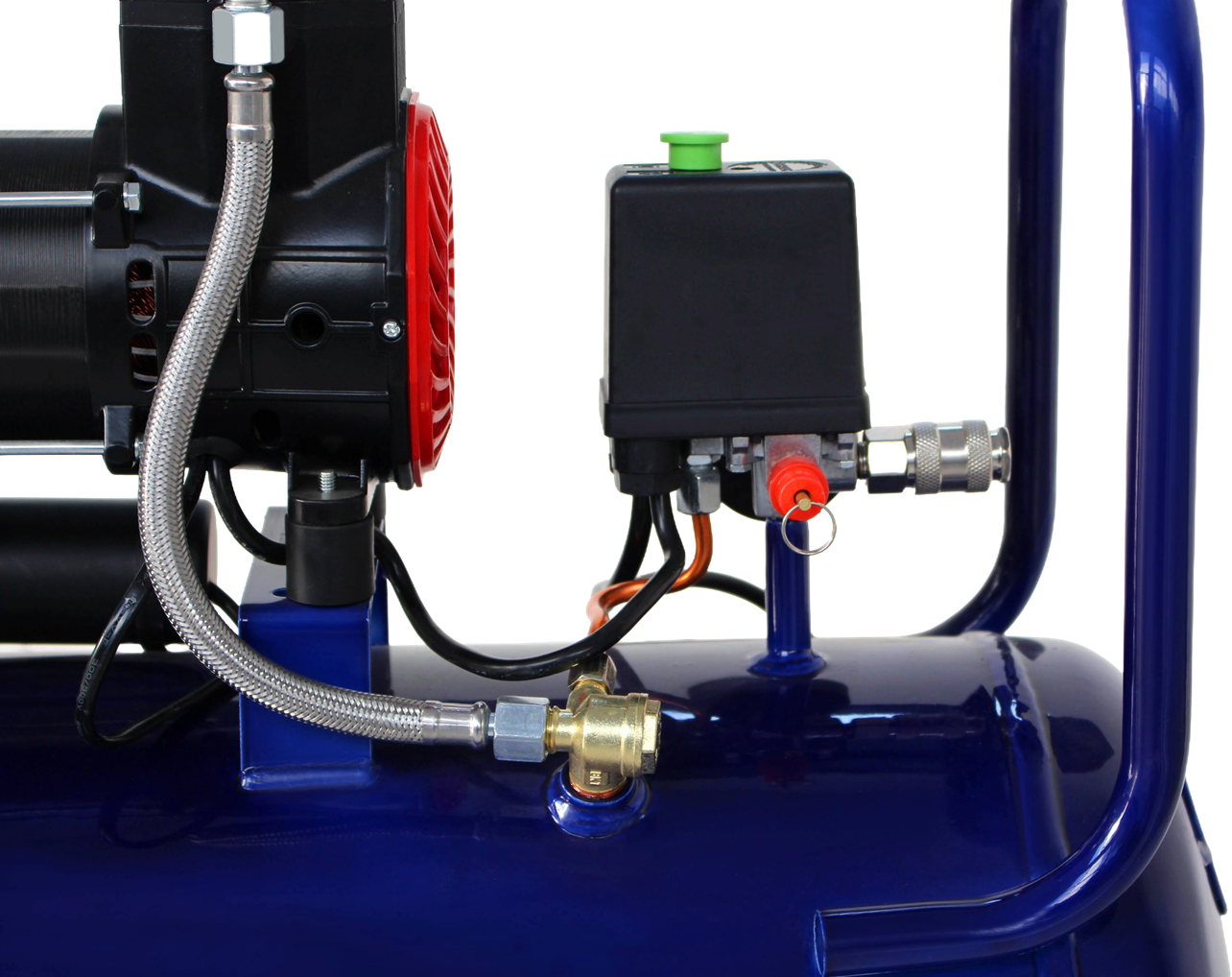 Głowica cylindra pracuje bez oleju smarującego — eliminuje to potrzebę wymiany oleju i stosowania filtrów olejowych. Powietrze tłoczone do zbiornika nie zawiera zanieczyszczeń olejowych, co ma znaczenie przy lakierowaniu, nadmuchiwaniu elementów wrażliwych na olej oraz w pracach precyzyjnych.