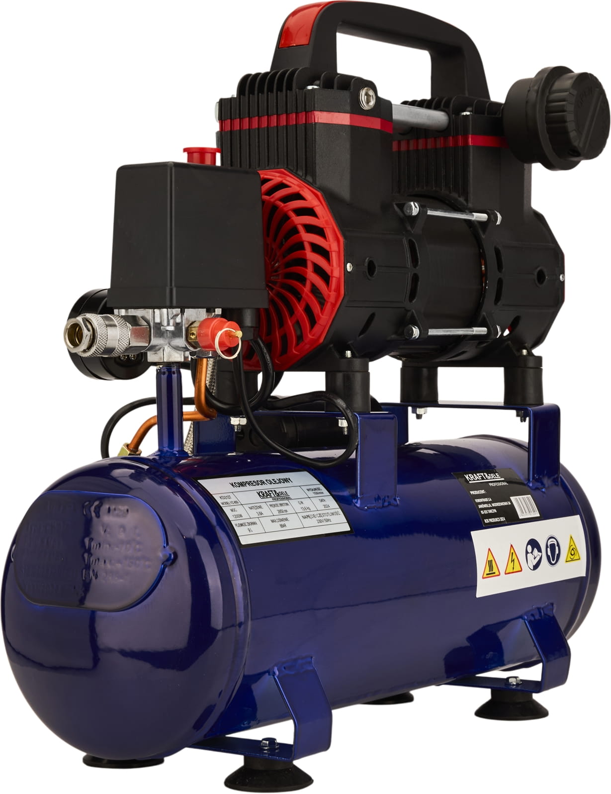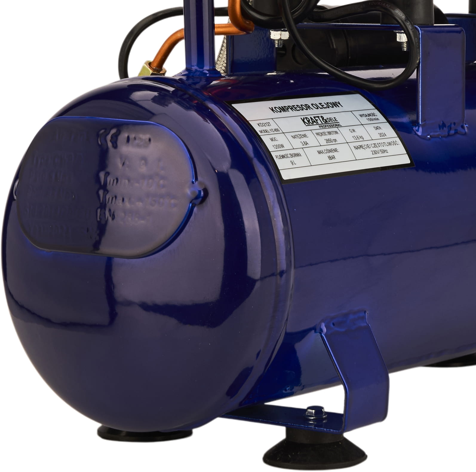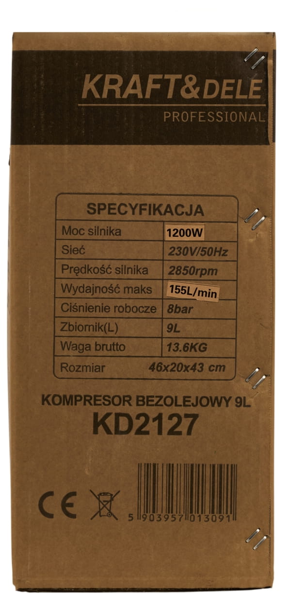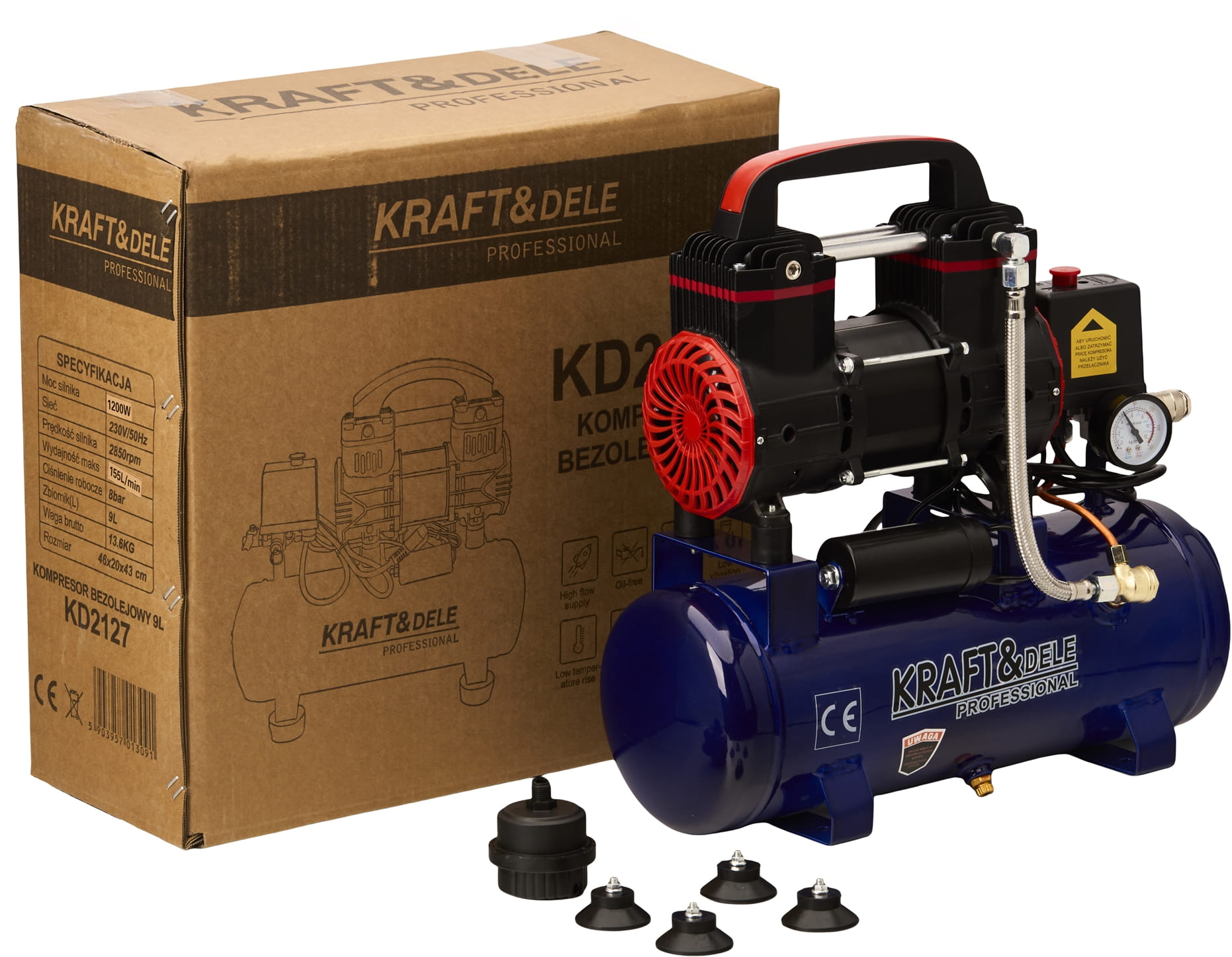 Kluczowym parametrem przy wyborze kompresora do narzędzi pneumatycznych jest wydajność podawana w litrach na minutę (L/min), a nie pojemność zbiornika. Zbiornik 9 L buforuje powietrze i zmniejsza liczbę cykli pracy silnika, jednak przy ciągłej pracy narzędzi o wysokim poborze (np. szlifierek kątowych pneumatycznych powyżej 200 L/min) kompresor KD2127 może nie nadążać z uzupełnianiem ciśnienia. Urządzenie jest przeznaczone do zastosowań przerywanych i narzędzi o poborze powietrza nieprzekraczającym wydajności sprężarki.