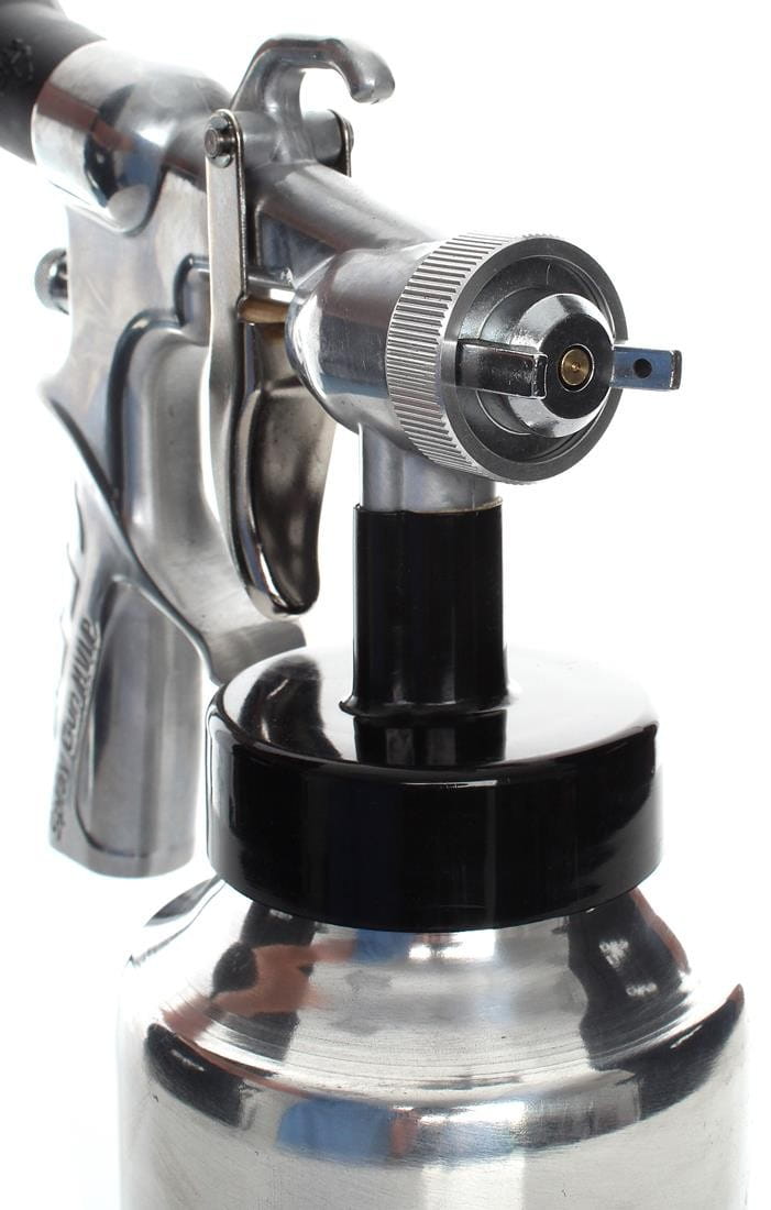 Ciśnienie na poziomie 0,15 bar klasyfikuje urządzenie jako malarkę turbinową (HVLP). Farba jest rozpylana przy niskim ciśnieniu, dzięki czemu mniej materiału unosi się w powietrzu jako mgła — większa część trafia bezpośrednio na malowaną powierzchnię. Przekłada się to na mniejsze zużycie farby i ograniczenie wdychania aerozolu podczas pracy.