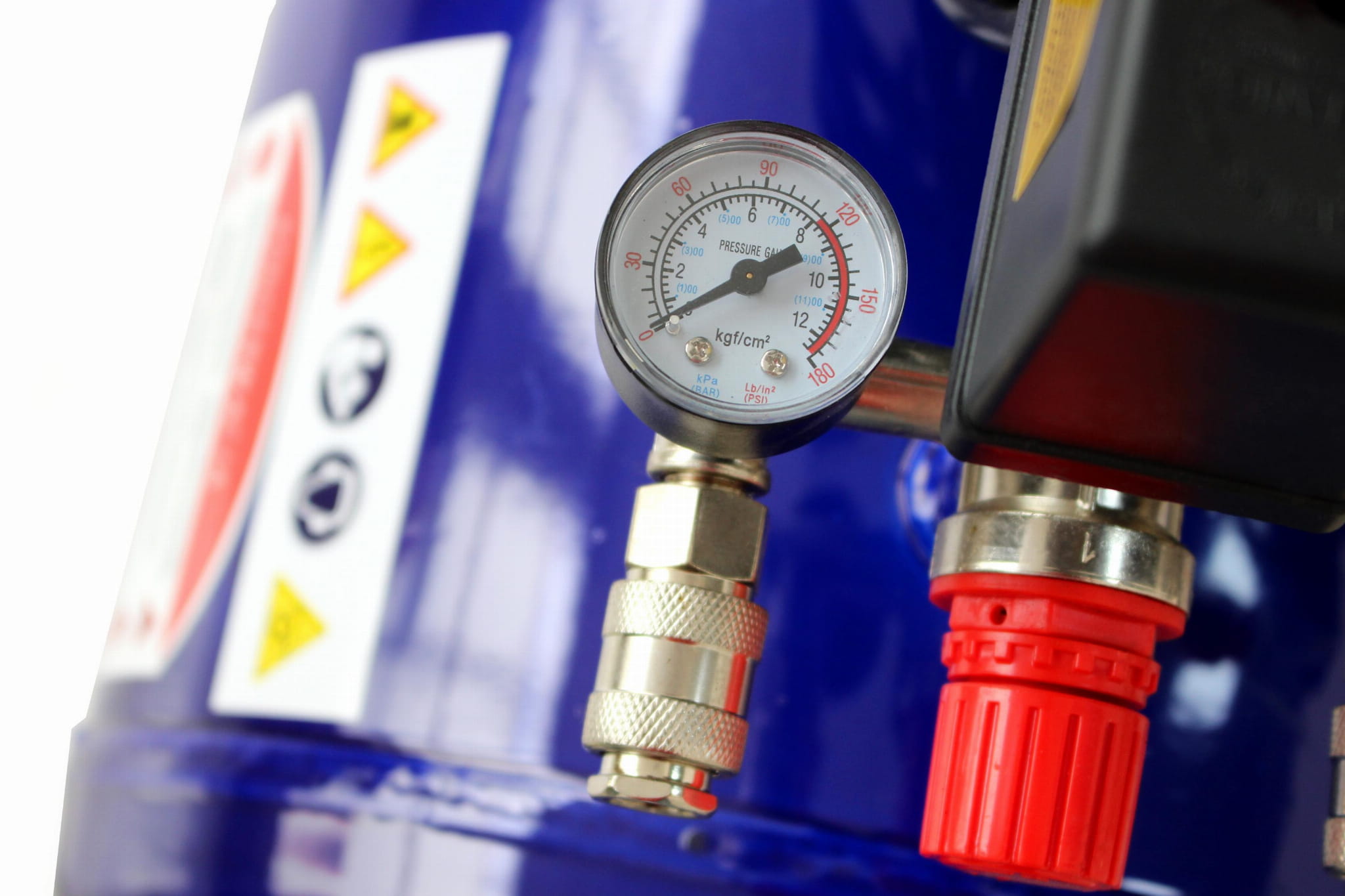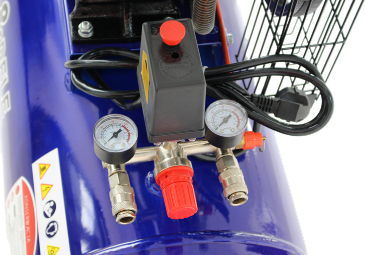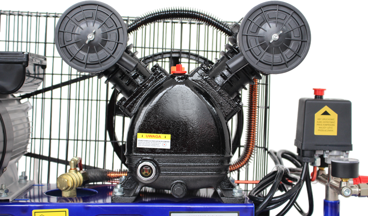 Pojemny zbiornik wydłuża cykl pracy urządzenia — kompresor rzadziej się załącza, co ogranicza zużycie silnika. Dwa niezależne manometry pozwalają jednocześnie odczytać ciśnienie w zbiorniku i ciśnienie na wyjściu roboczym, bez konieczności przeliczania wartości.