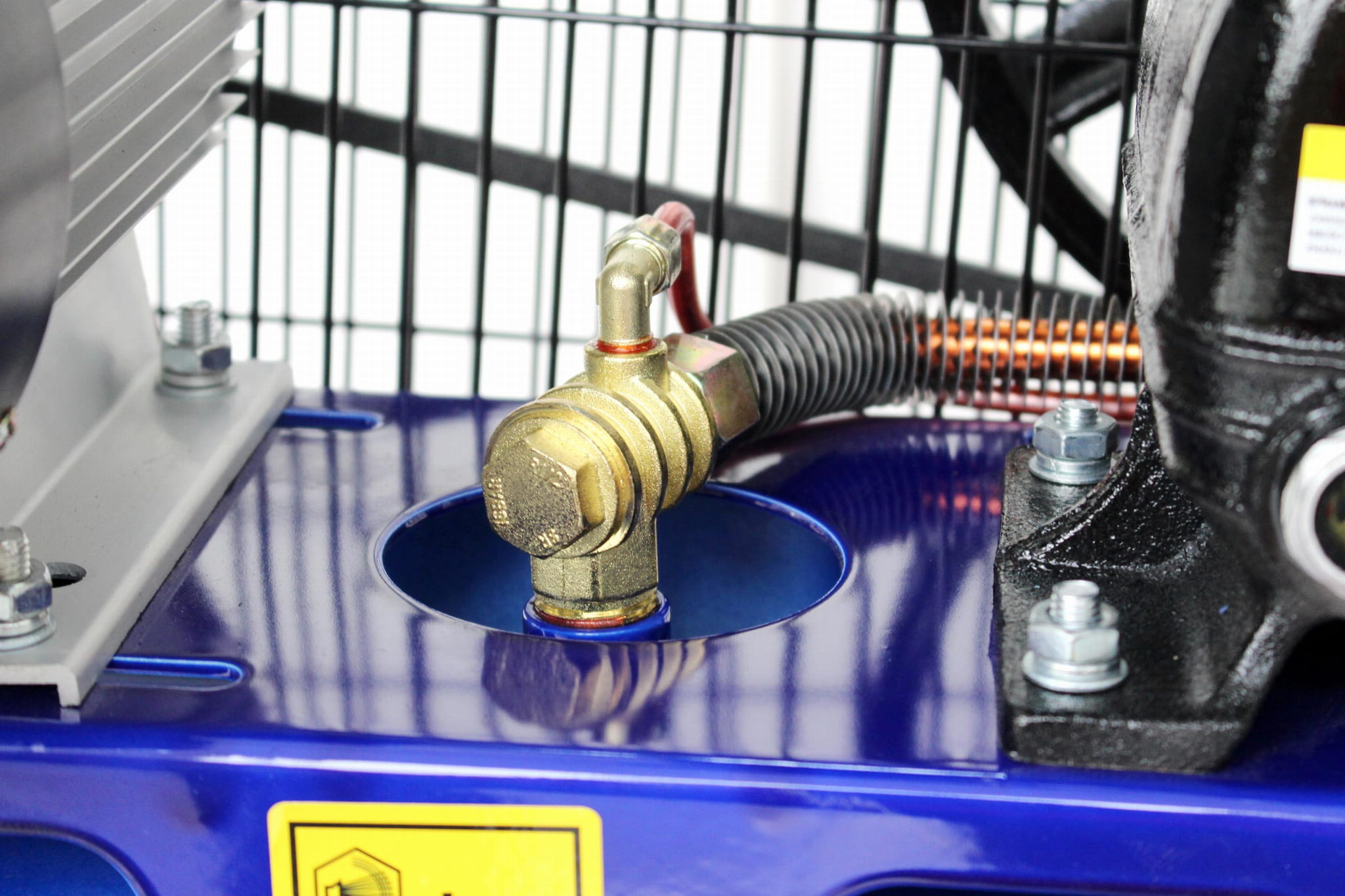 Kompresor pracuje na napięciu 220 V / 50 Hz i pobiera 9,44 A. Przed podłączeniem należy sprawdzić, czy obwód elektryczny w warsztacie jest zabezpieczony bezpiecznikiem o wartości co najmniej 16 A. Zalecane jest zasilanie z dedykowanego obwodu, bez rozgałęźników i przedłużaczy o zbyt małym przekroju przewodu.
