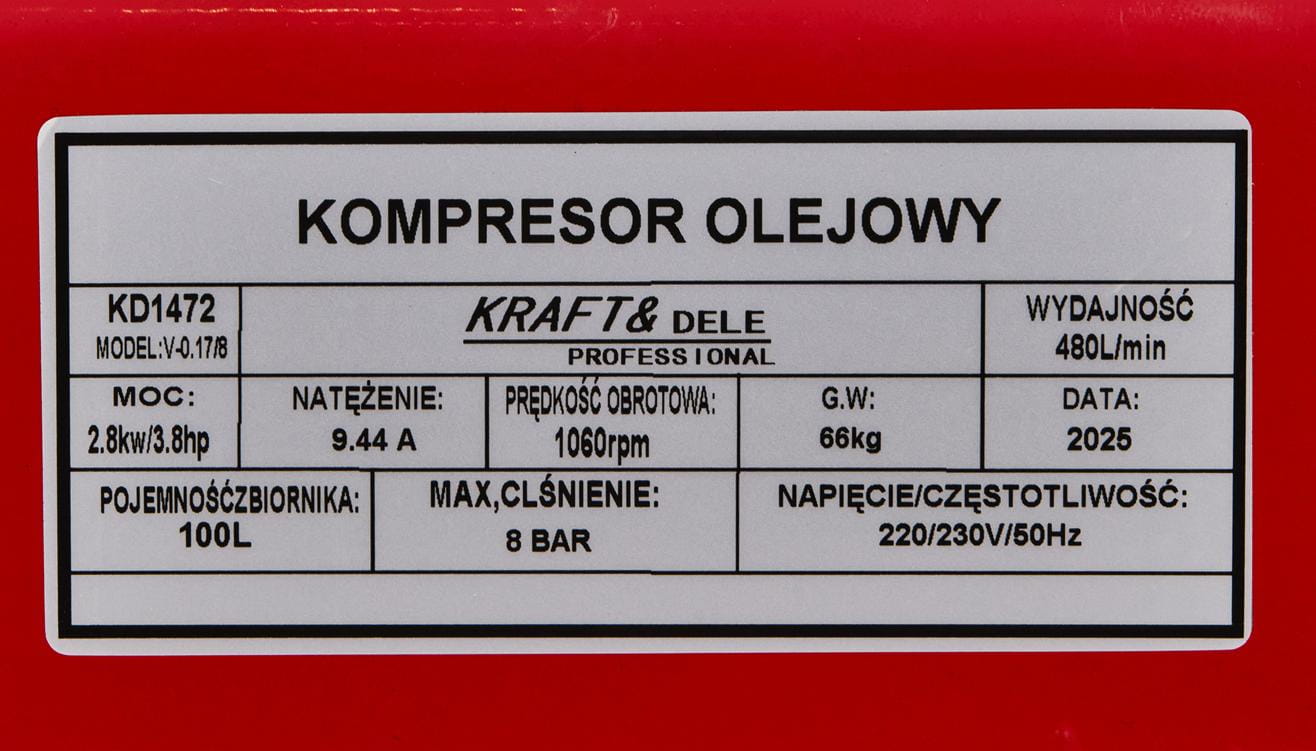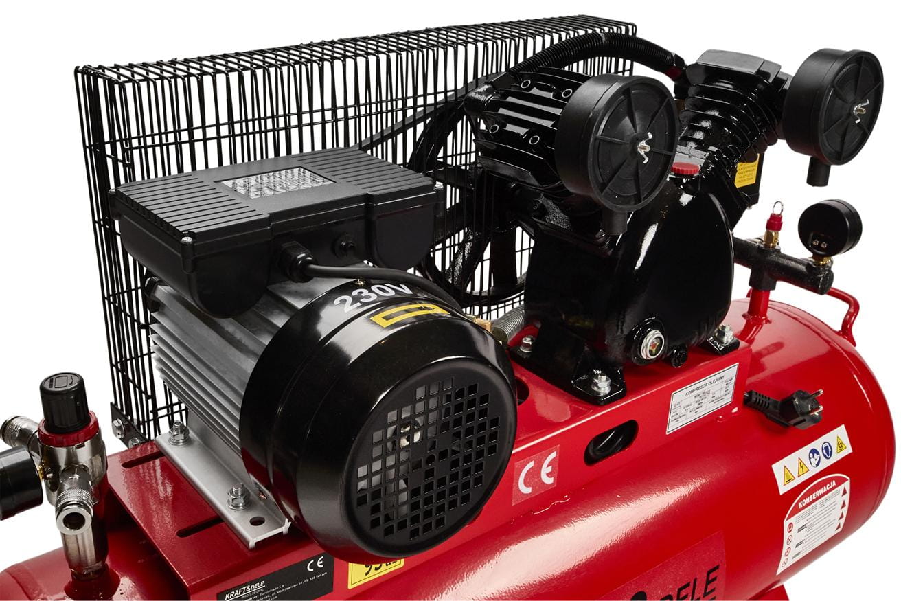 KD1472 to jednostopniowy kompresor olejowy z dwutłokowym układem sprężania, przeznaczony do zasilania narzędzi pneumatycznych w warsztacie samochodowym, stolarni lub podczas prac budowlanych. Zasilany z sieci 230V, oferuje wydajność efektywną 240 l/min przy ciśnieniu roboczym 8 bar — co pozwala na ciągłą pracę z większością pneumatycznych narzędzi ręcznych bez konieczności oczekiwania na uzupełnienie ciśnienia w zbiorniku.