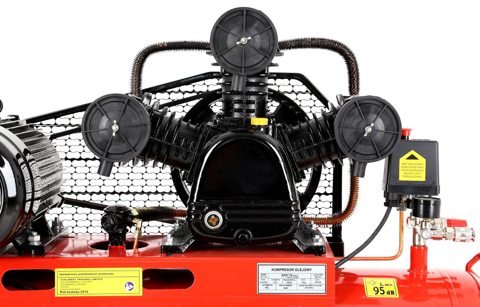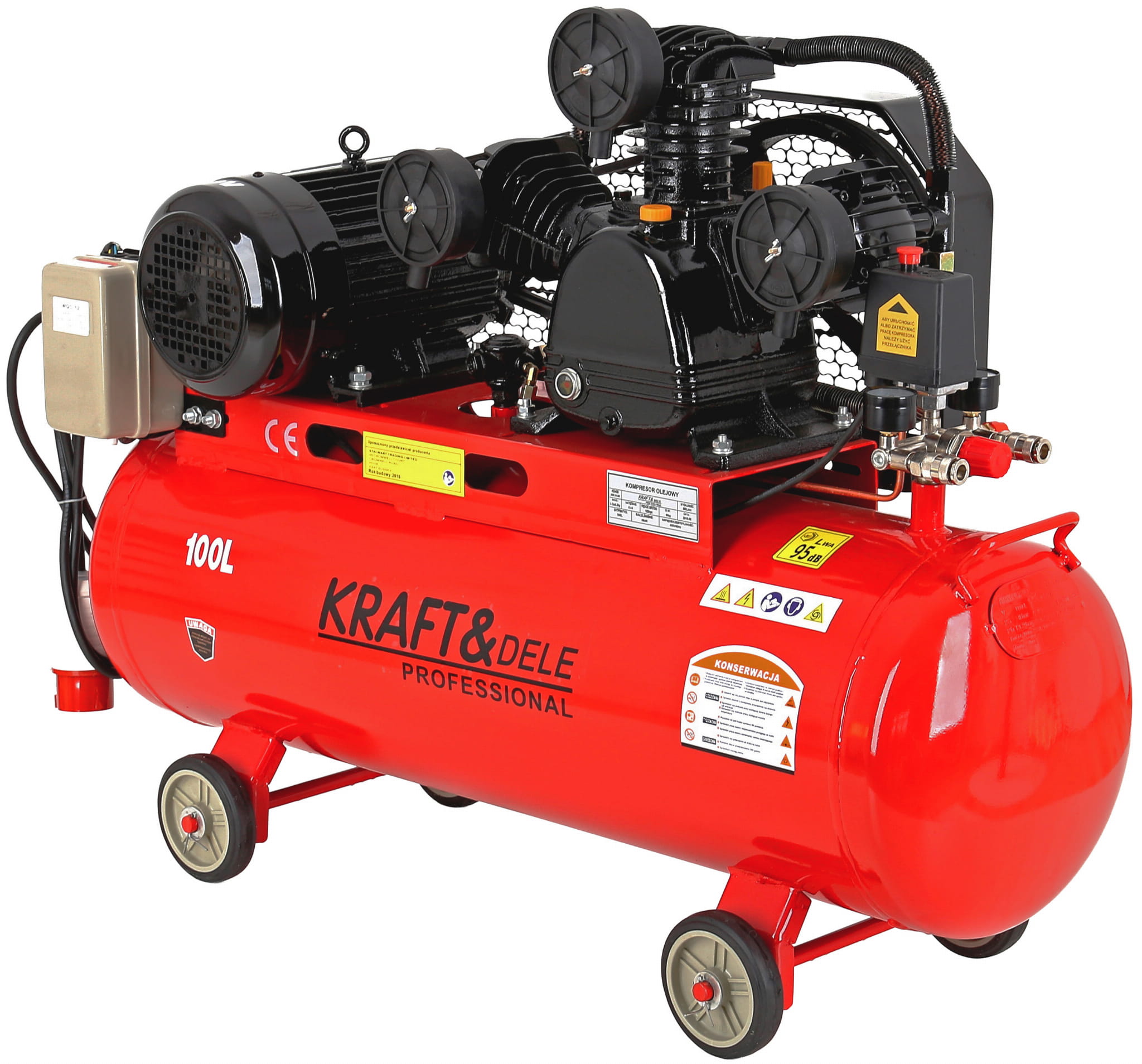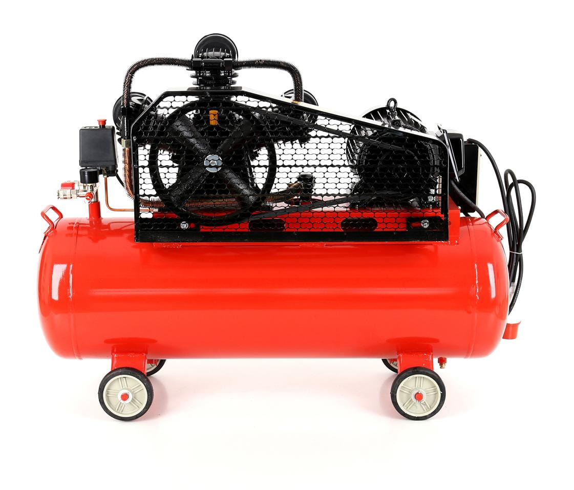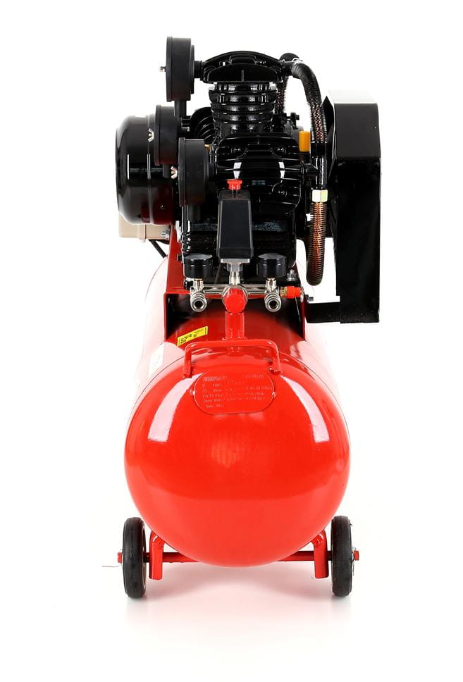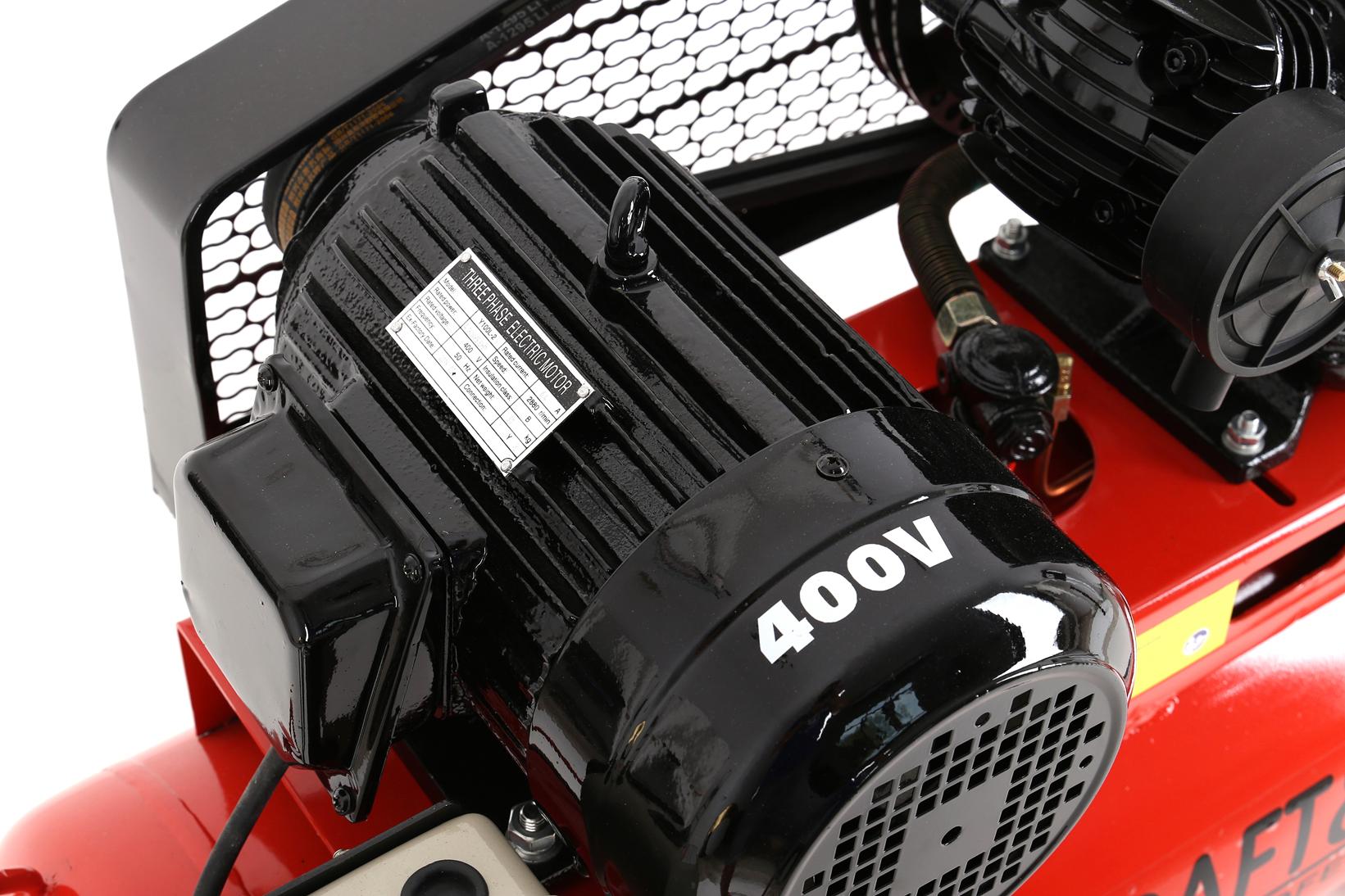 Trójtłokowy kompresor olejowy z butlą 100 litrów przeznaczony do intensywnej, ciągłej pracy w warsztacie, zakładzie produkcyjnym lub profesjonalnym garażu. Silnik indukcyjny o mocy 4,1 kW z napędem paskowym zapewnia wydajność zasysania na poziomie 650 l/min przy ciśnieniu roboczym 8 bar. Zasilanie trójfazowe 400V predysponuje to urządzenie do środowisk przemysłowych i warsztatowych dysponujących odpowiednią instalacją elektryczną.