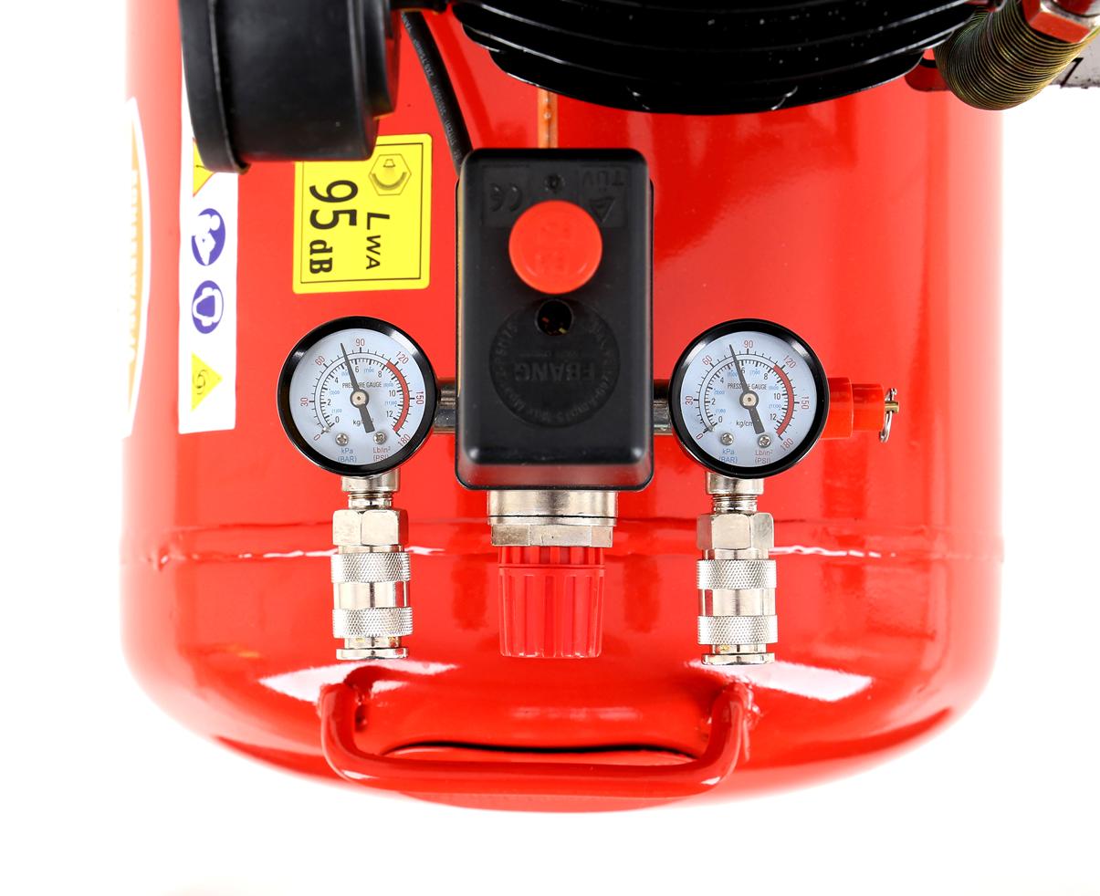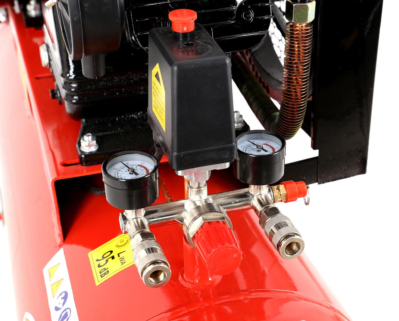 Kompresor wyposażono w dwa manometry zwrócone ku górze — jeden wskazuje ciśnienie w butli, drugi ciśnienie na wyjściu po reduktorze. Reduktor pozwala na płynną regulację ciśnienia roboczego dostosowaną do wymagań konkretnego narzędzia. Dwa szybkozłącza umożliwiają jednoczesne podłączenie dwóch odbiorników.