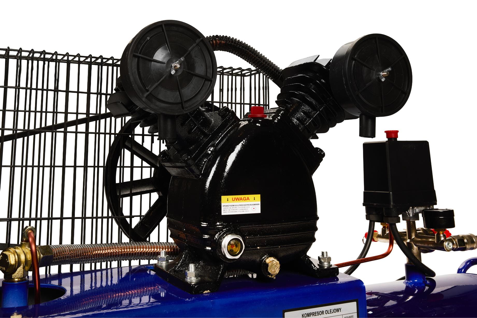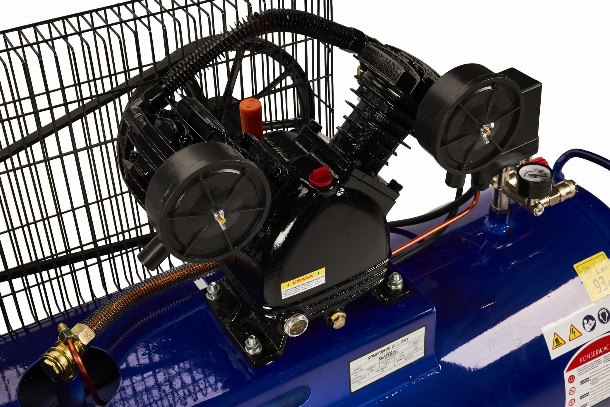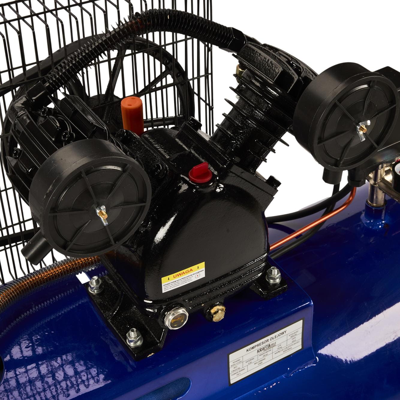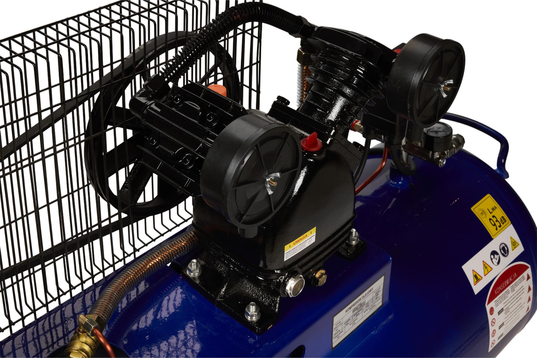 Kompresor olejowy wymaga regularnej kontroli poziomu oleju sprężarkowego przed każdym uruchomieniem. Producent zaleca stosowanie oleju przeznaczonego dedykowanego do sprężarek tłokowych — stosowanie oleju silnikowego może skrócić żywotność uszczelnień i zaworów. Filtr powietrza (w zestawie dwa sztuki) należy czyścić lub wymieniać zgodnie z intensywnością użytkowania i stopniem zapylenia otoczenia.