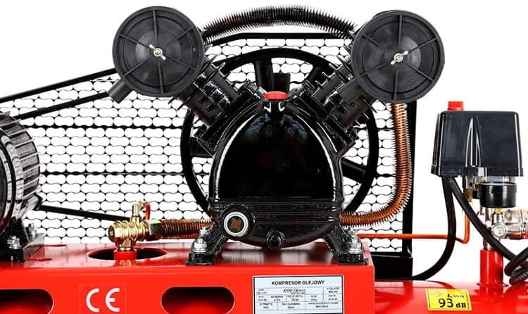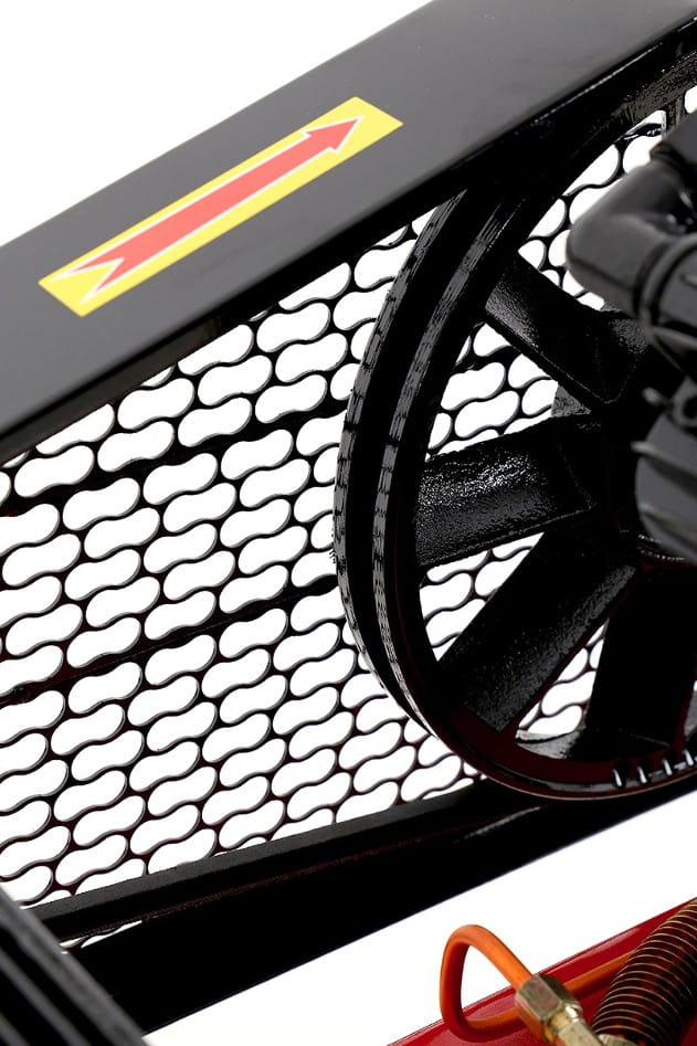 Przekładnia pasowa między silnikiem a głowicą sprężającą redukuje prędkość obrotową tłoków poniżej prędkości silnika. Niższe obroty głowicy oznaczają mniejsze ciepło tarcia, cichszą pracę i dłuższą żywotność uszczelnień oraz łożysk.