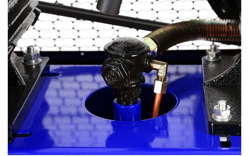 Kranik spustowy umieszczony na dole zbiornika służy do regularnego odprowadzania kondensatu – skroplonej wody, która gromadzi się podczas pracy. Zalegający kondensat przyspiesza korozję zbiornika, dlatego zaleca się jego usuwanie po każdym dłuższym cyklu pracy lub co najmniej raz dziennie przy intensywnej eksploatacji.