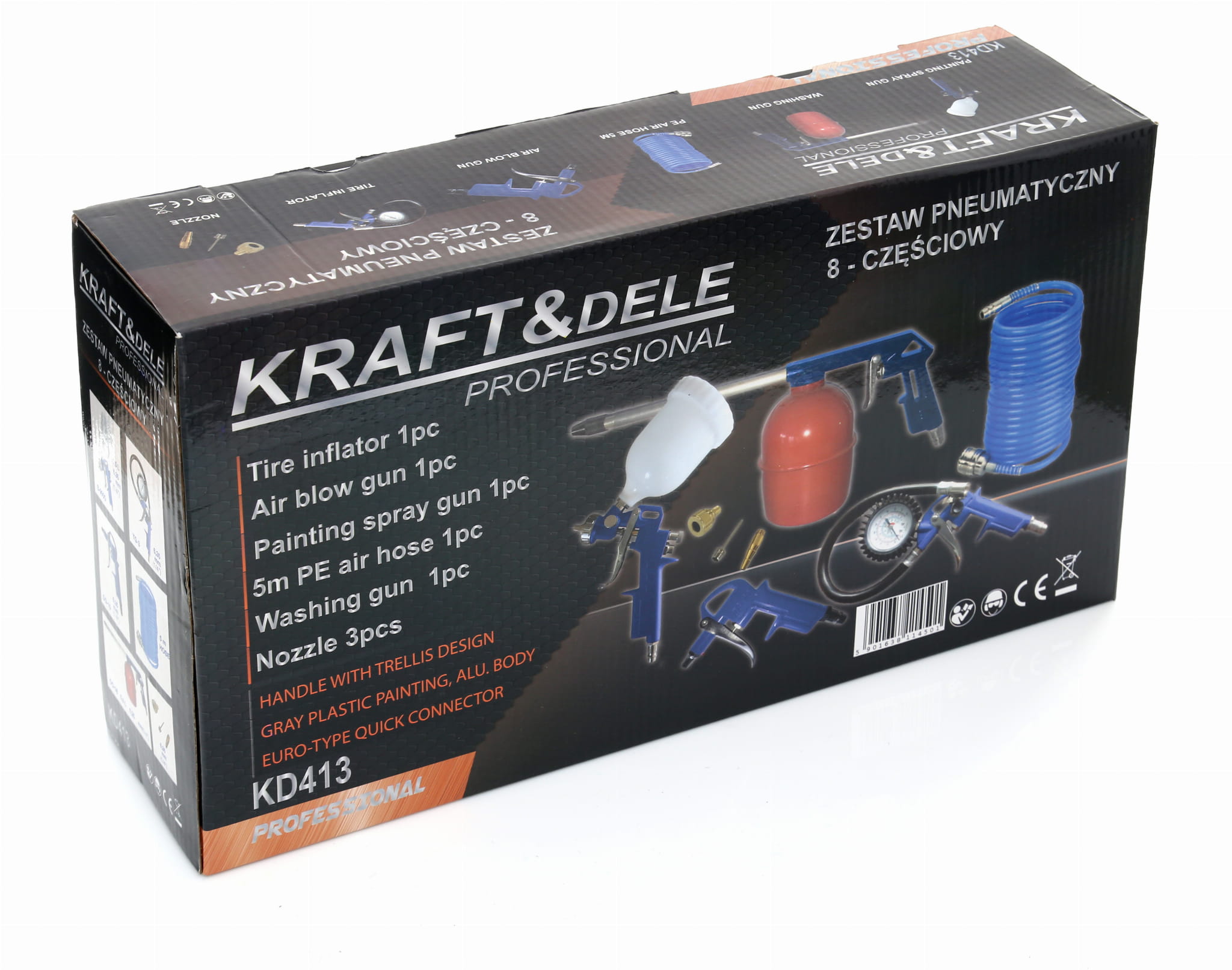 Kompresor dostarczany jest wraz z zestawem ośmiu akcesoriów pneumatycznych, które umożliwiają natychmiastowe rozpoczęcie pracy bez konieczności dokupowania dodatkowego wyposażenia.