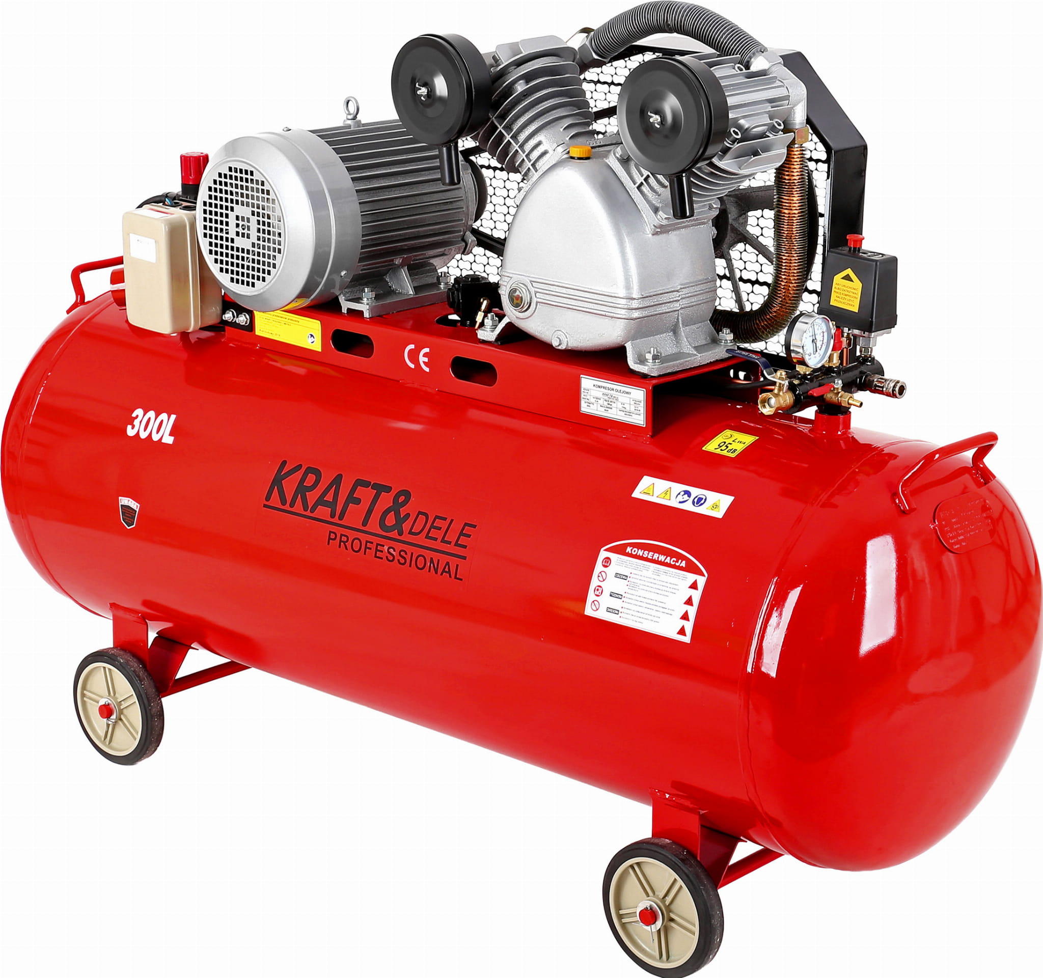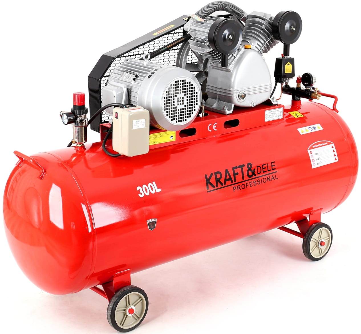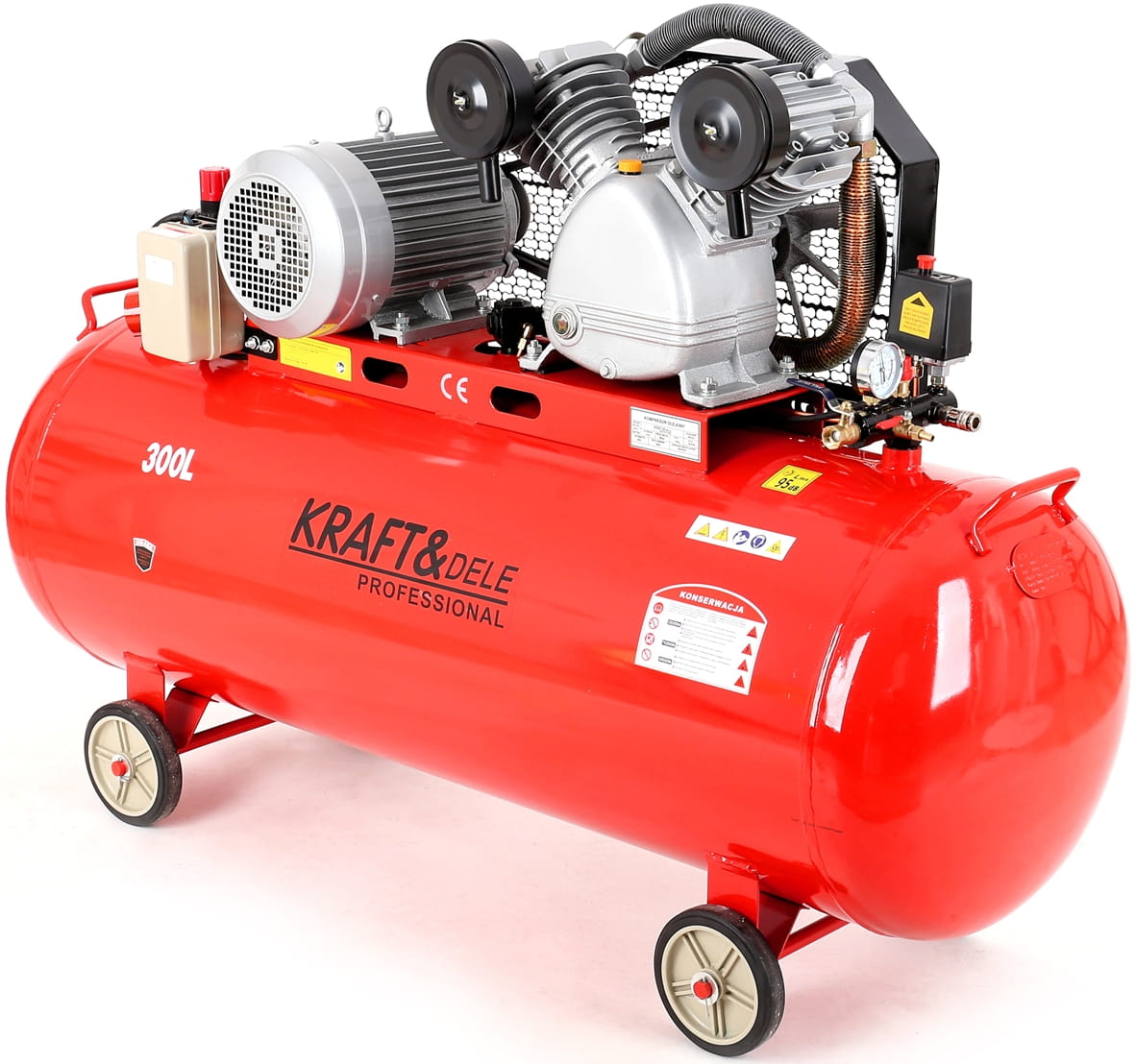 KD1410 to przemysłowy kompresor olejowy z dwutłokową pompą i zbiornikiem 300 litrów, przeznaczony do ciągłej pracy w warsztatach, halach produkcyjnych i zakładach usługowych. Zasilanie trójfazowe 400V oraz moc 5,5 kW (7,5 KM) pozwalają na obsługę wymagających narzędzi pneumatycznych bez ograniczeń wydajnościowych.