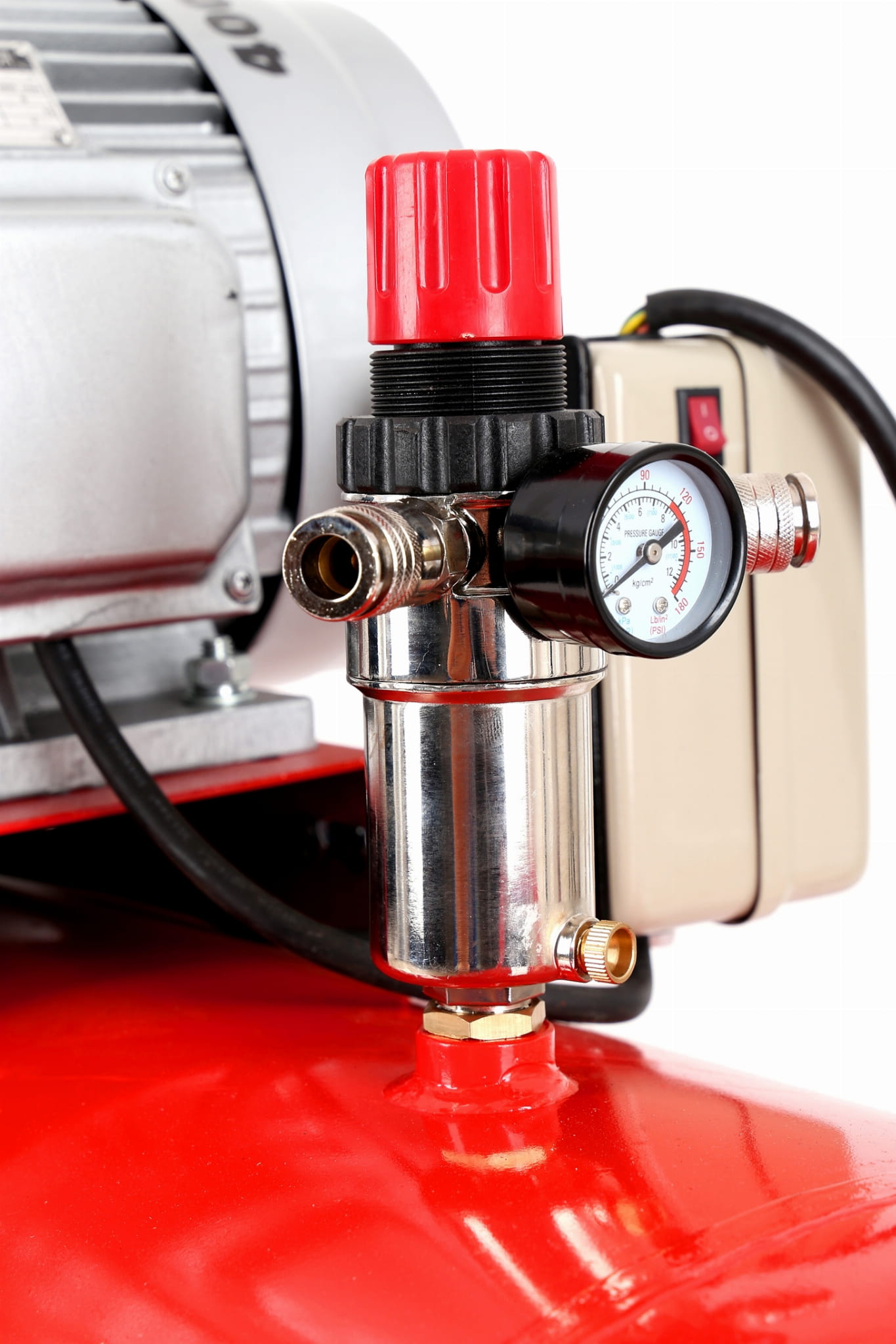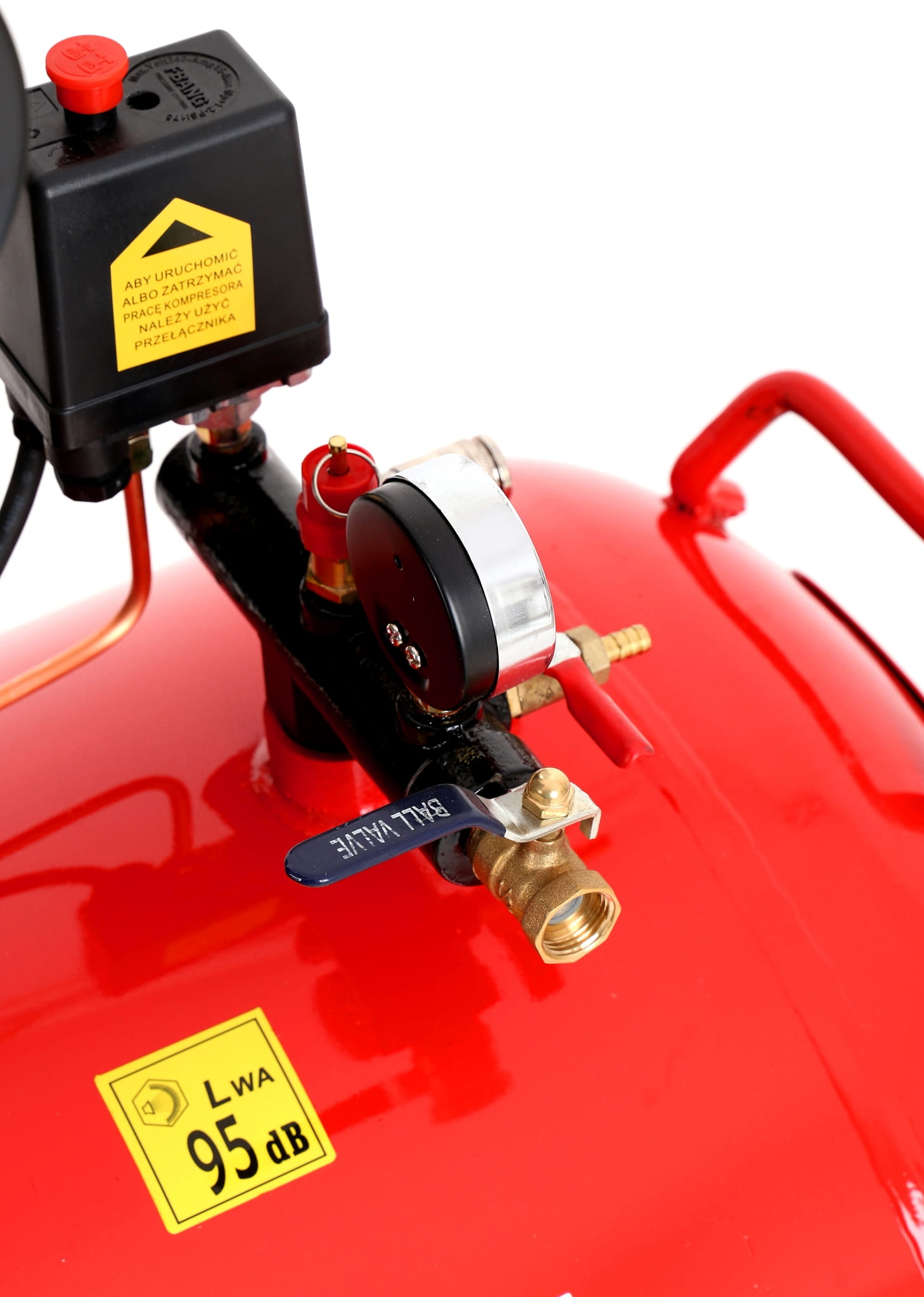 Wbudowany reduktor pozwala ustawić ciśnienie wyjściowe niezależnie od ciśnienia w zbiorniku. Dwa manometry skierowane ku górze umożliwiają jednoczesny odczyt ciśnienia w zbiorniku i na wyjściu — bez konieczności schylania się lub zmiany pozycji podczas pracy.