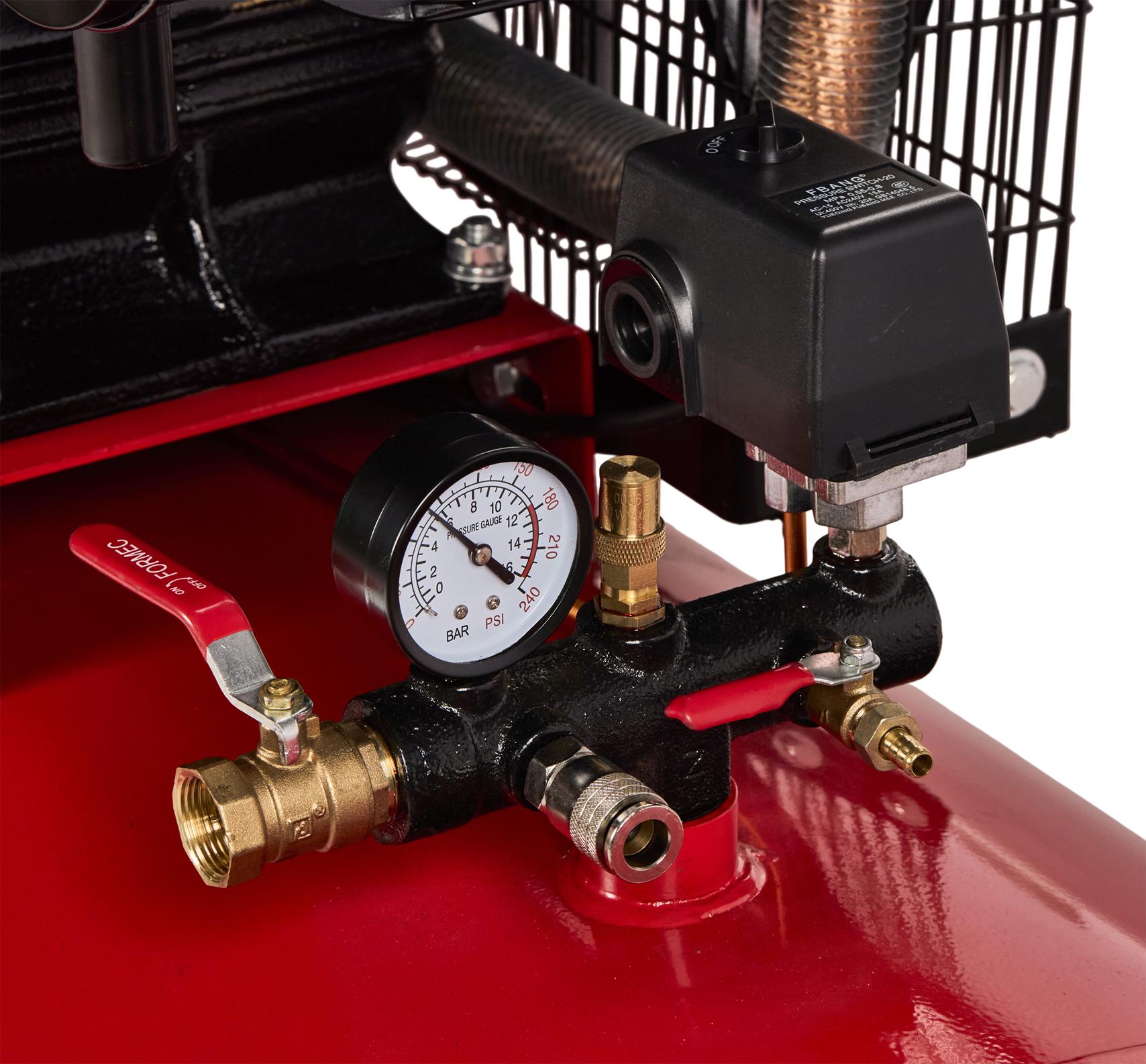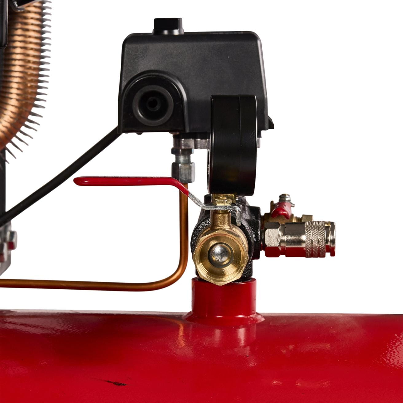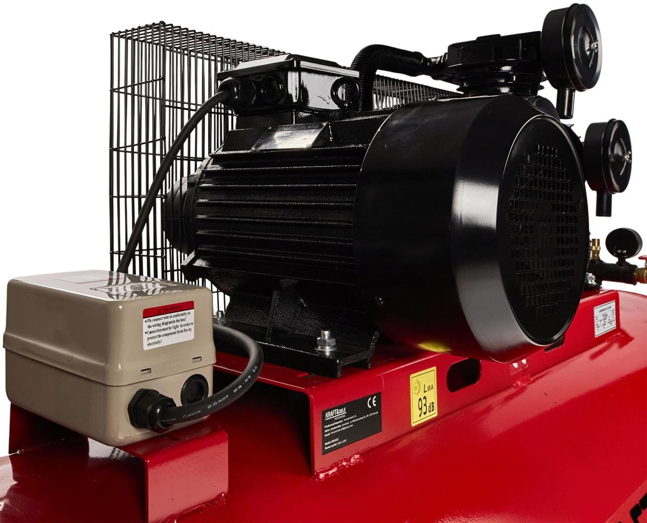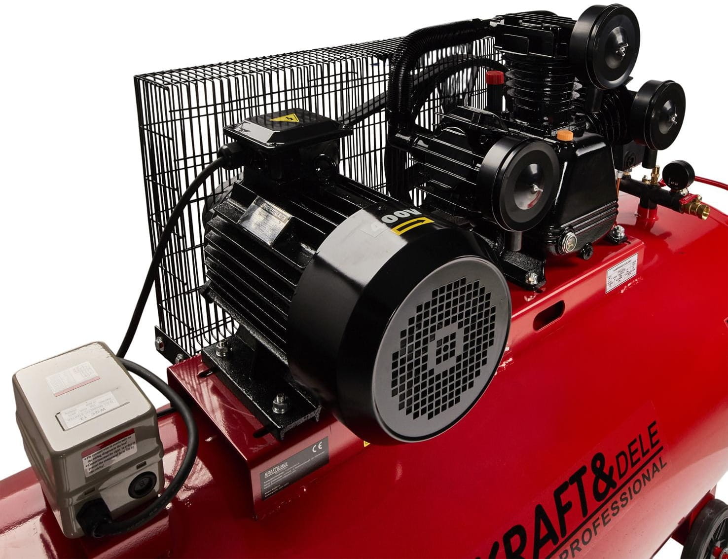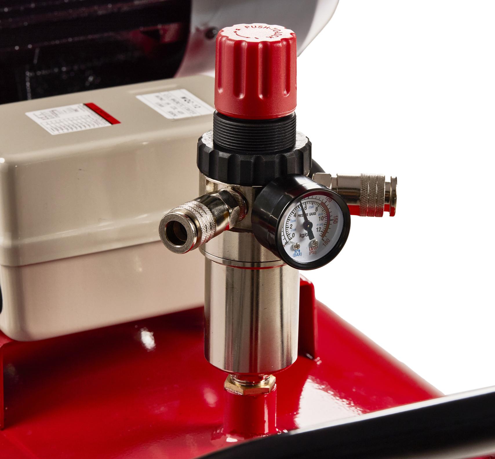 Presostat automatycznie wyłącza silnik po osiągnięciu maksymalnego ciśnienia roboczego i ponownie uruchamia go przy spadku poniżej wartości minimalnej. Wbudowane zabezpieczenie przed przeciążeniem chroni uzwojenia silnika przy skokach napięcia lub nadmiernym obciążeniu.