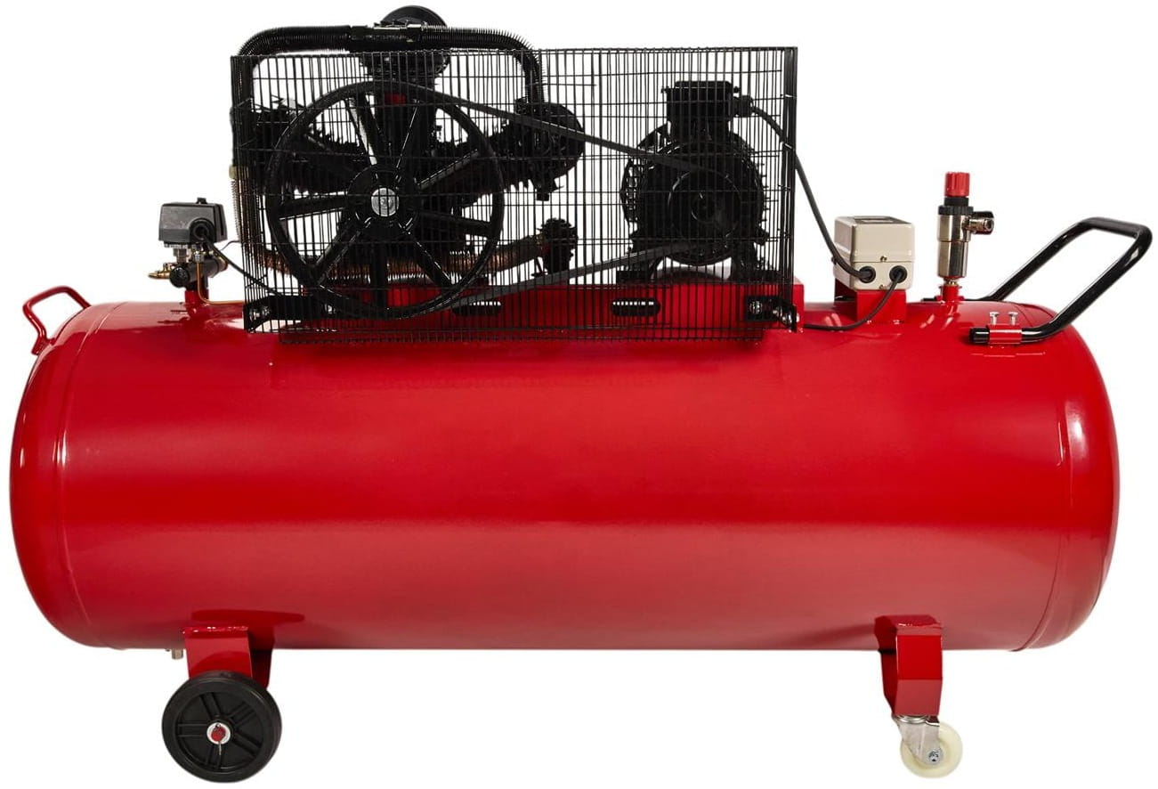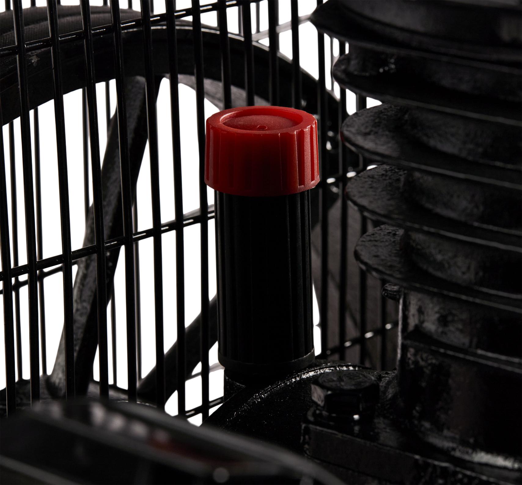 Duża pojemność zbiornika wydłuża czas pracy między kolejnymi cyklami załączania silnika, zmniejszając jego zużycie. Prędkość obrotowa 900 rpm jest znacznie niższa niż w kompresach małogabarytowych (1450–2850 rpm), co ogranicza hałas, wibracje i nagrzewanie się podzespołów.