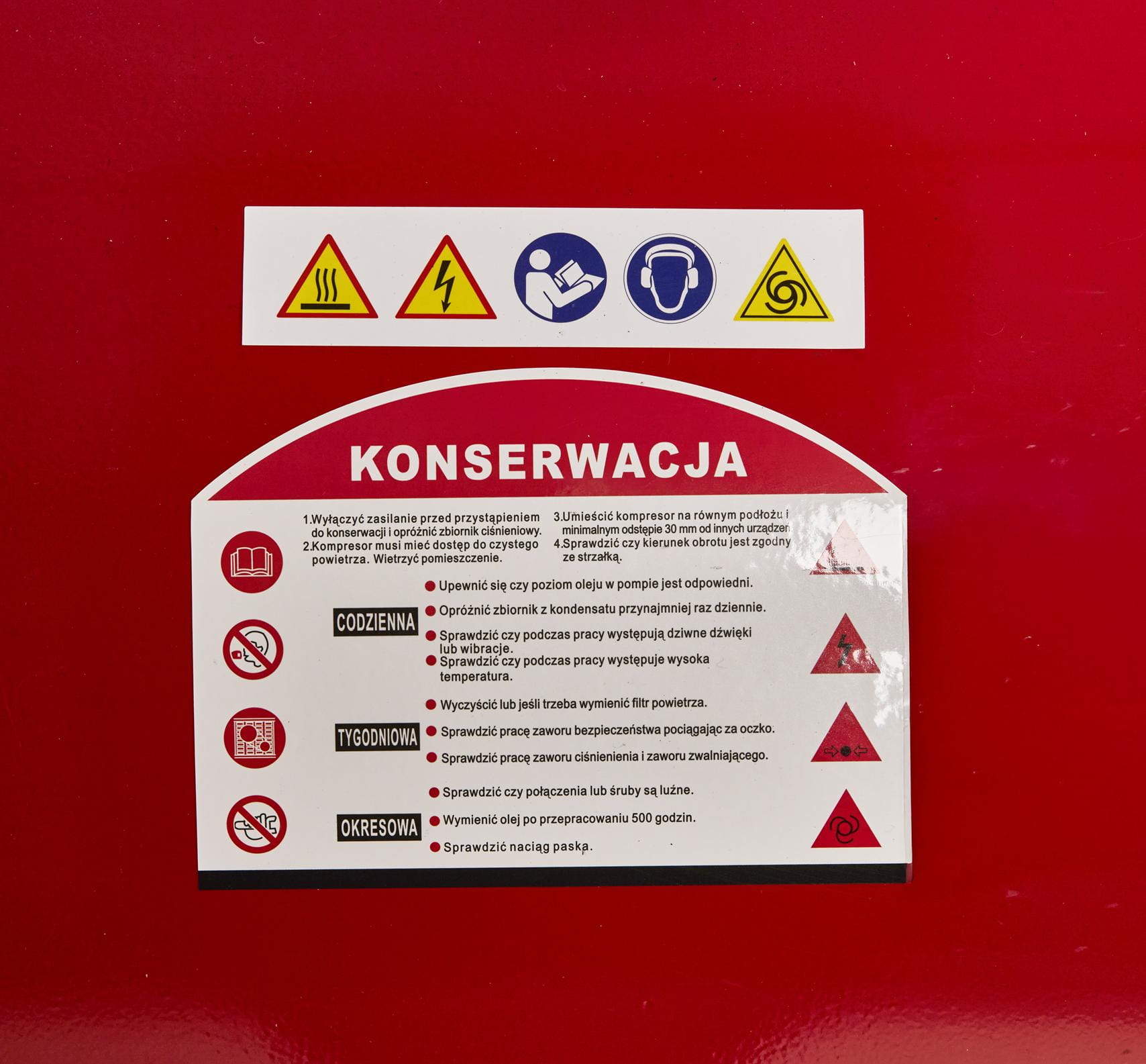 Kompresor olejowy wymaga regularnej kontroli i wymiany oleju sprężarkowego — przy intensywnej eksploatacji przemysłowej zaleca się wymianę co 500 godzin pracy lub zgodnie z zaleceniami producenta zawartymi w instrukcji. Filtr powietrza należy czyścić lub wymieniać w zależności od zapylenia środowiska pracy. Po każdej sesji roboczej wskazane jest spuszczenie skroplonej wody ze zbiornika przez zawór spustowy — zapobiega to korozji wewnętrznej i przedłuża żywotność zbiornika.