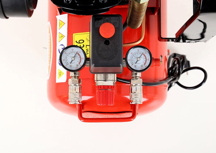 Wbudowany reduktor umożliwia ustawienie ciśnienia roboczego niezależnie od ciśnienia w zbiorniku (maksymalnie 8 bar). Dwa manometry — jeden wskazujący ciśnienie w zbiorniku, drugi ciśnienie na wyjściu — pozwalają na bieżącą kontrolę pracy urządzenia bez konieczności szacowania parametrów.