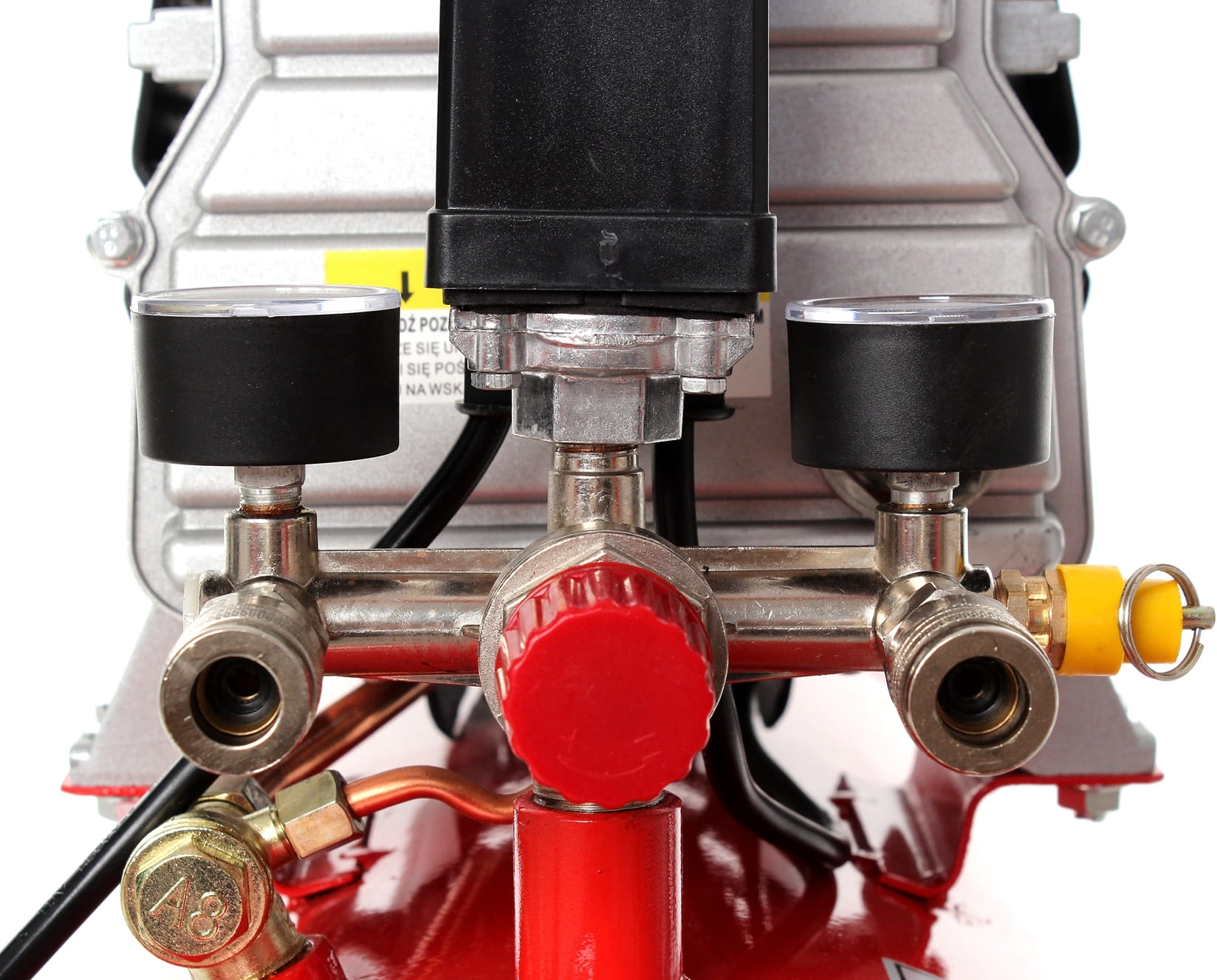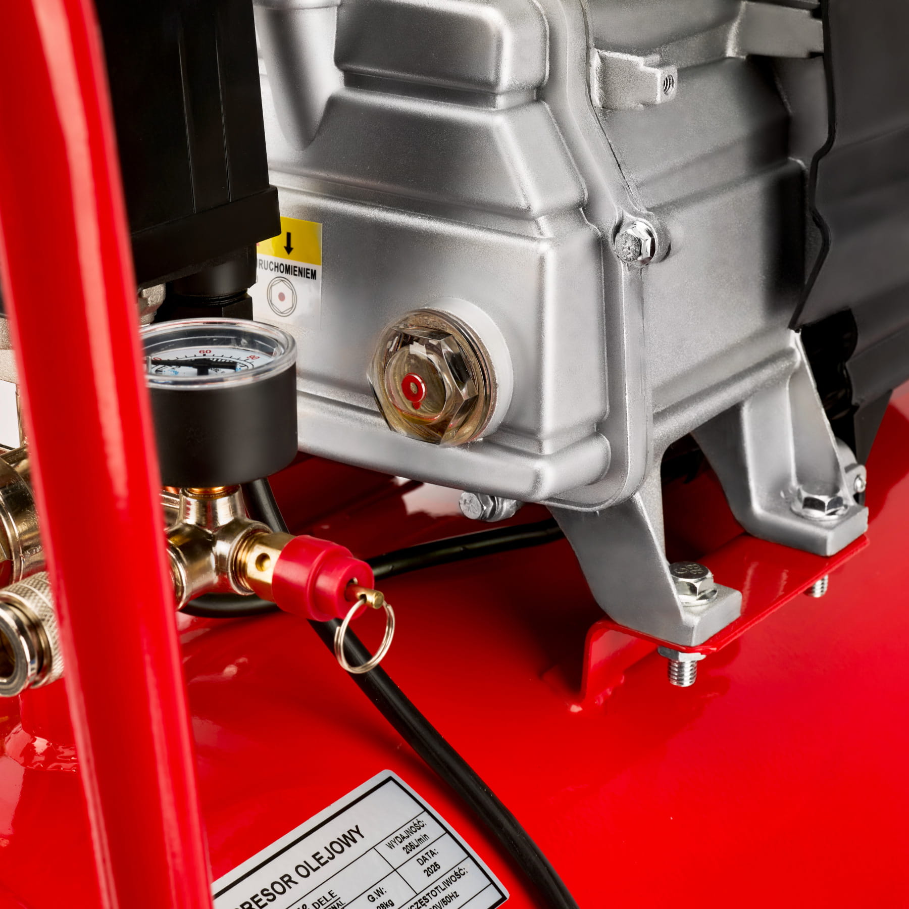 Jednotłokowy silnik elektryczny o mocy 2,8 kW zasilany napięciem 230 V pracuje z prędkością 2880 obrotów na minutę. Smarowanie olejowe układu tłokowego przedłuża żywotność kompresorów tej klasy w porównaniu do modeli bezolejowych, jednocześnie zapewniając stabilną pracę przy intensywnym użytkowaniu.