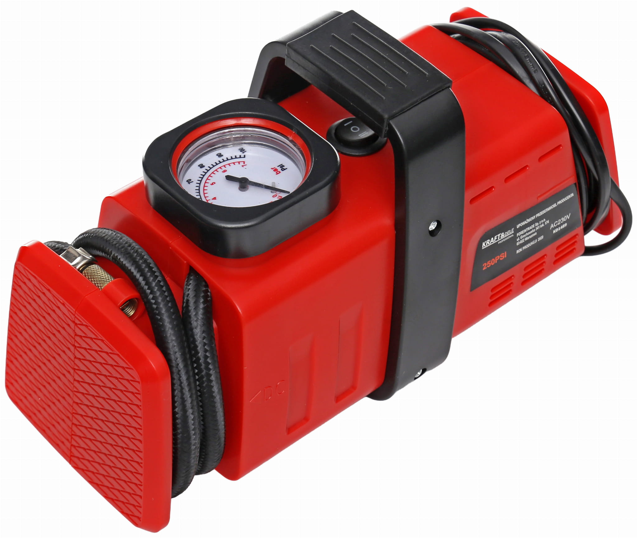Przenośny kompresor elektryczny przystosowany do zasilania zarówno z gniazda zapalniczki samochodowej (12V DC), jak i ze standardowego gniazdka sieciowego (230V AC). Umożliwia pompowanie opon osobowych bez konieczności demontażu koła, a wbudowany manometr pozwala na bieżąco kontrolować ciśnienie podczas pompowania.