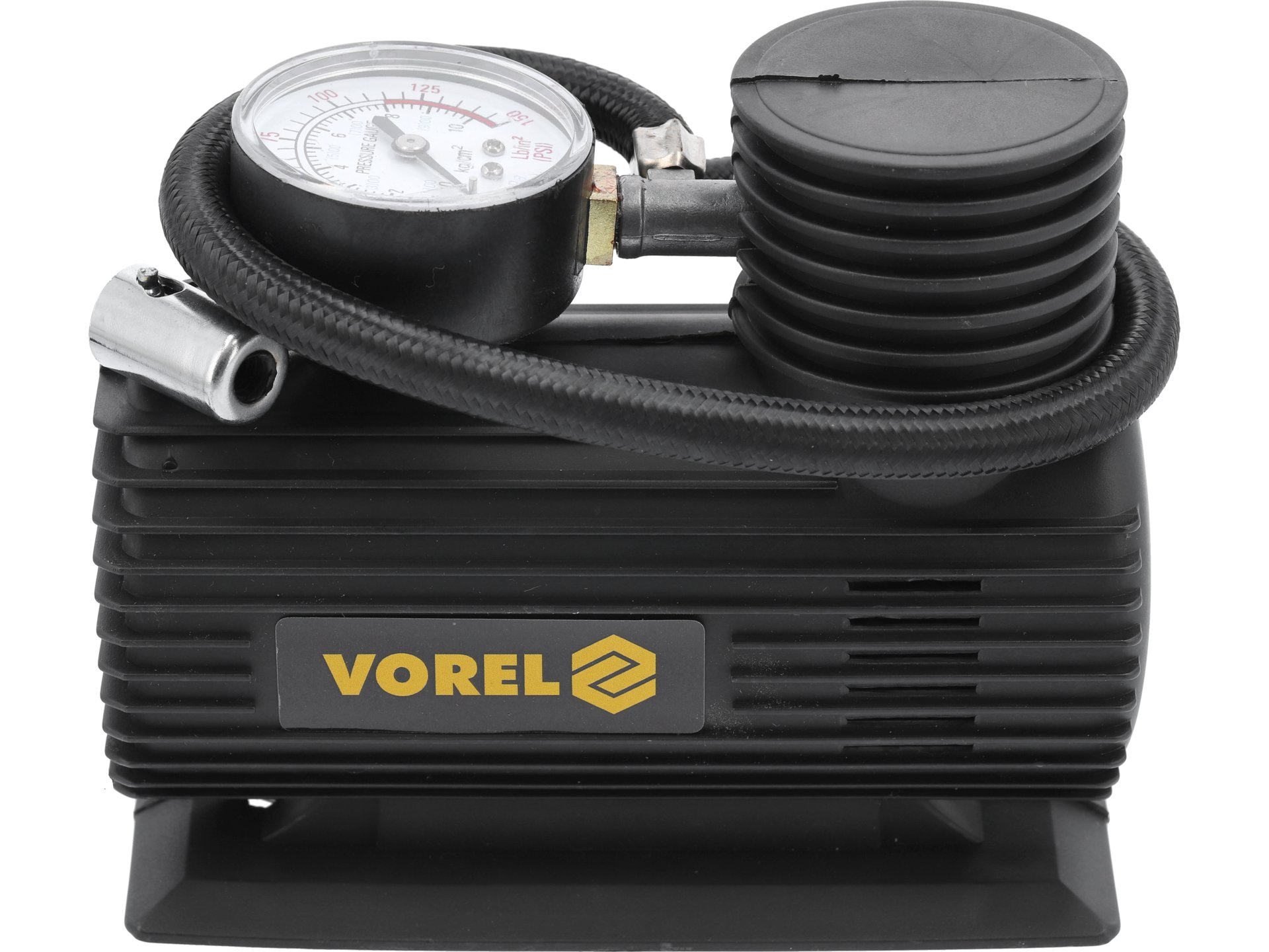 Przenośny kompresor samochodowy zasilany z gniazda zapalniczki 12V, przeznaczony do pompowania opon samochodowych oraz akcesoriów sportowych i rekreacyjnych. Kompaktowa konstrukcja umożliwia przechowywanie w bagażniku pojazdu.