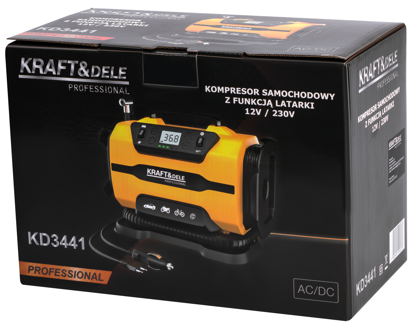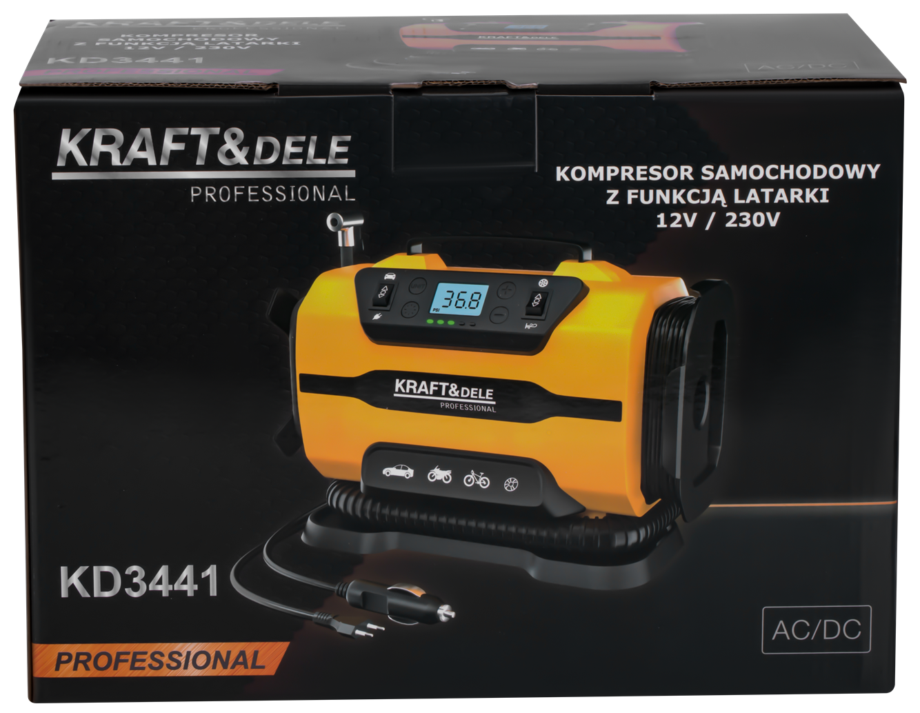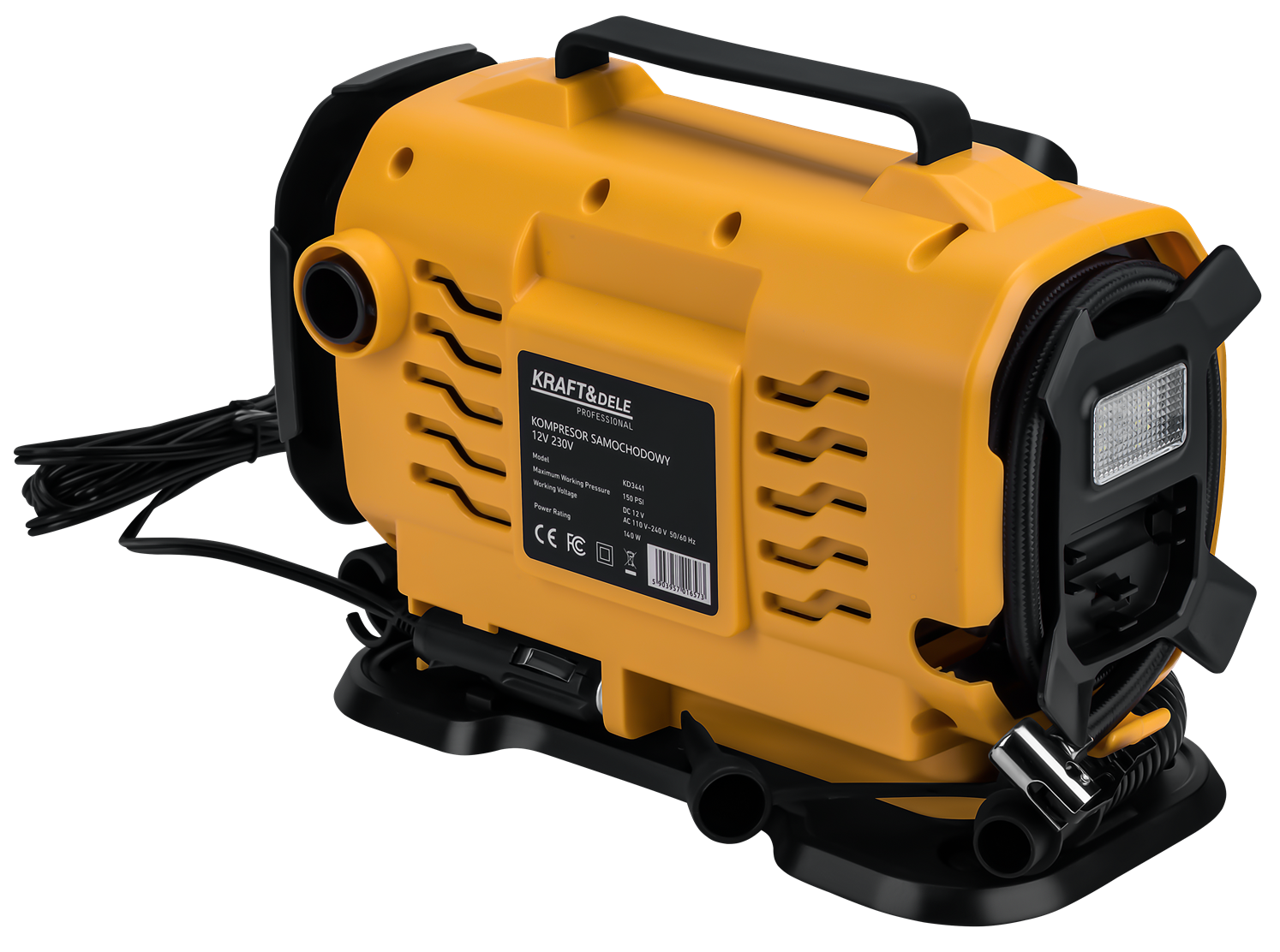 KD3441 to przenośny kompresor tłokowy z podwójnym zasilaniem: 12V DC z gniazda zapalniczki samochodowej oraz 230V AC z sieci domowej. Urządzenie umożliwia pompowanie opon, materacy, piłek i innych przedmiotów nadmuchiwanych, a wbudowana latarka LED rozszerza możliwości pracy przy ograniczonej widoczności.